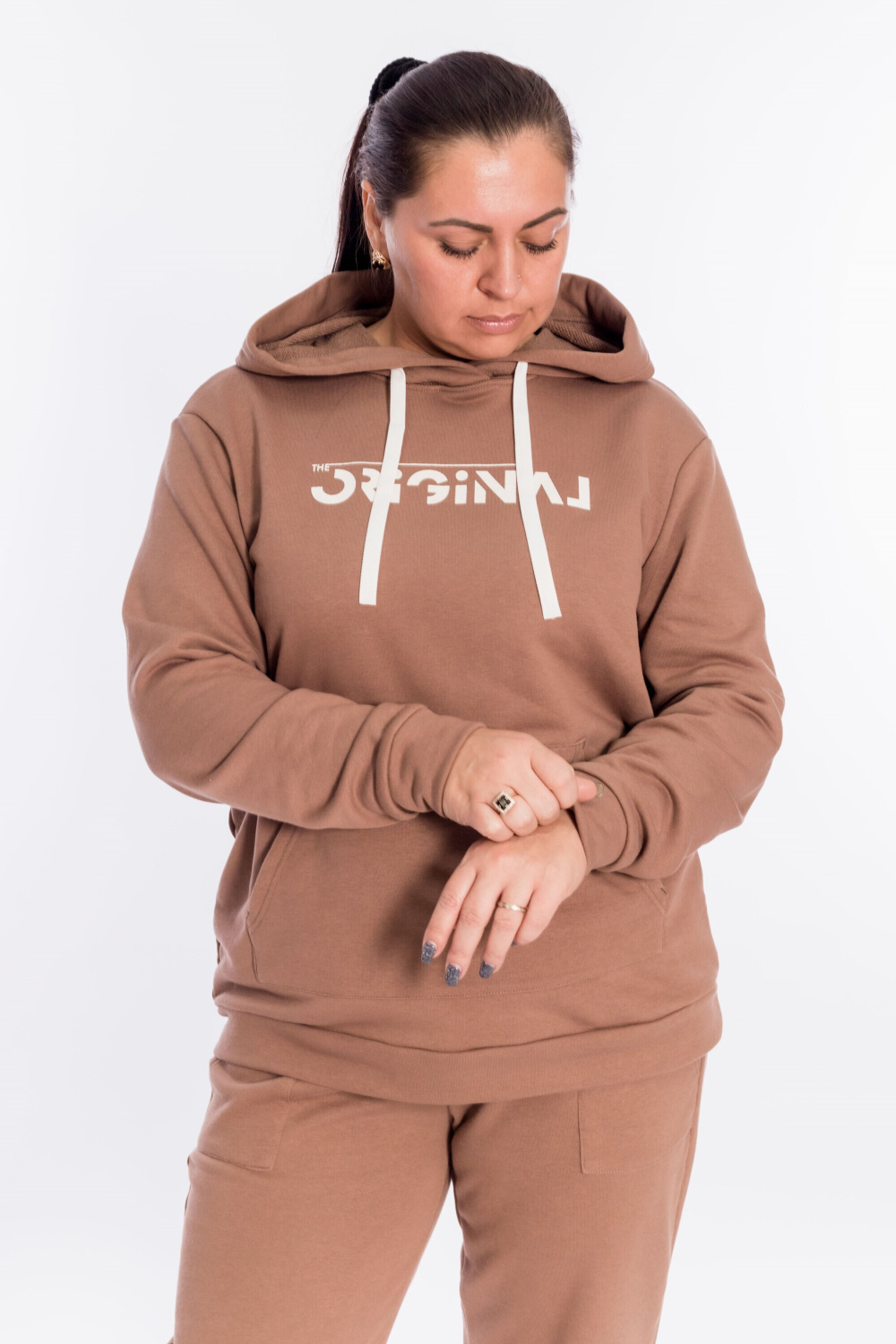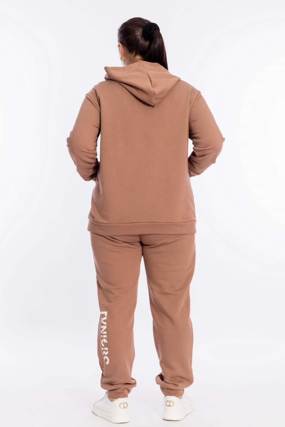 Костюм выполнен из футера трёхнитка "воздушка". Состоит из толстовки с капюшоном, длинные рукава заканчиваются манжетами из основного полотна. Спереди расположен карман-кенгуру. Брюки с поясом на резине, низ манжетах из основного полотна, спереди расположены два накладных кармана. Спереди на толстовке и сзади на брюках нанесён принт.