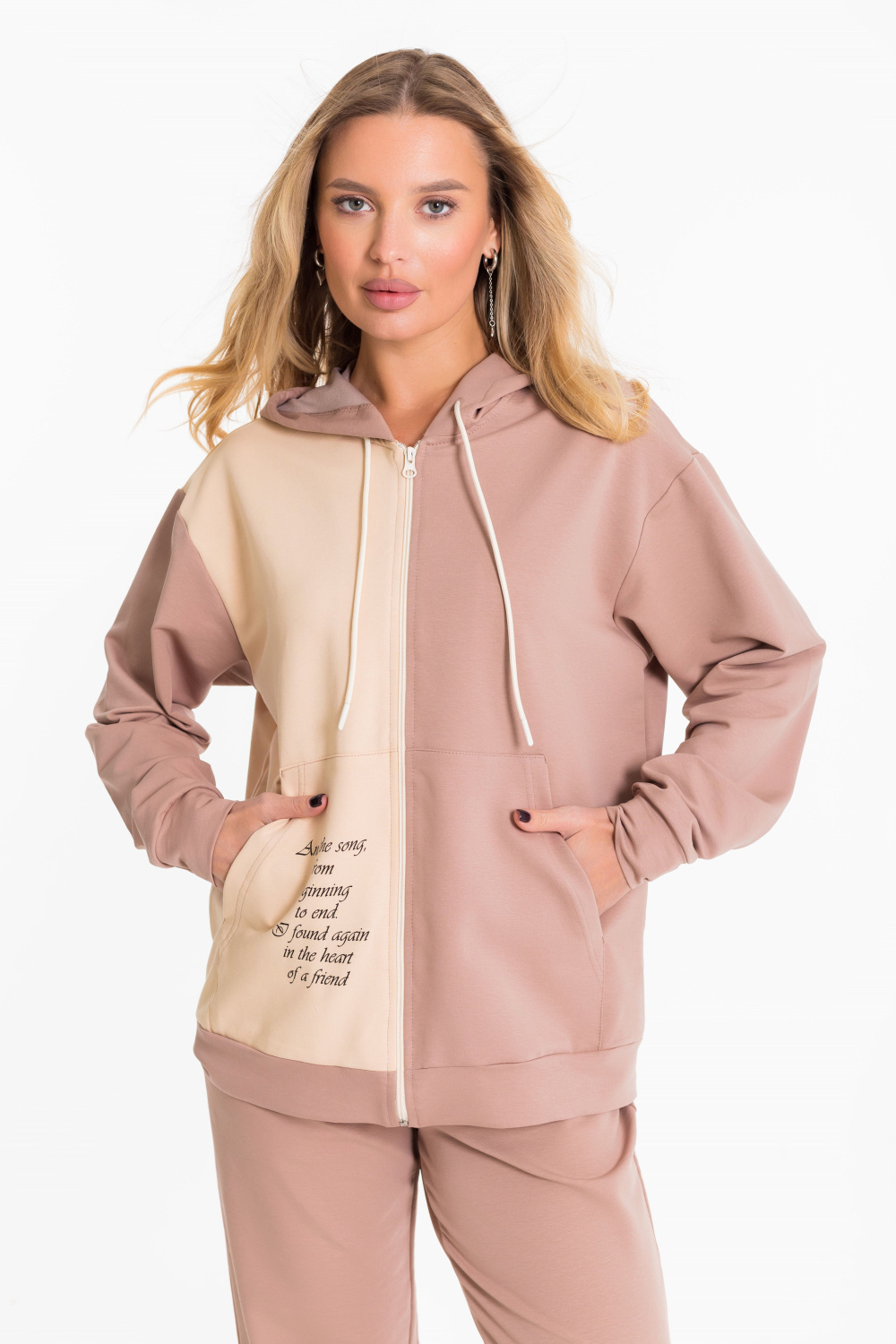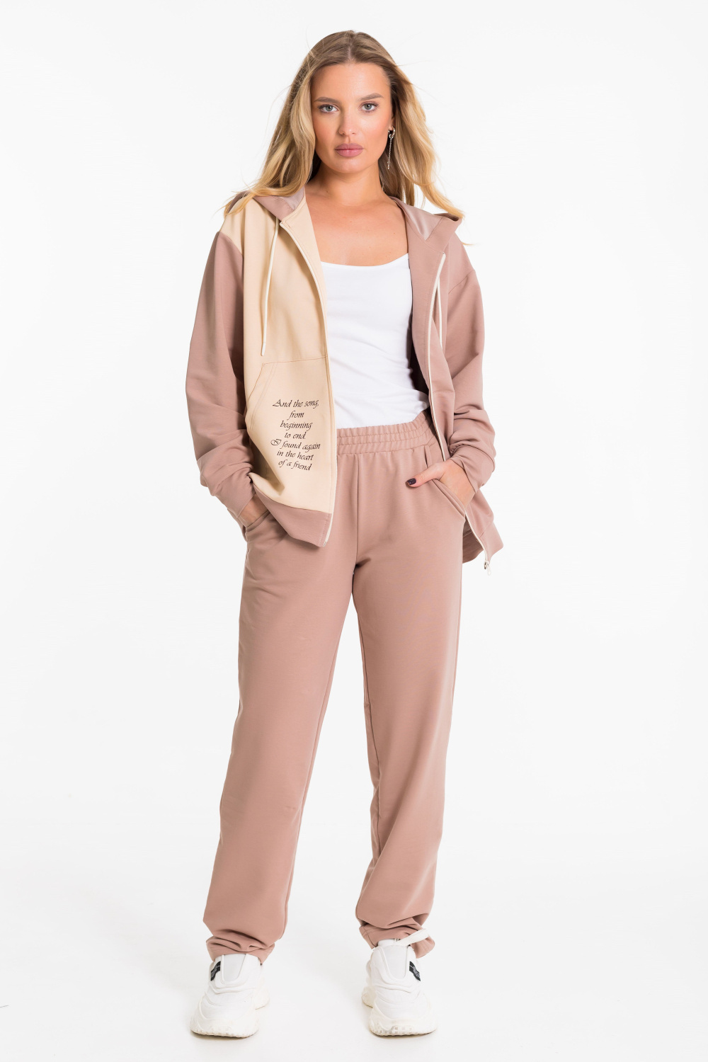 Женский костюм выполнен из однотонного футера с лайкрой двух цветов и состоит из толстовки и брюк. Толстовка с центральной застежкой на молнию, капюшоном и карманами кенгуру. Спереди и на спинке нанесён принт. Брюки с боковыми карманами и притачным поясом на резинке.