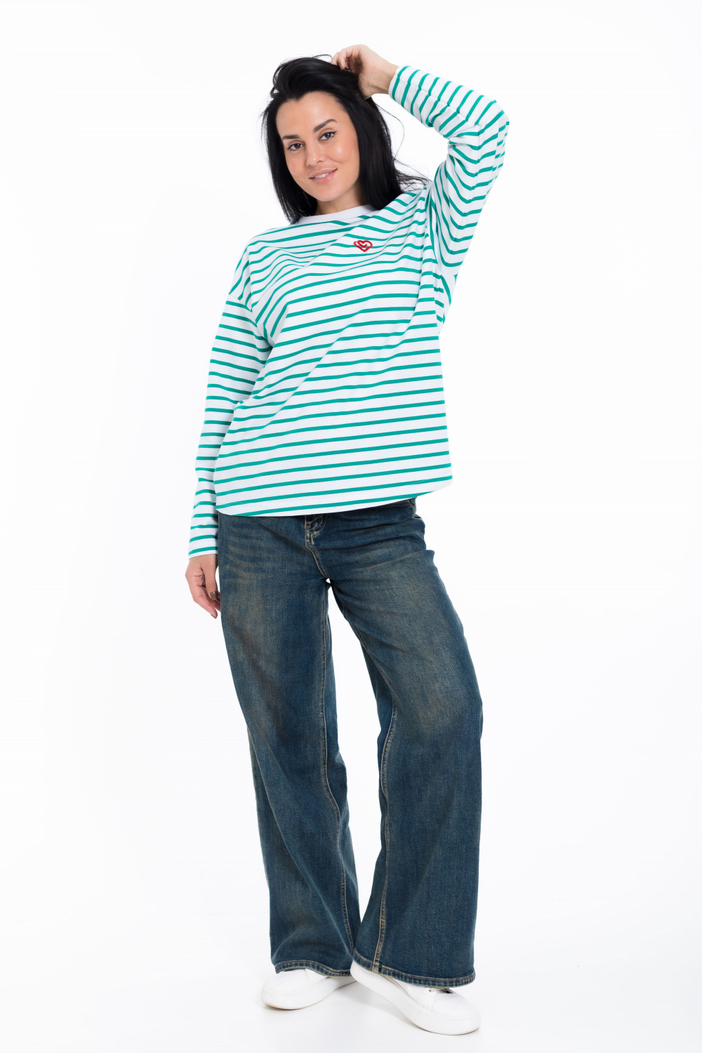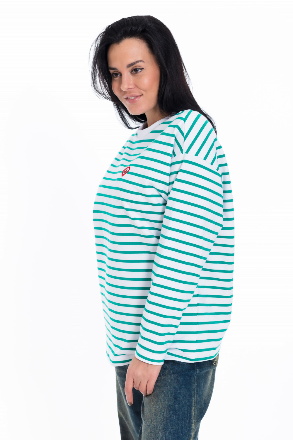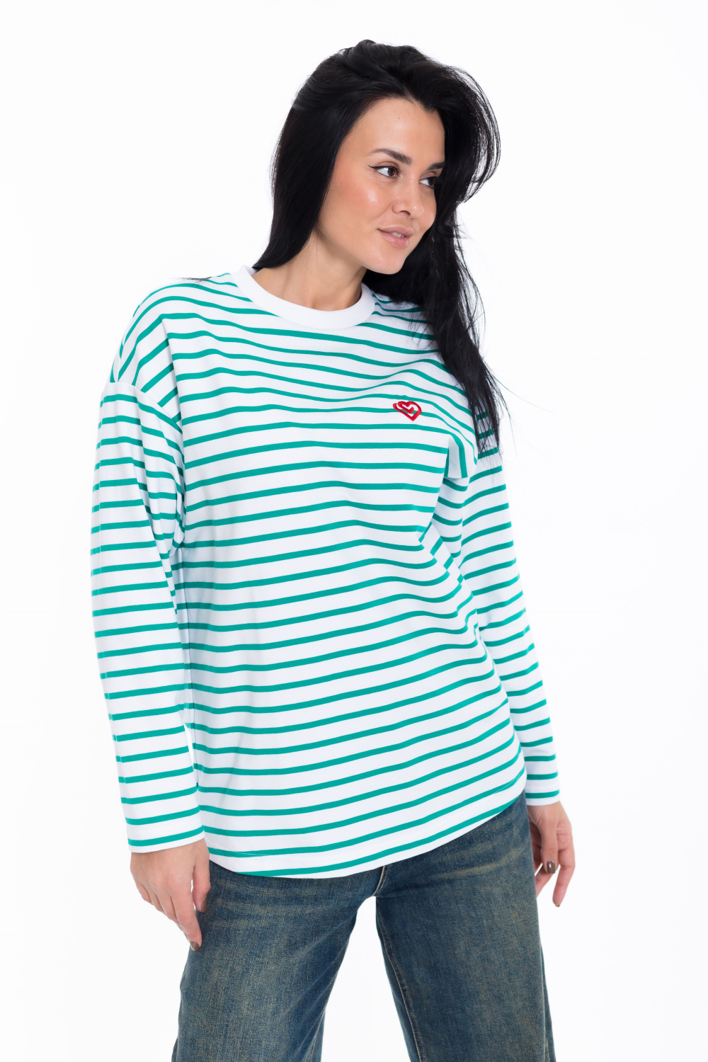 Женский лонгслив свободного кроя из белого футера с зеленой полоской - стильный и уютный вариант для повседневного образа. Удлиненные рукава и спущенная пройма добавляют современный и актуальный вид изделию.