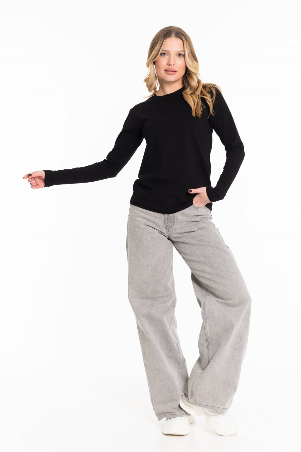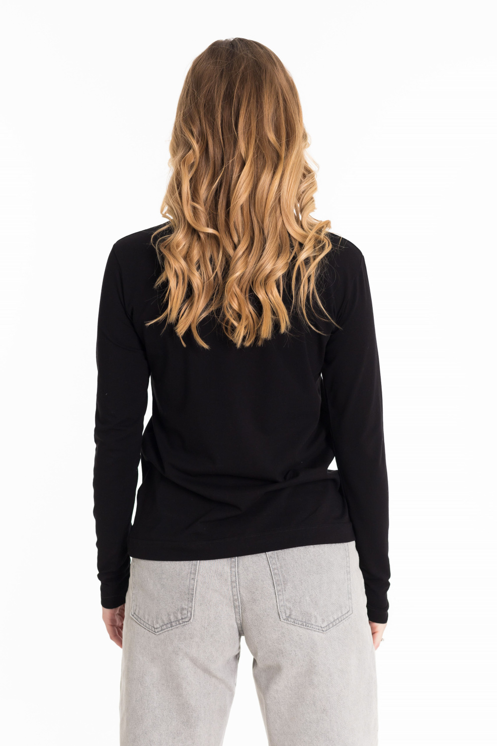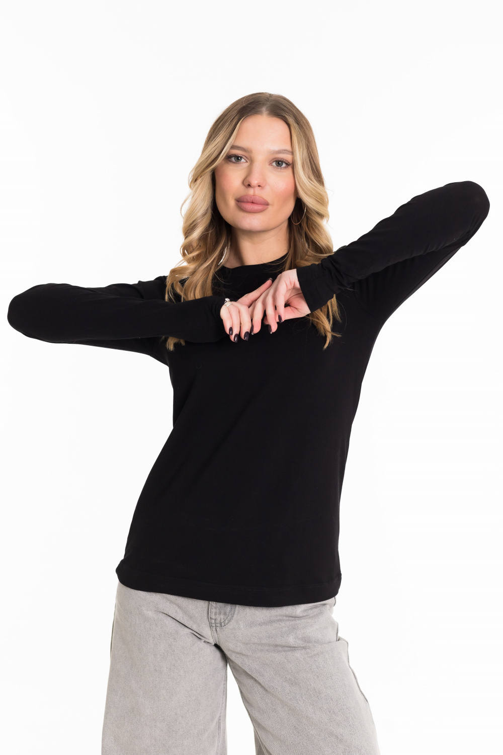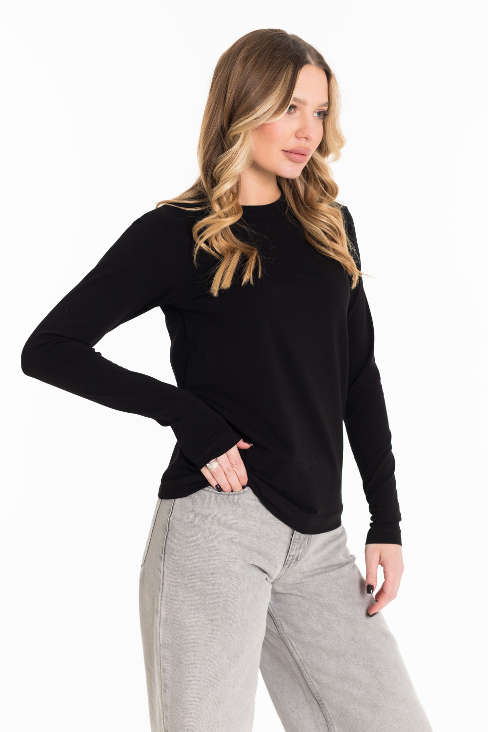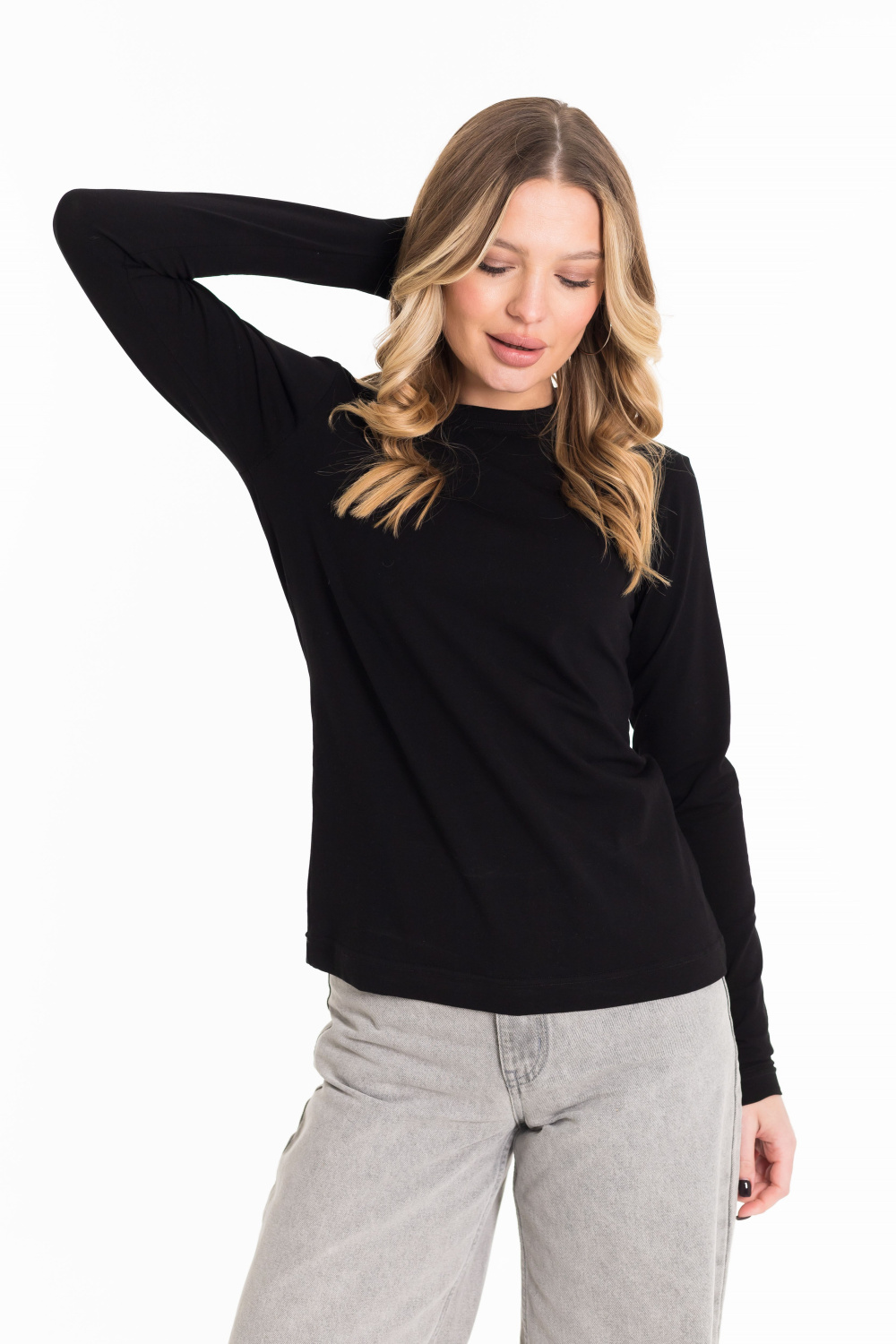Лонгслив женский выполнен из однотонной кулирки с лайкрой. Модель с длинными рукавами и круглым вырезом горловины, оформленным планкой. Лонгслив-идеальная основа для любого образа, отлично сочетается с джинсами, брюками, кардиганами  и другими предметами гардероба.