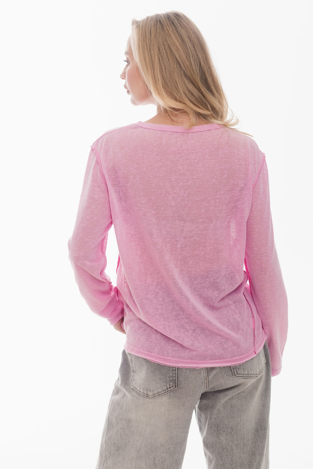 Лонгслив из поливискона с втачным длинным рукавом. По горловине, низу рукавов и низу изделия выполнен эффект необработанного края. Боковые швы смещены, что придаёт модели оригинальность. Лаконичный дизайн делает лонгслив универсальной основой для повседневных образов.