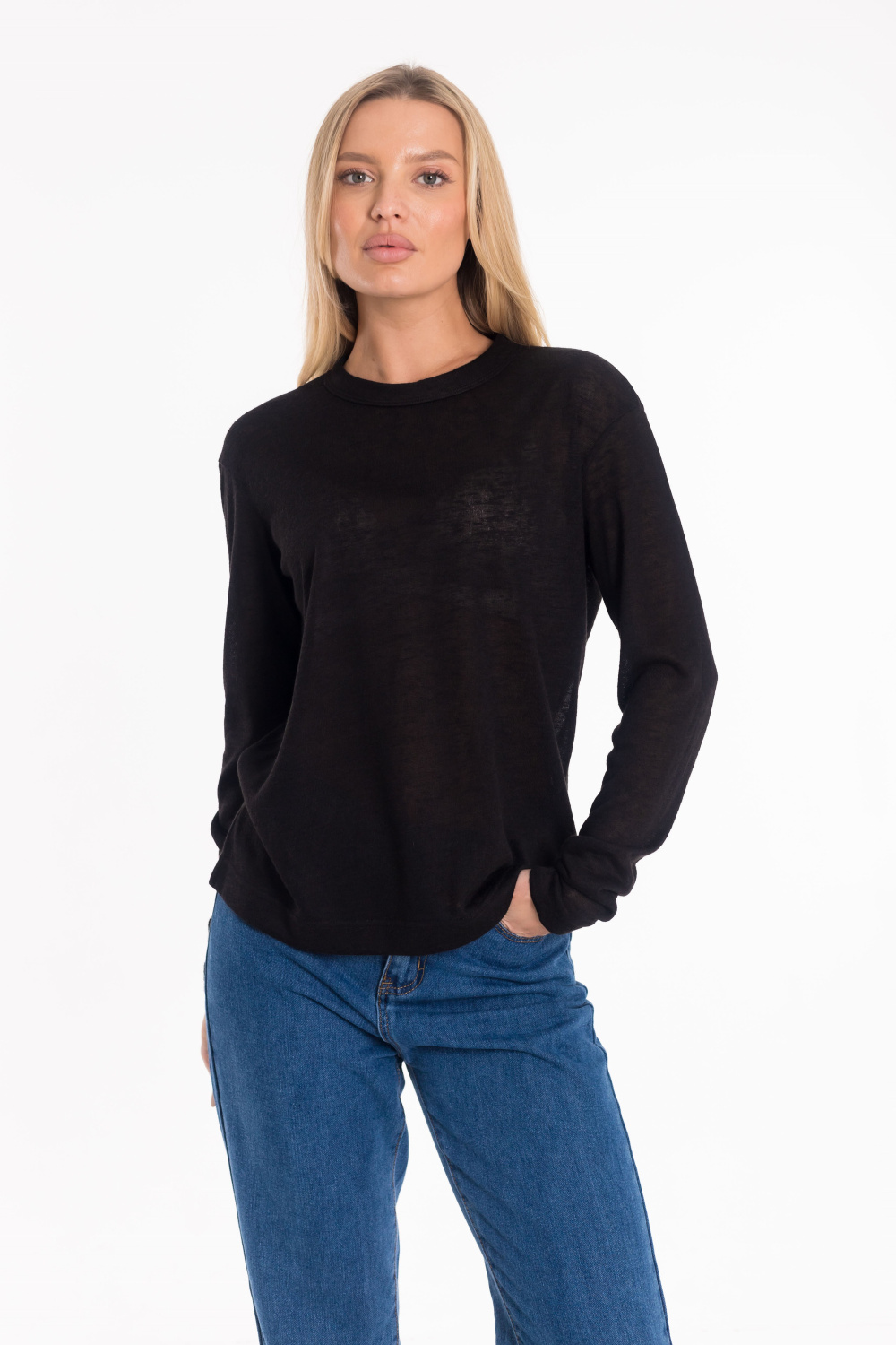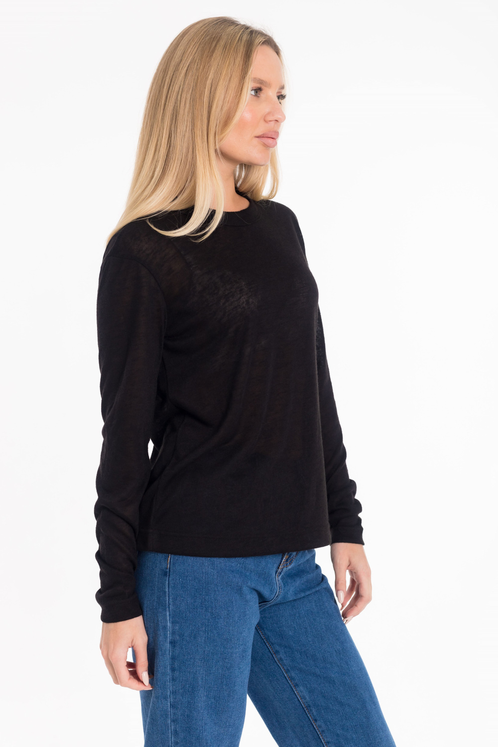 Женский лонгслив из полотна "поливискон". Модель свободного силуэта со спущенной линией плеча и круглой горловиной, оформленной широкой бейкой. Универсальный вариант для комфортных повседневных образов.