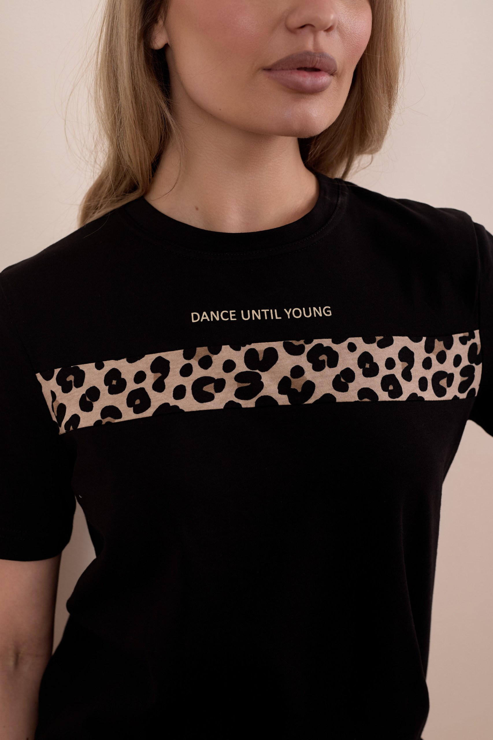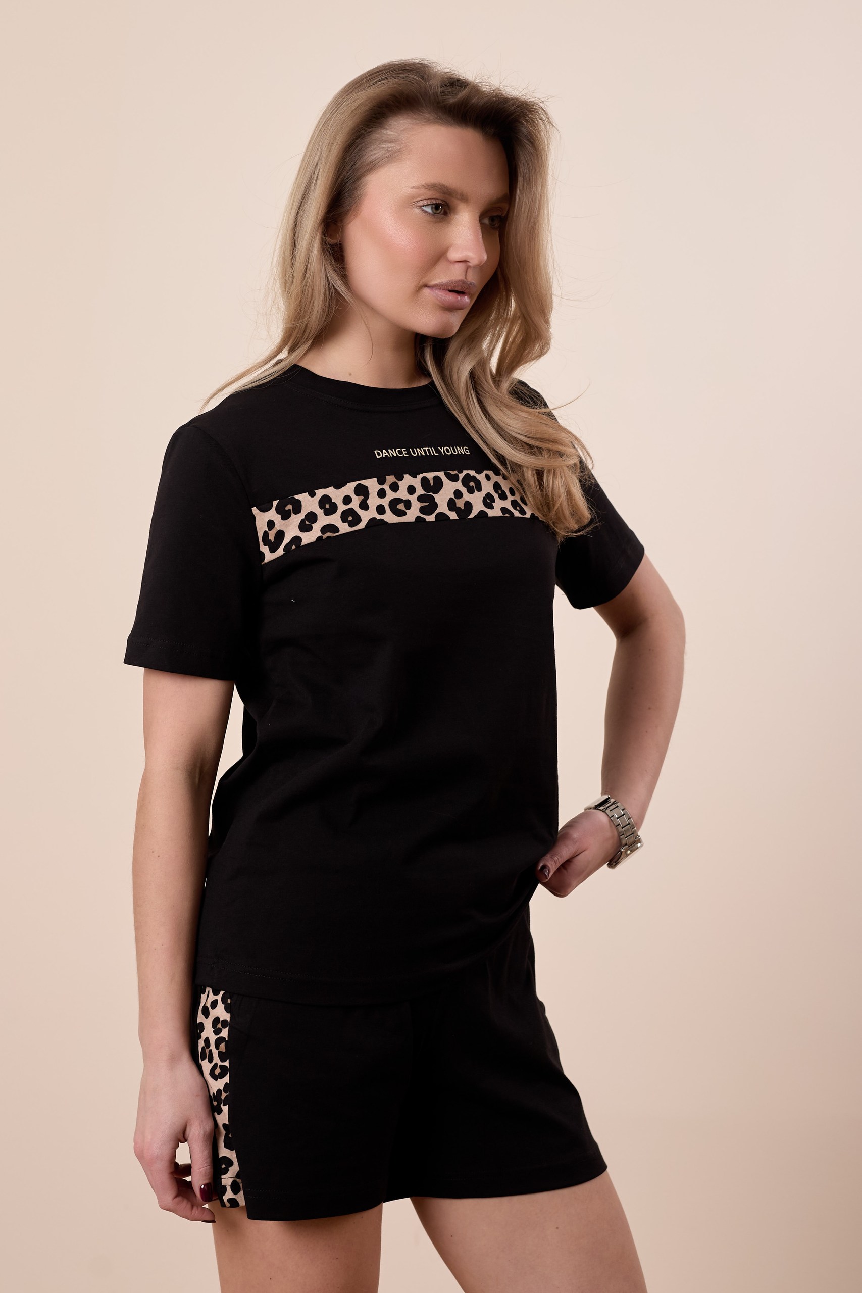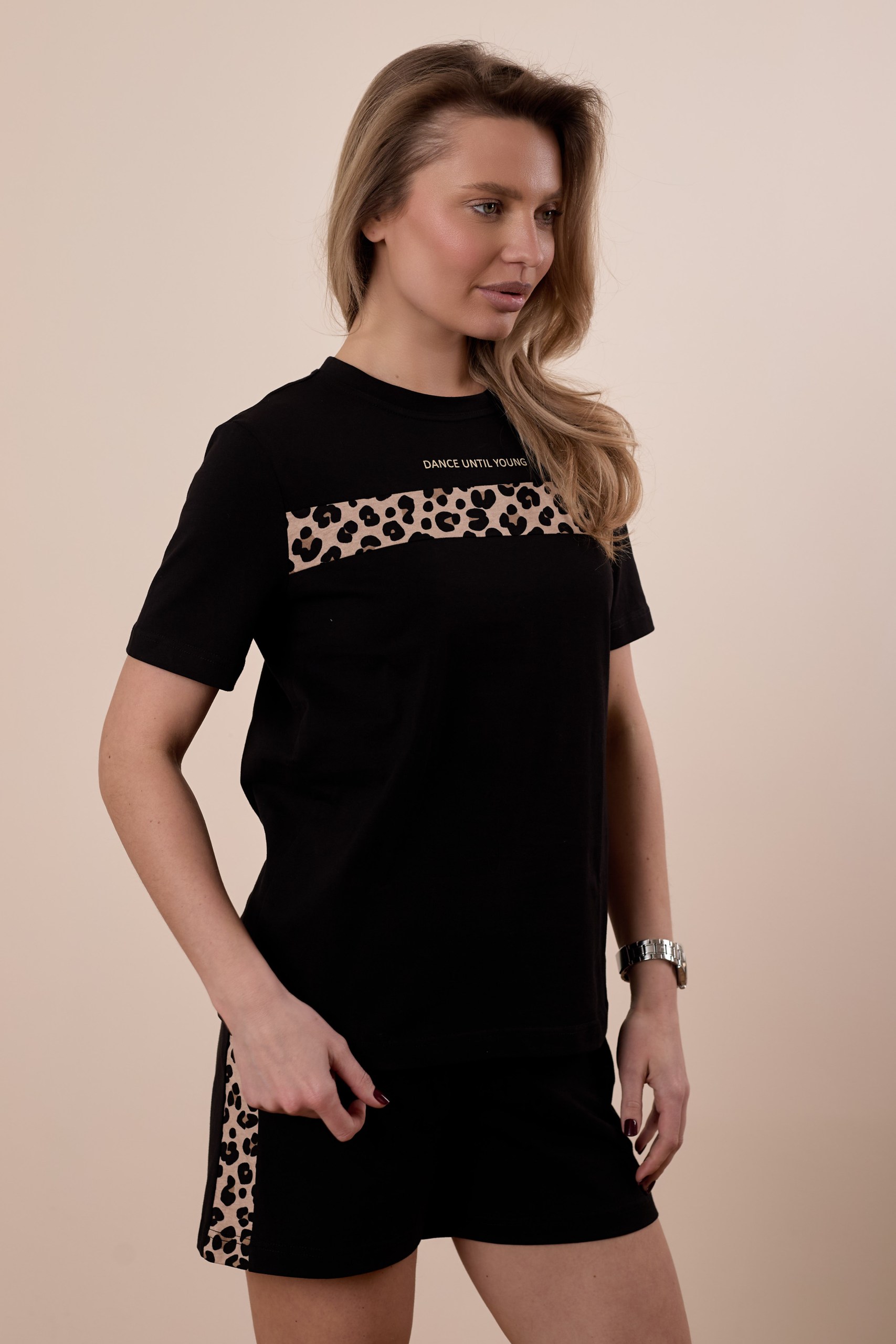 Костюм женский состоит из футболки и шорт. Футболка однотонная, с коротким втачным рукавом и планкой по горловине. На полочке футболки нанесён принт. Шорты из текстиля с боковыми карманами и притачным поясом с резинкой из кашкорсе.