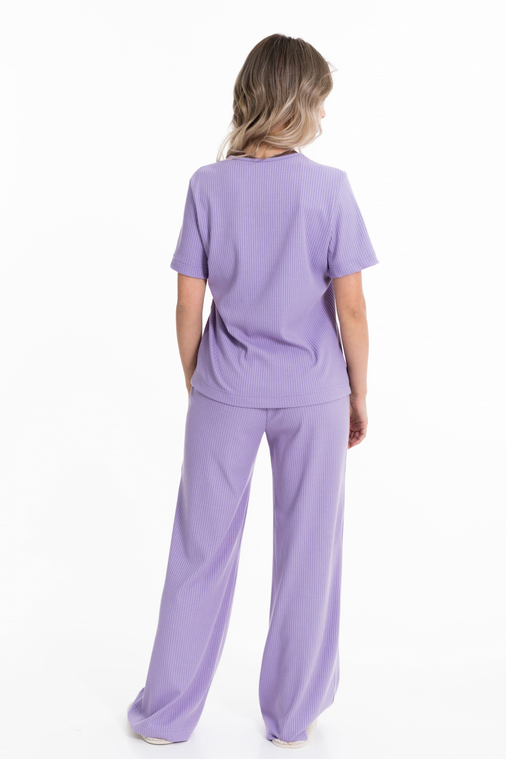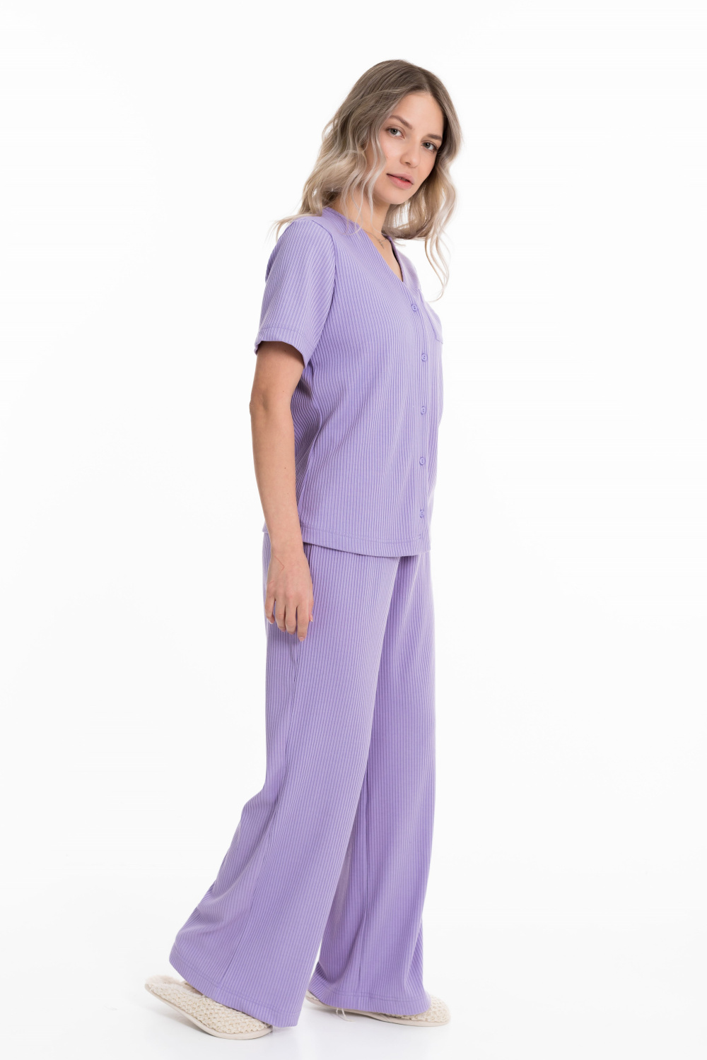 Пижама выполнена из кашкорсе с добавлением вискозы. Рубашка с коротким рукавом и застежкой на пуговицы спереди. Слева расположен небольшой нагрудный карман. Брюки свободные, с поясом на резине.
