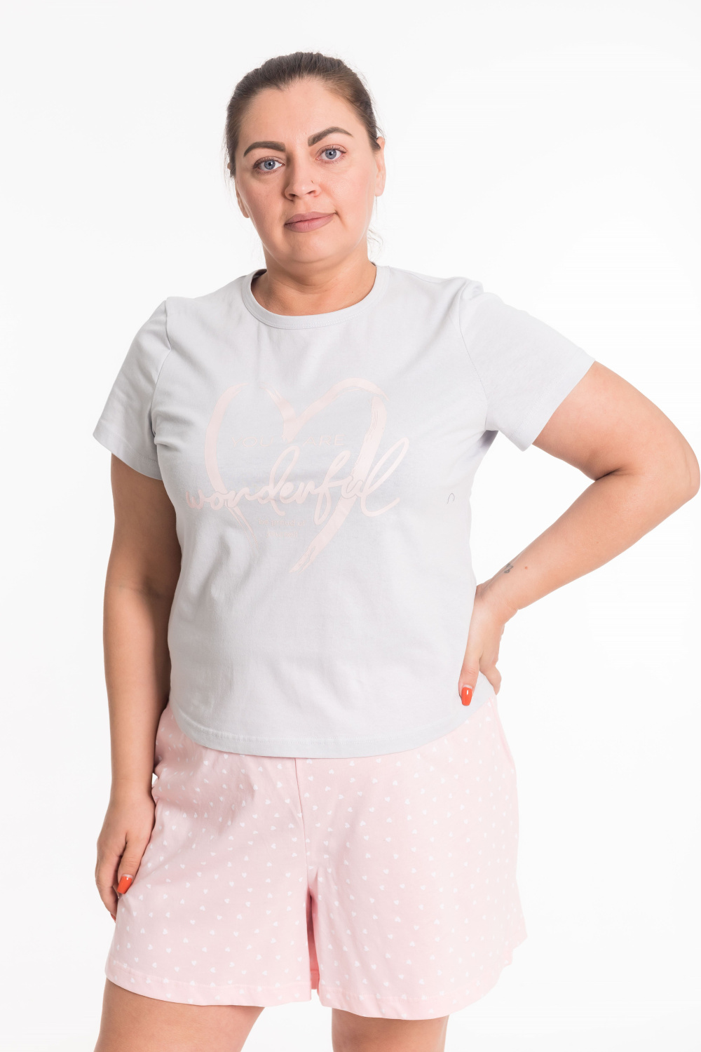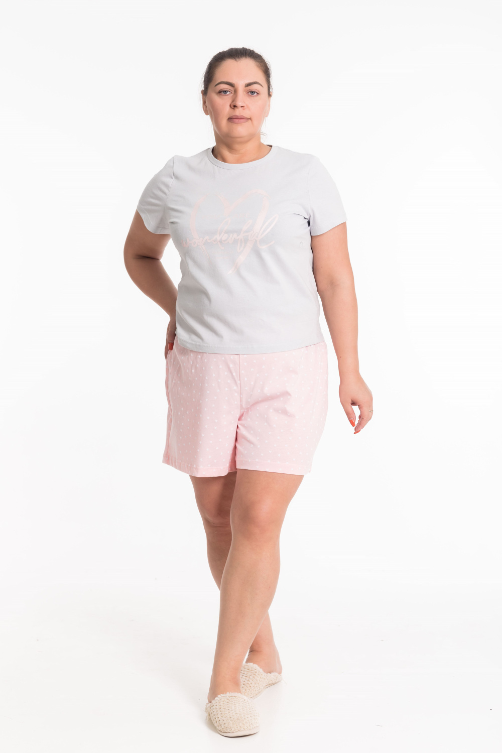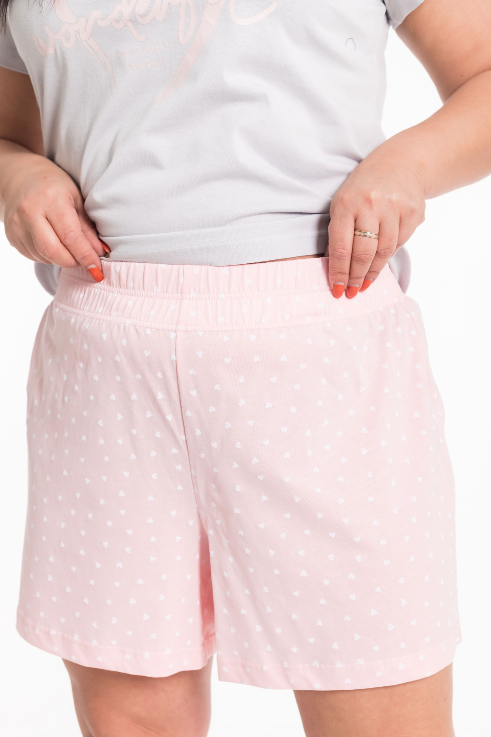 Женская пижама включает в себя футболку и шорты, выполненные из хлопкового полотна. Футболка прямого кроя с коротким рукавом и круглым вырезом горловины обеспечивает комфорт и свободу движений. Спереди на футболке нанесен принт. Шорты с поясом на широкой резинке, обеспечивают идеальную посадку и удобство. Такой дизайн позволяет свободно двигаться и чувствовать себя комфортно даже во время сна.