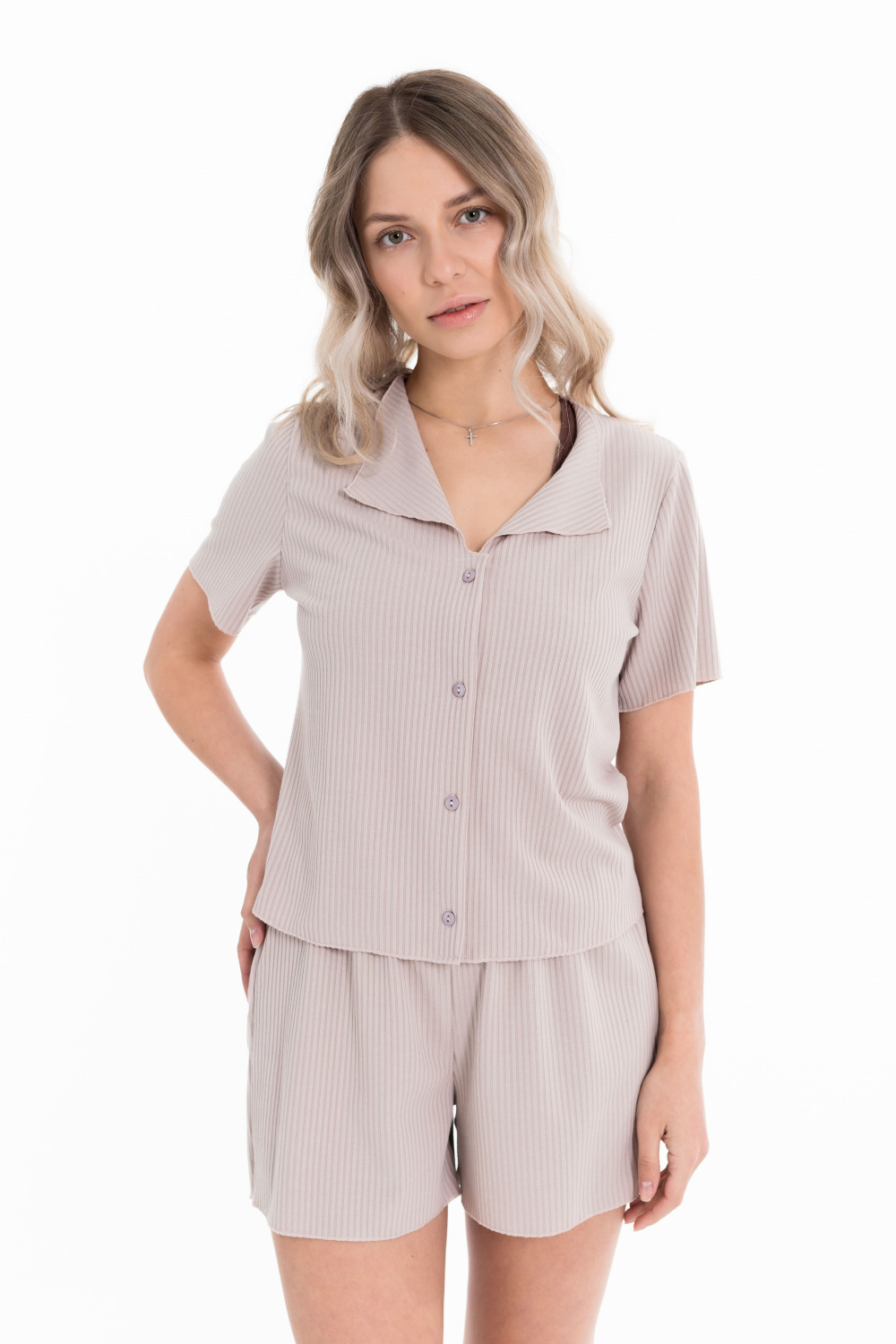 Пижама выполнена из кашкорсе с добавлением вискозы. Рубашка с коротким рукавом и застежкой на пуговицы спереди. Шорты свободные, с поясом на резине.