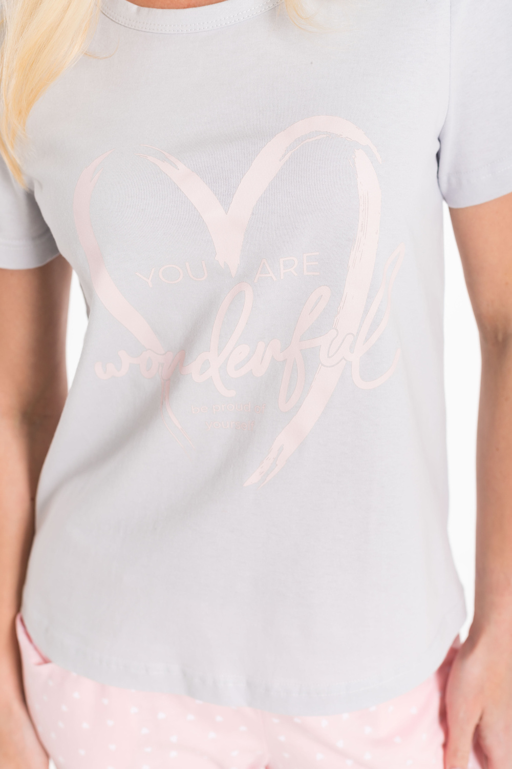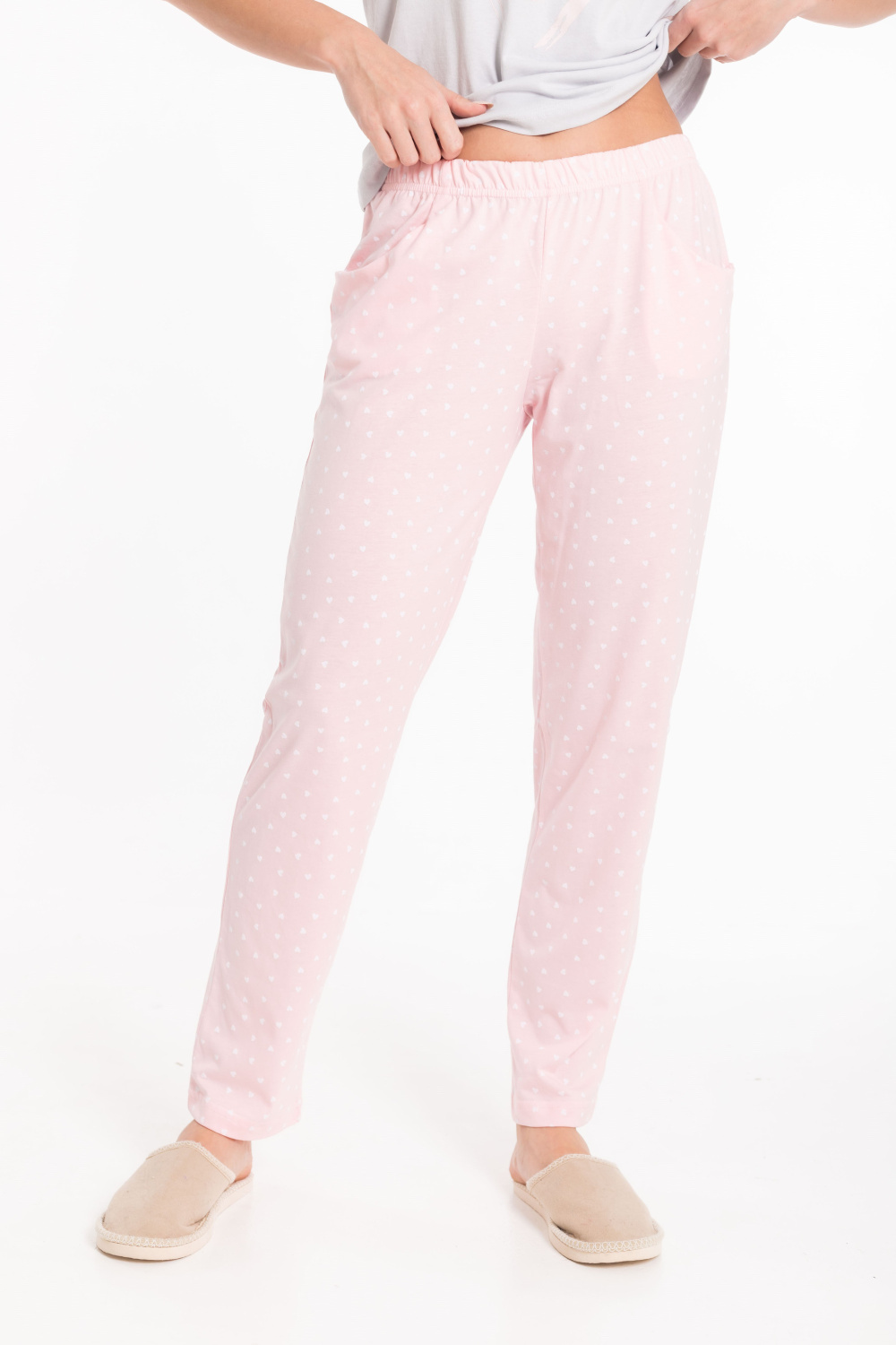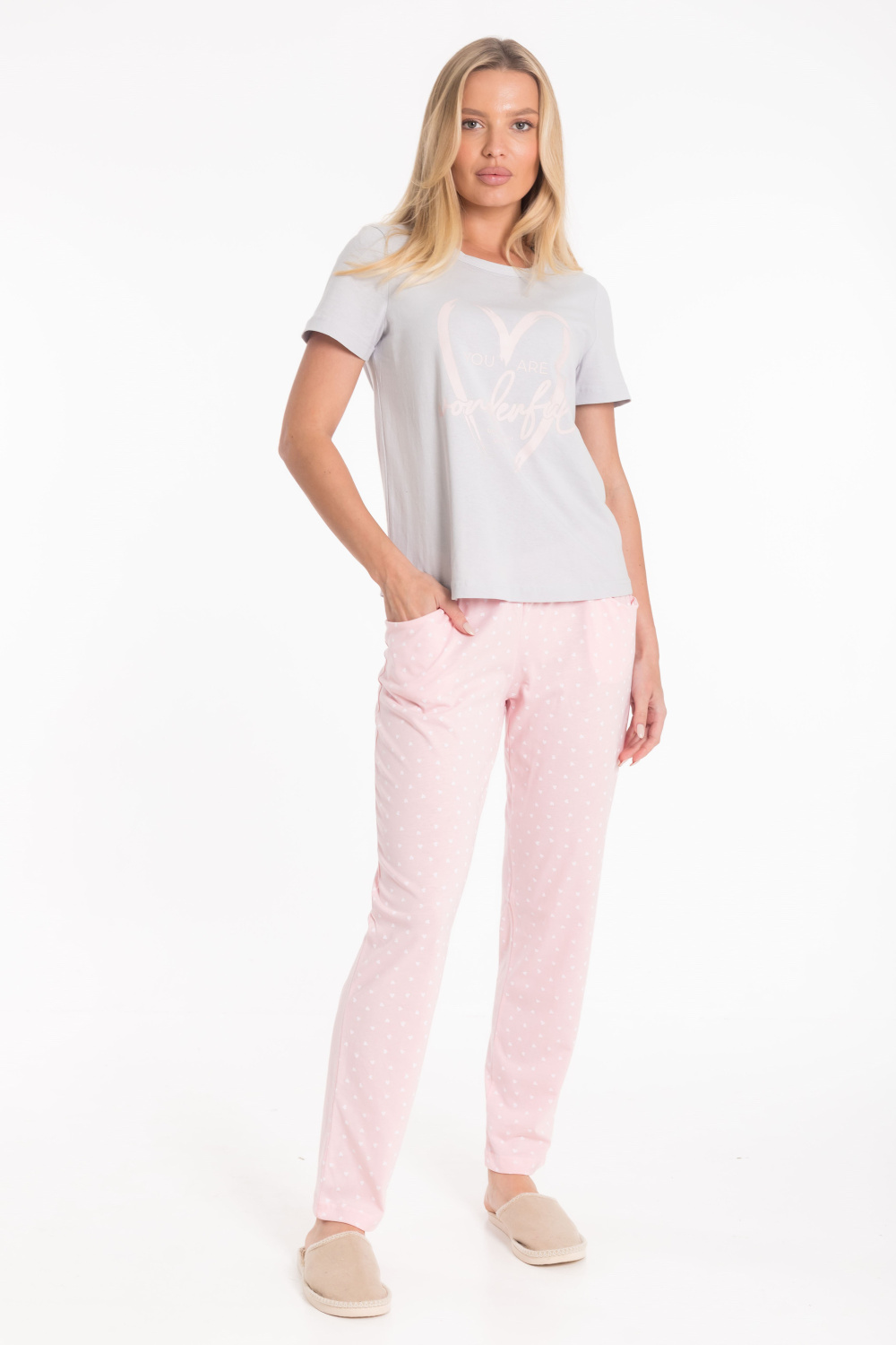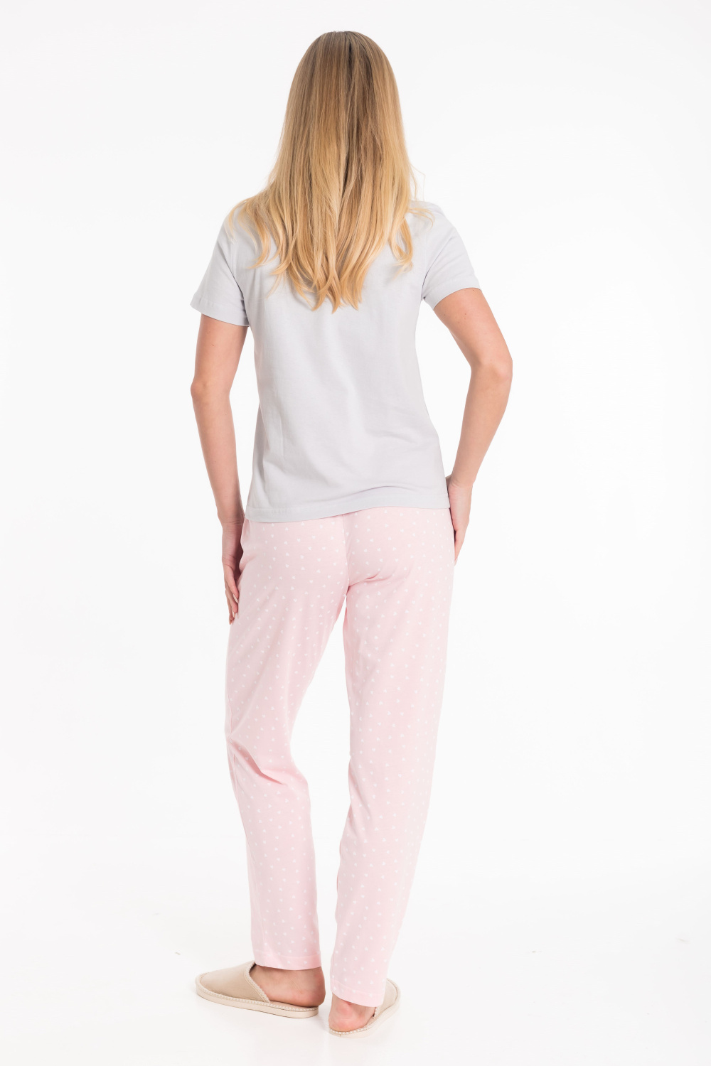 Женская пижама включает в себя футболку и брюки, выполненные из хлопкового полотна. Футболка прямого кроя с принтом, коротким рукавом и круглым вырезом горловины обеспечивает комфорт и свободу движений. Брюки с поясом на широкой резинке, обеспечивают идеальную посадку и удобство. Такой дизайн позволяет свободно двигаться и чувствовать себя комфортно даже во время сна.