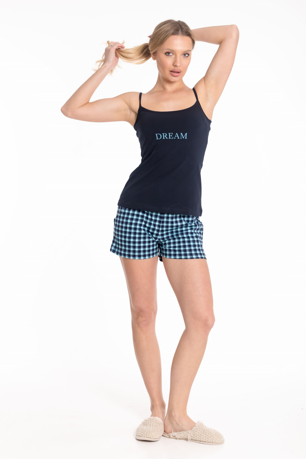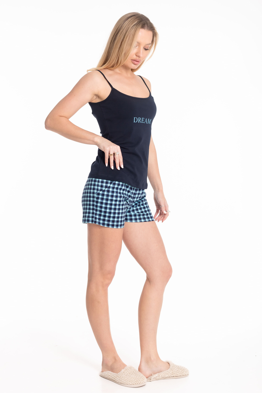 Женский комплект состоит из топа и шорт. Топ однотонный с принтом спереди, на тонких бретелях. Топ выполнен из кулирки с лайкрой. Шорты из кулирки с набивным рисунком, пояс на резине, по бокам с карманами.