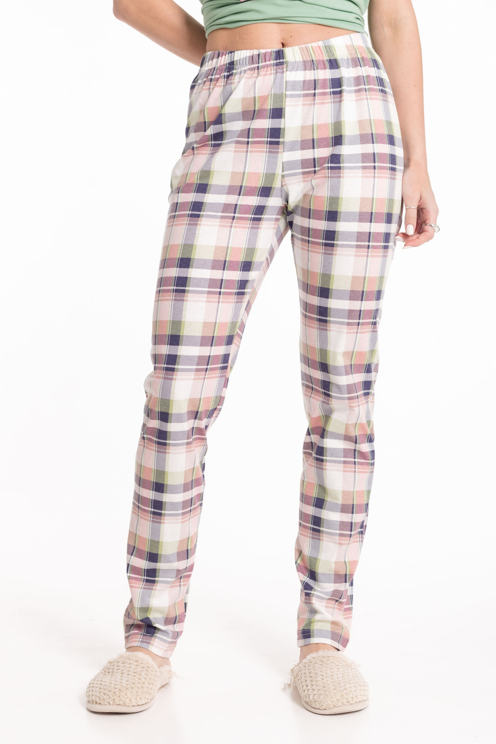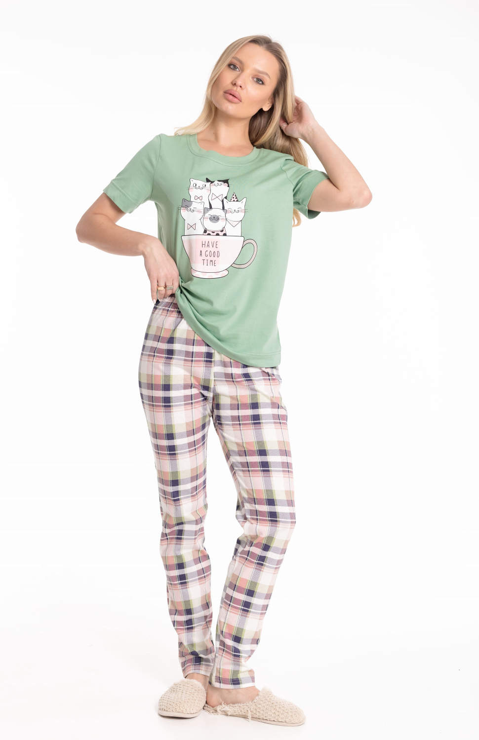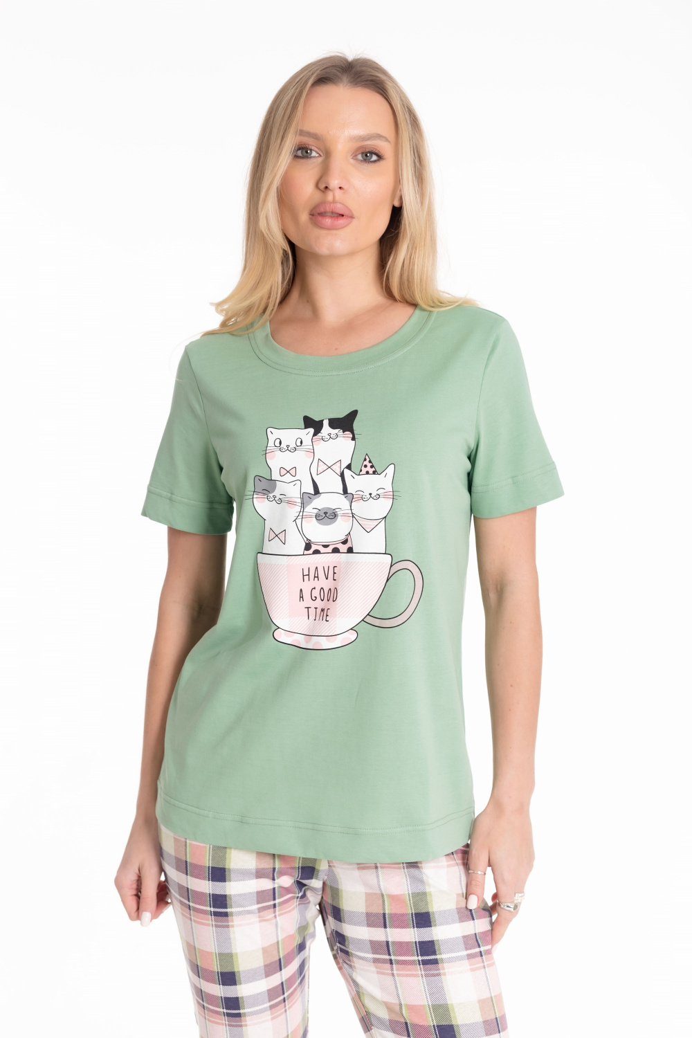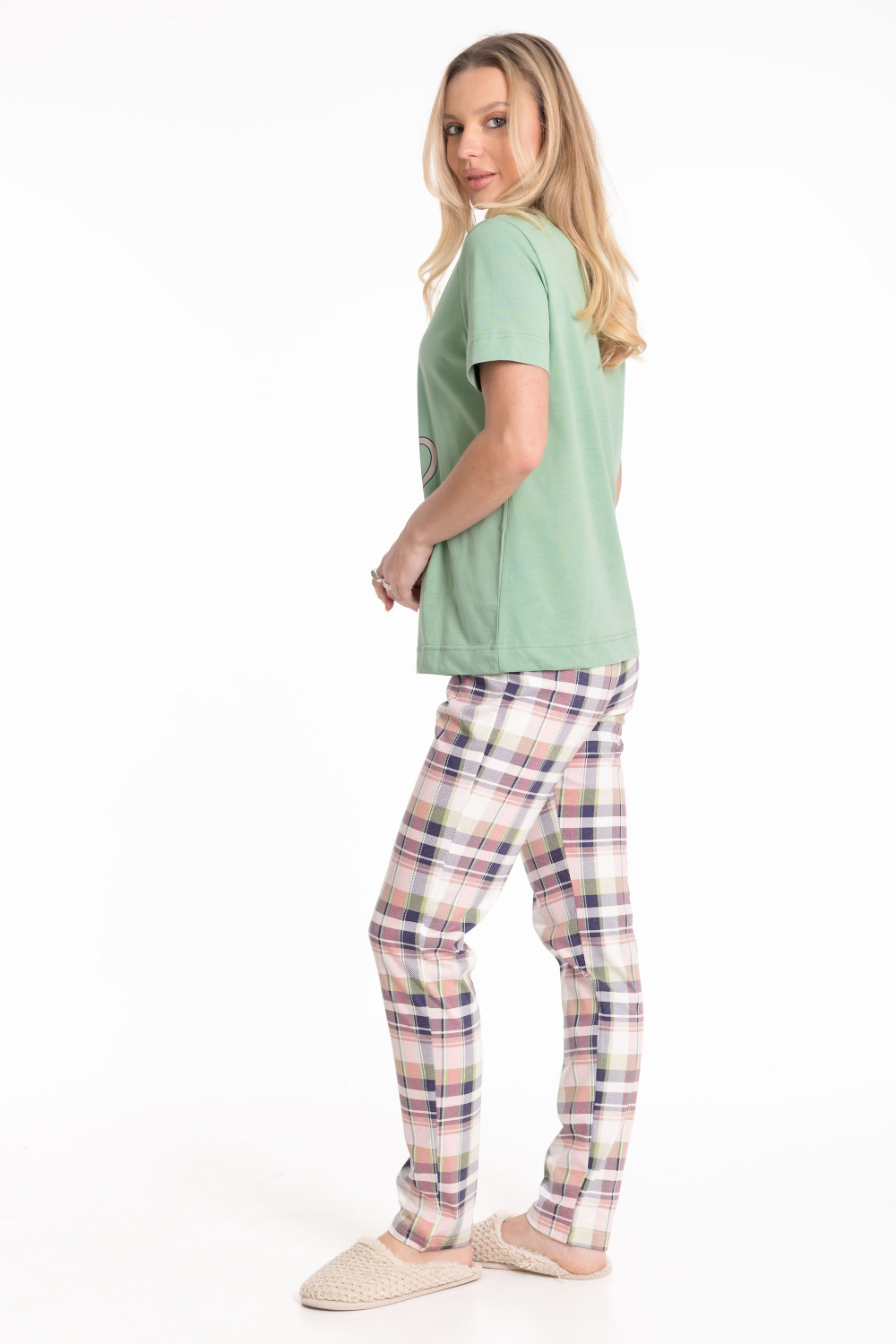 Пижама выполнена из хлопкового полотна. Футболка однотонная, с коротким втачным рукавом и планкой по горловине. Спереди нанесён принт. Брюки из полотна с набивным рисунком, пояс на резинке.