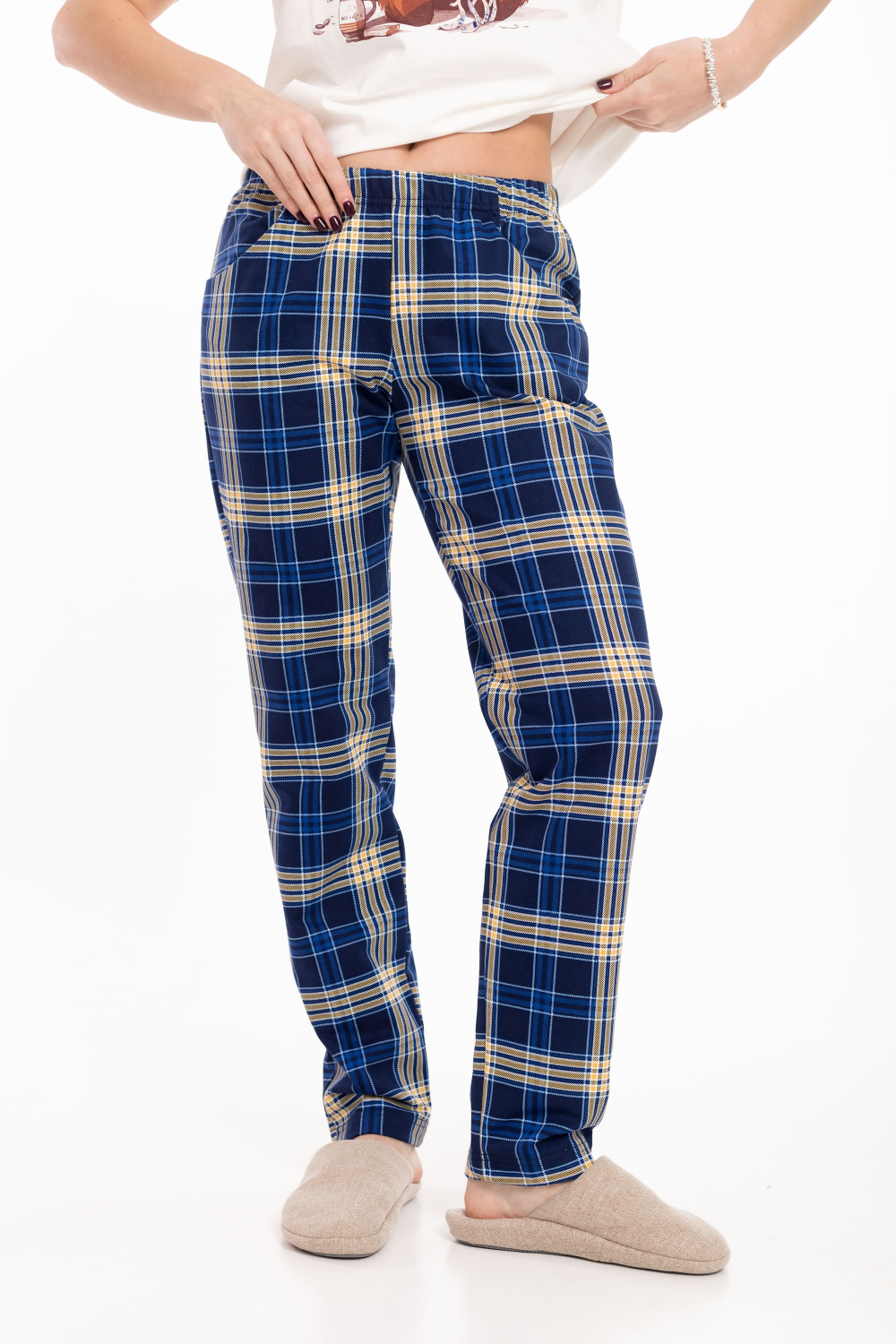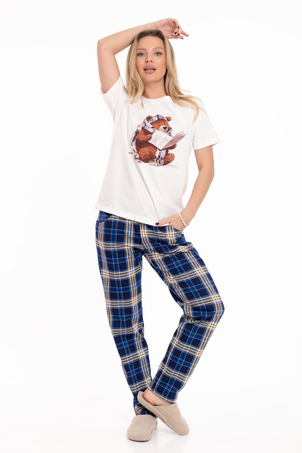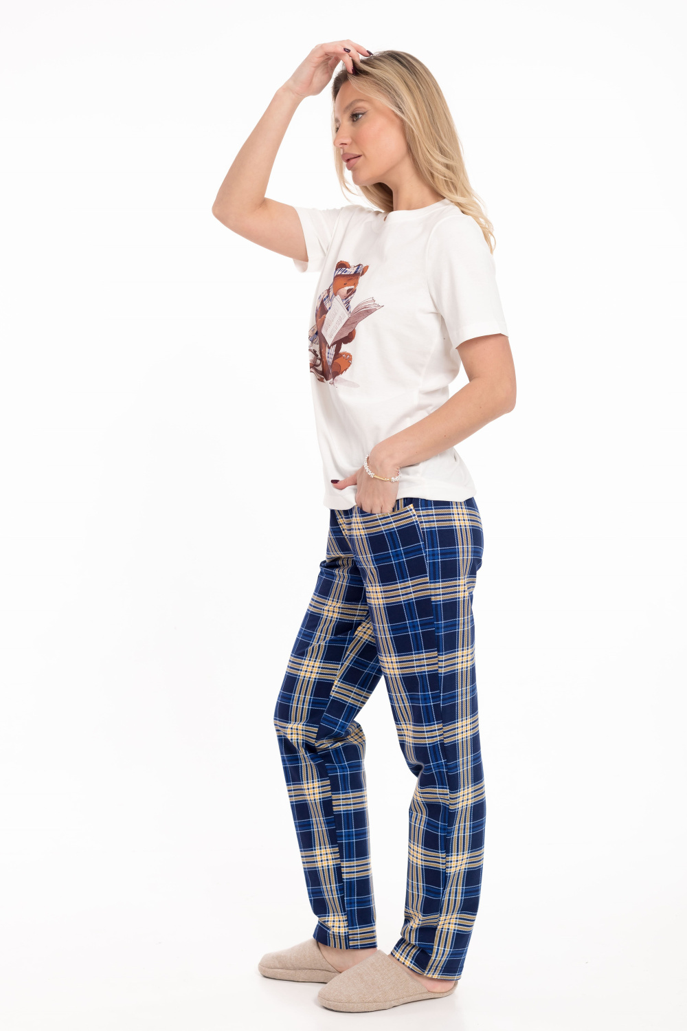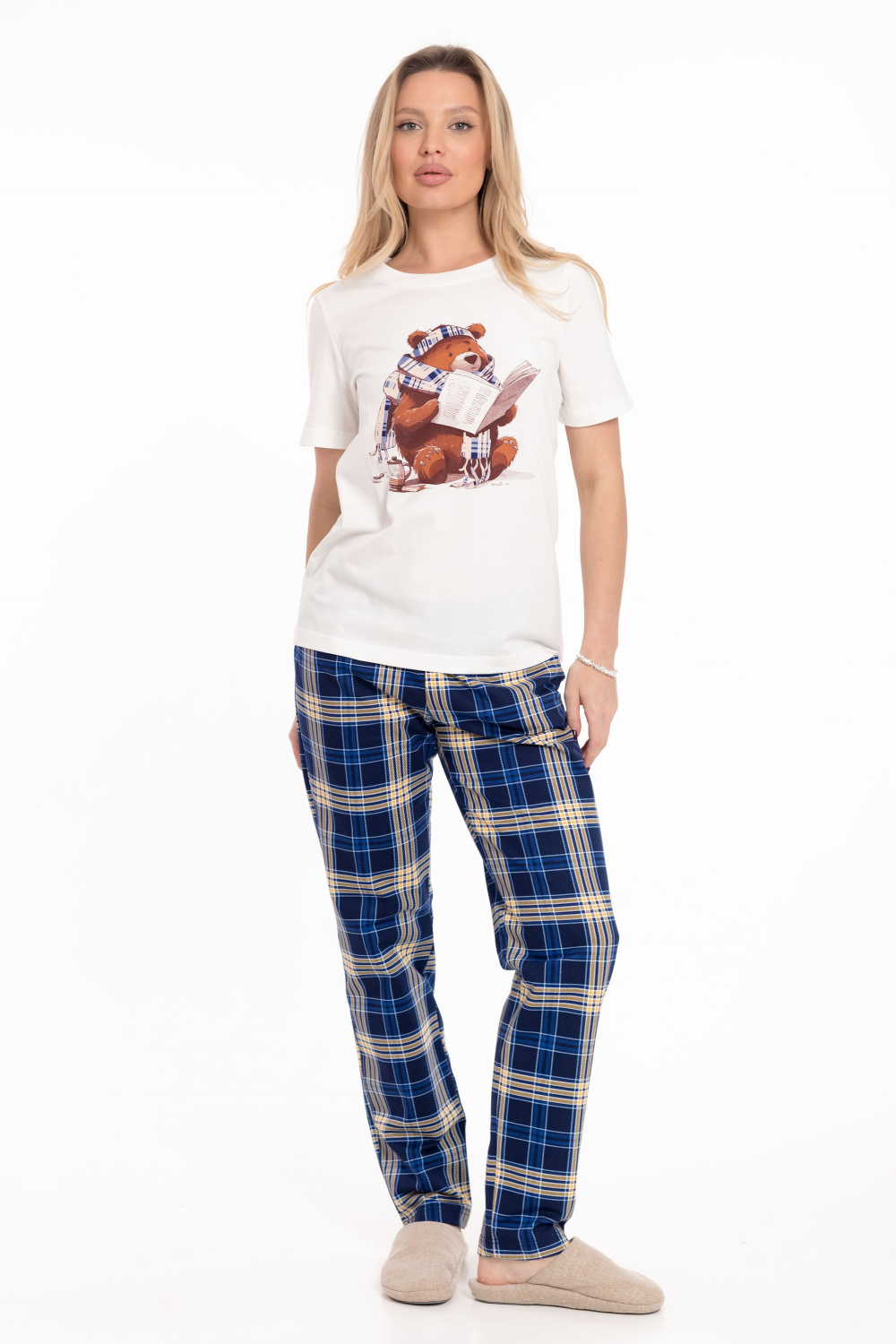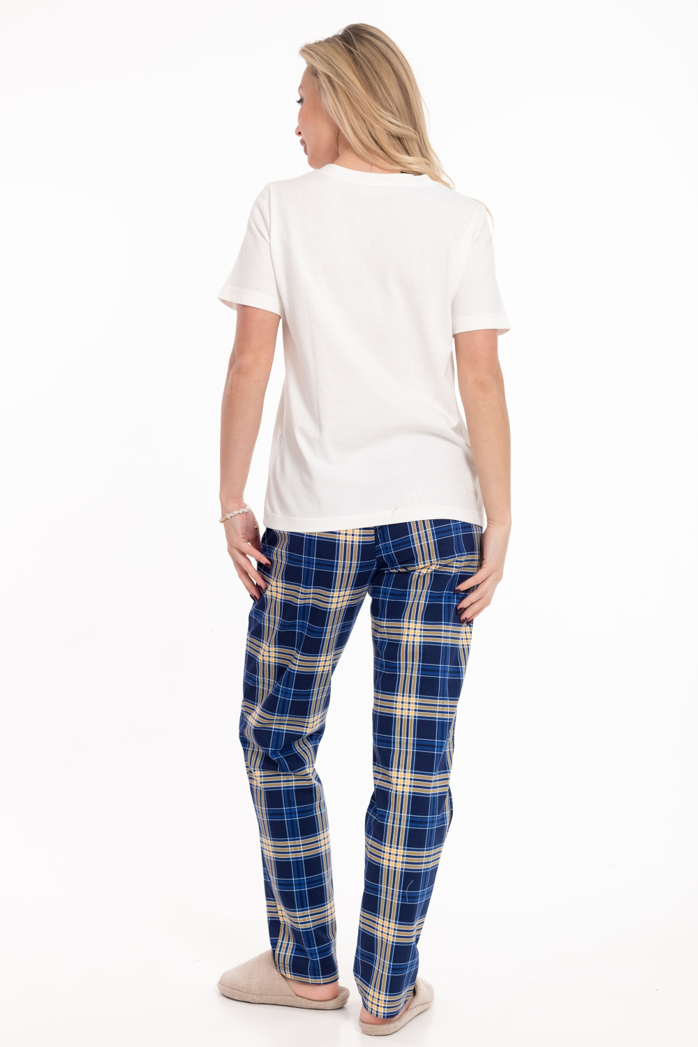 Женская пижама — отличный выбор для комфортного сна и отдыха. Она состоит из футболки и брюк, выполненных из мягкого хлопкового полотна. Футболка имеет короткий втачной рукав и планку по горловине, что обеспечивает удобство при носке. Однотонный дизайн футболки дополнен принтом спереди. Брюки изготовлены из футера 2-х нитки с начесом с набивным рисунком в клетку и имеют пояс на резинке, который обеспечивает комфортную посадку. Такая пижама идеально подойдёт для повседневной носки дома или во время отдыха. Она изготовлена из натуральной ткани, которая позволяет коже дышать и обеспечивает комфортный сон.