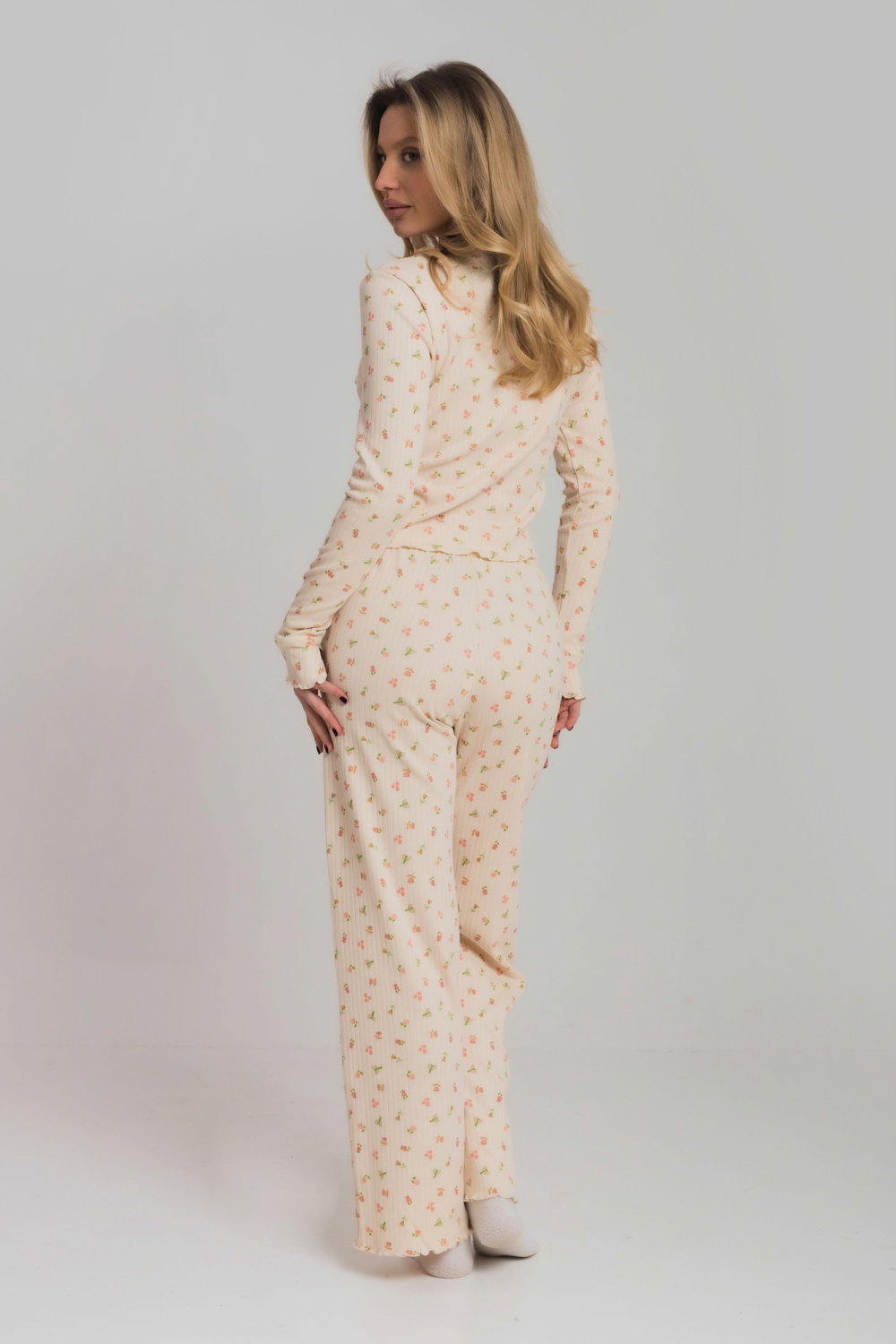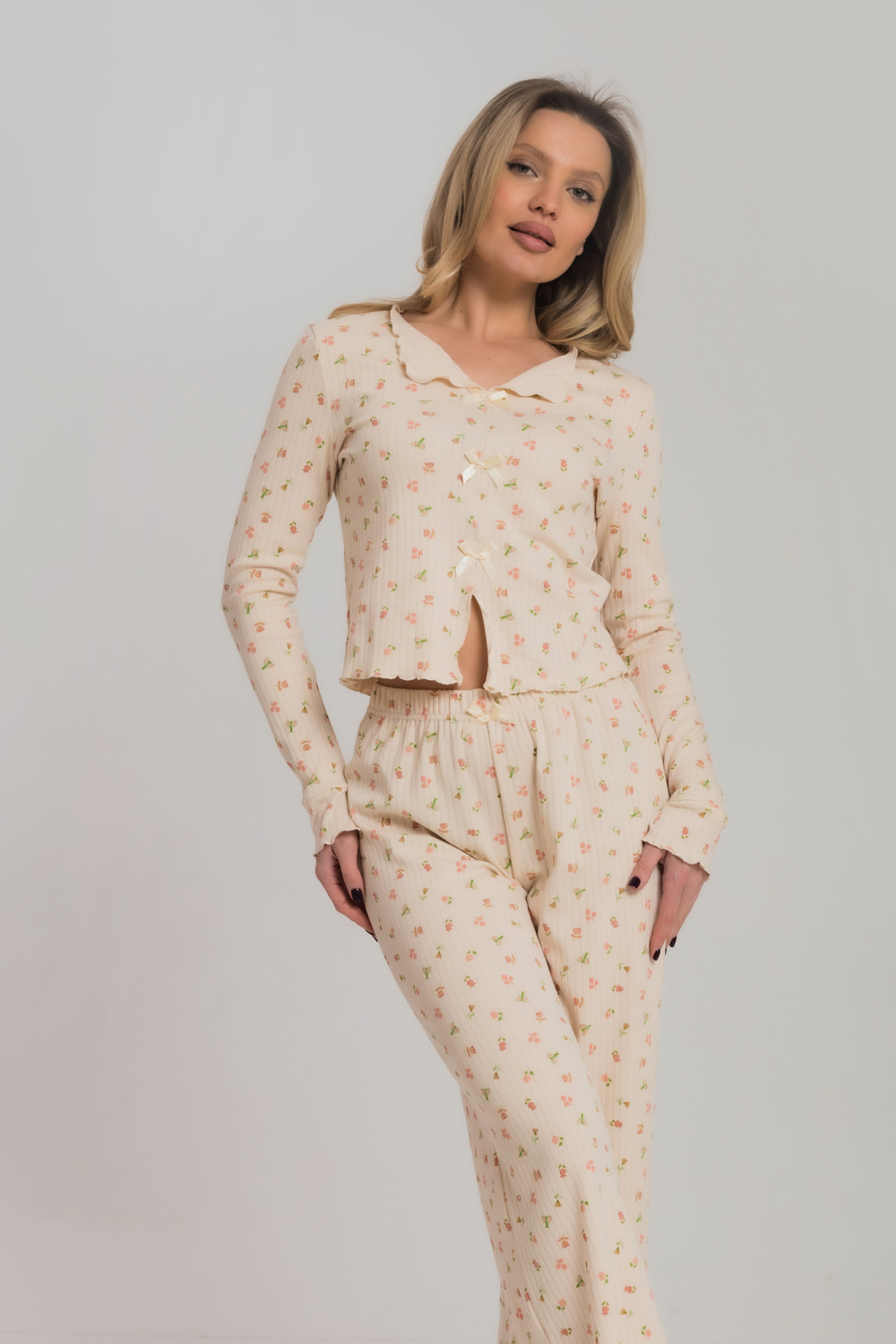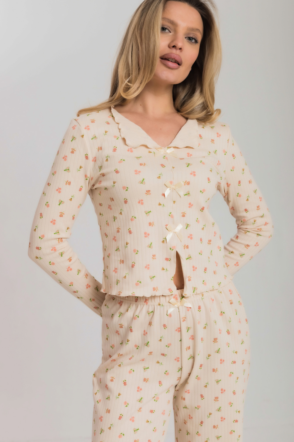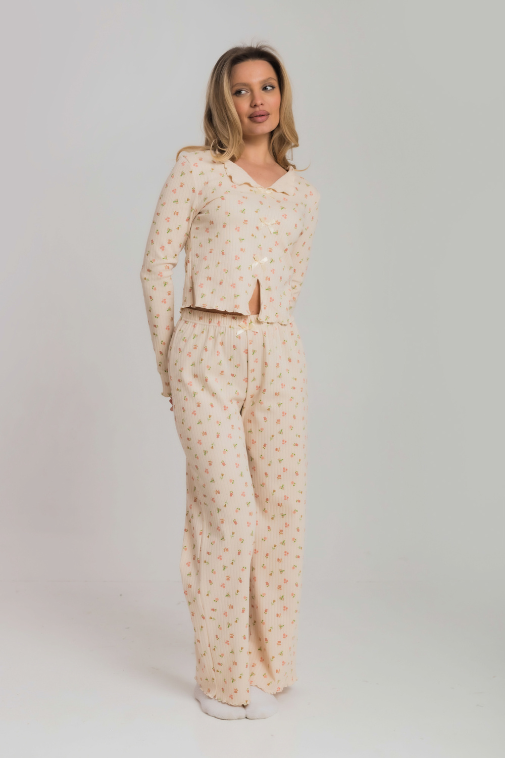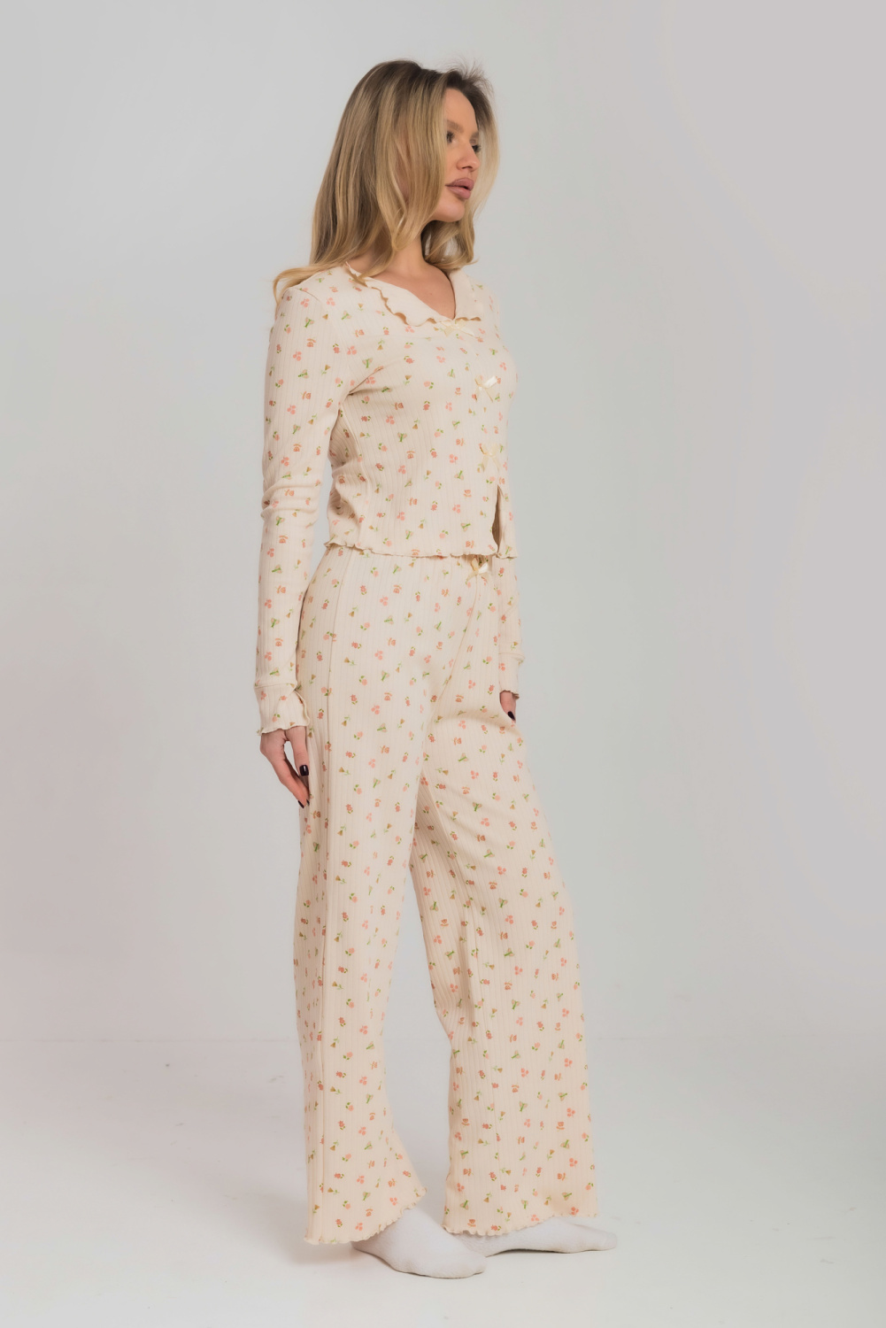 Пижама из мягкого и приятного к телу интерлока состоит из топа и шорт. Топ оформлен милыми "крылышками" по проймам и аккуратной отделкой горловины. Шорты на удобной резинке, без карманов. Пижама декорирована бантиками и отделкой на микрооверлоке, придающей образу нежность и изящность.