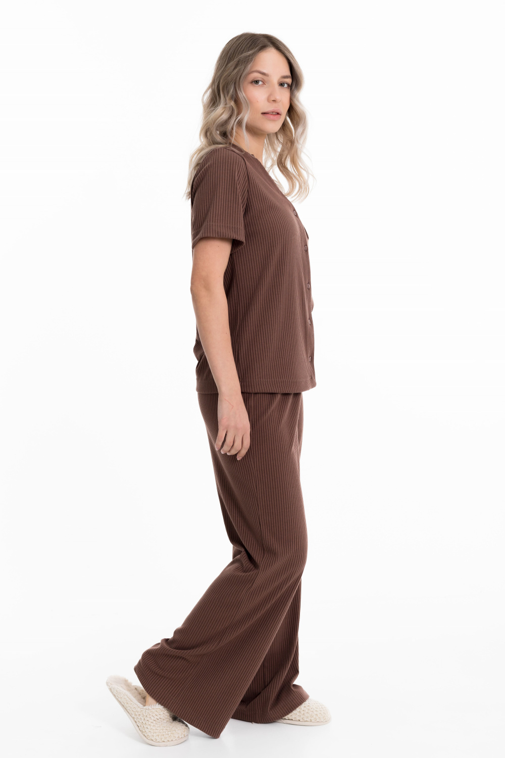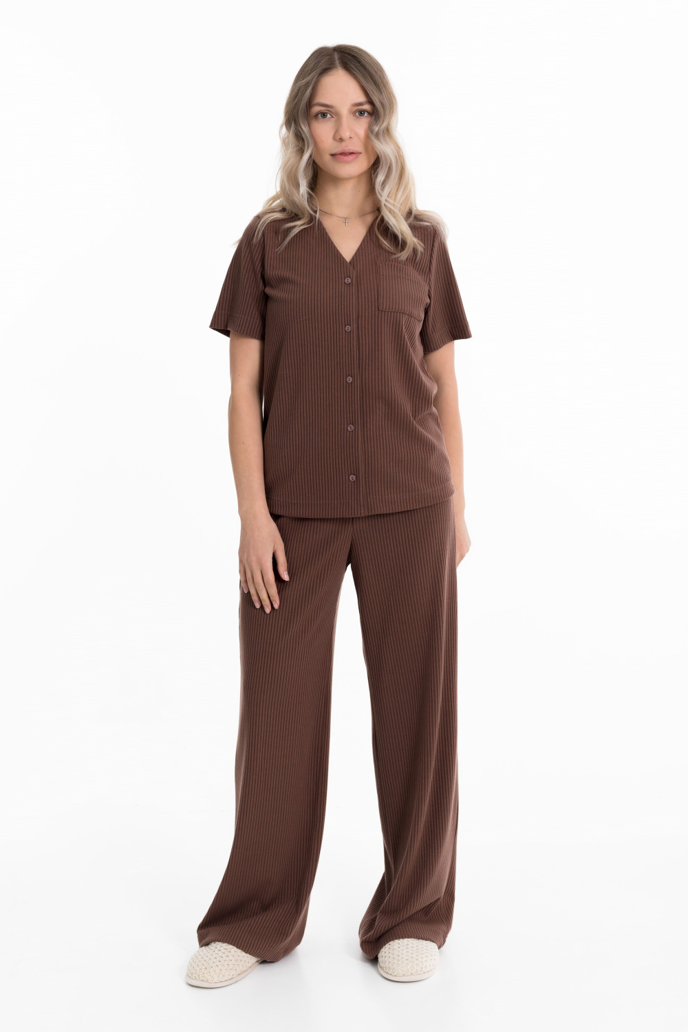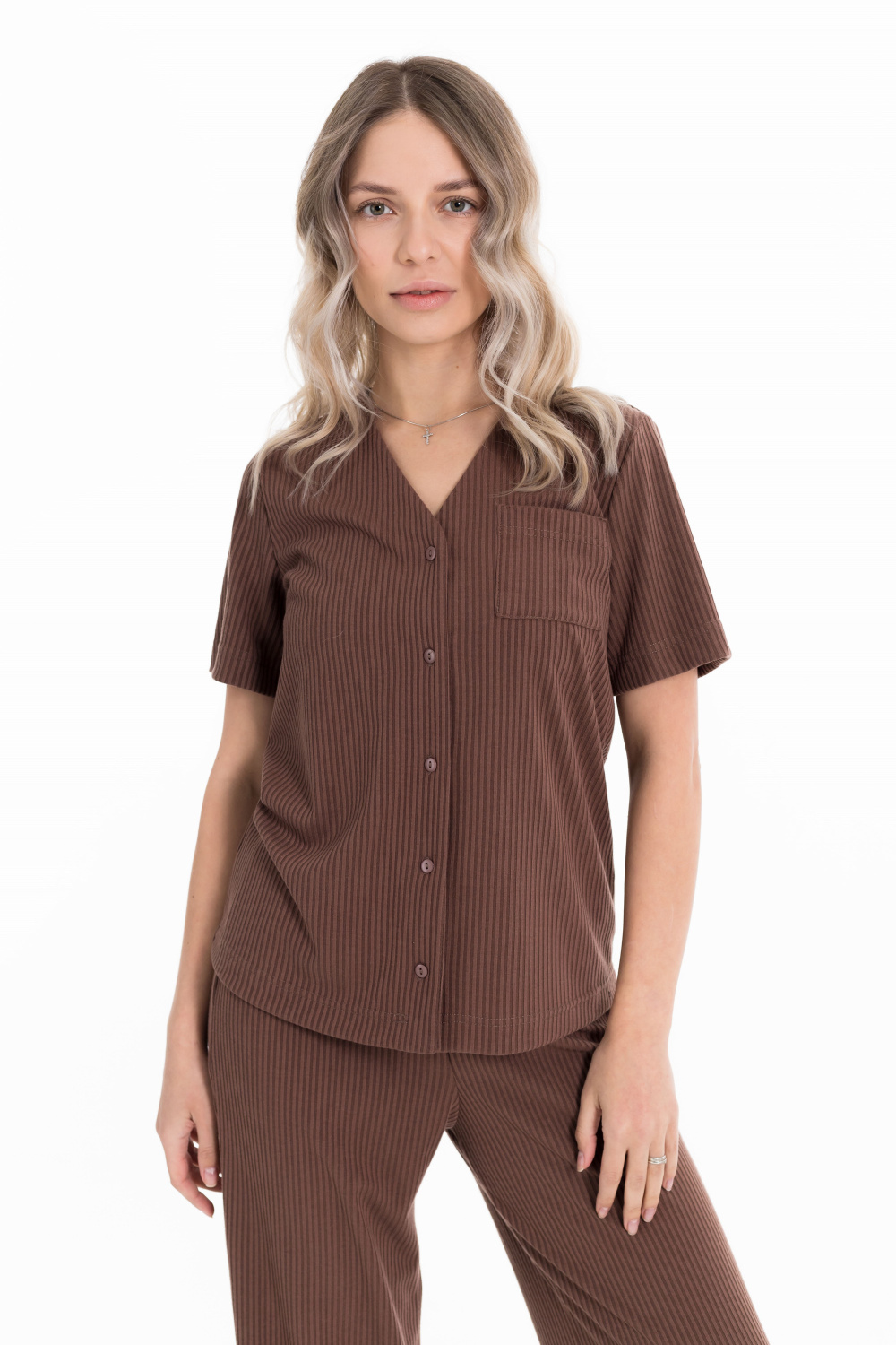 Пижама выполнена из кашкорсе с добавлением вискозы. Рубашка с коротким рукавом и застежкой на пуговицы спереди. Слева расположен небольшой нагрудный карман. Брюки свободные, с поясом на резине.