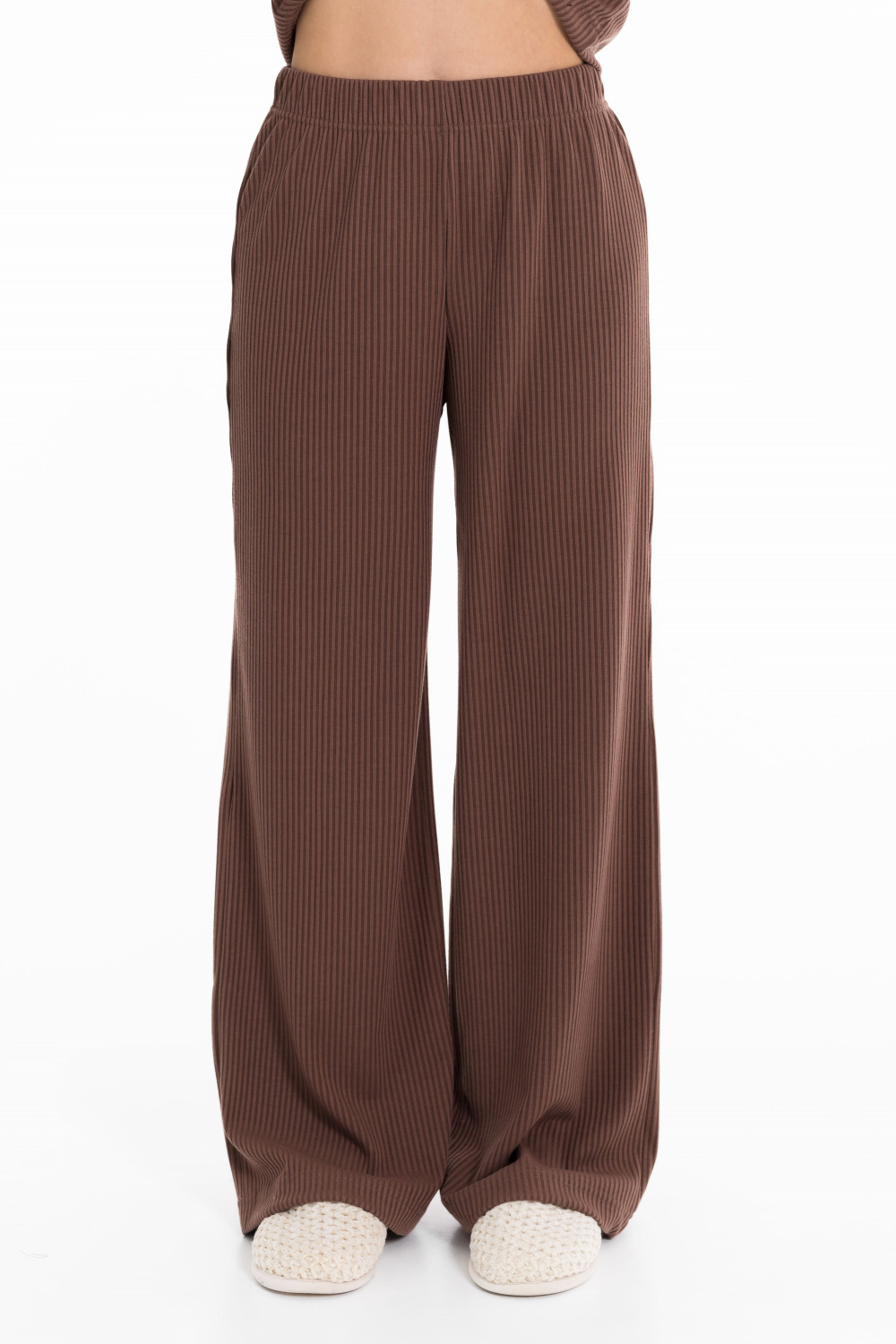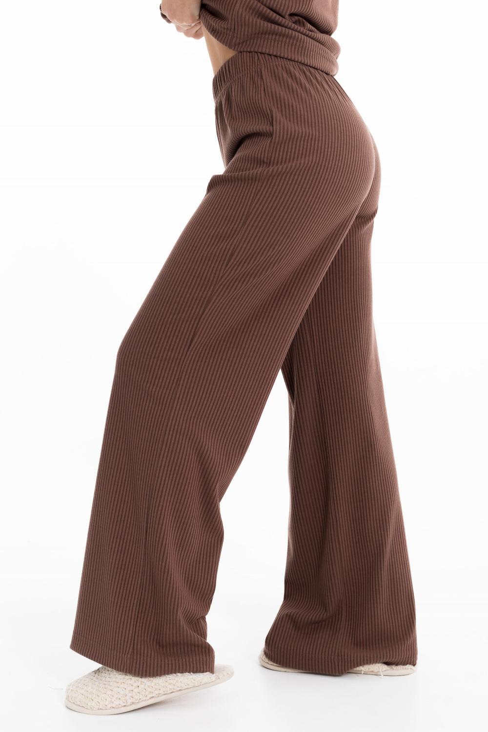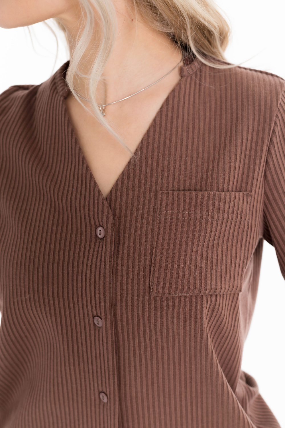 Пижама выполнена из кашкорсе с добавлением вискозы. Рубашка с коротким рукавом и застежкой на пуговицы спереди. Слева расположен небольшой нагрудный карман. Брюки свободные, с поясом на резине.