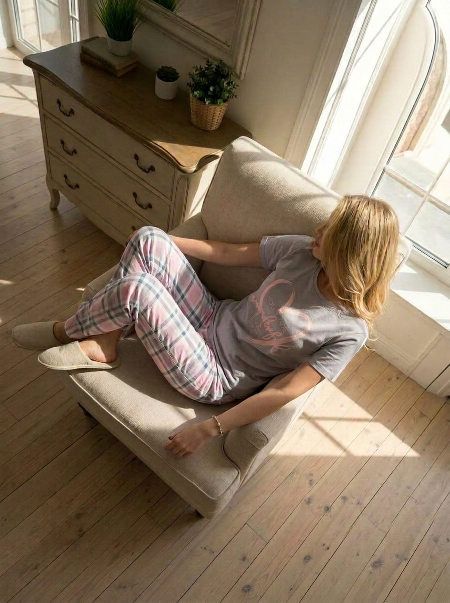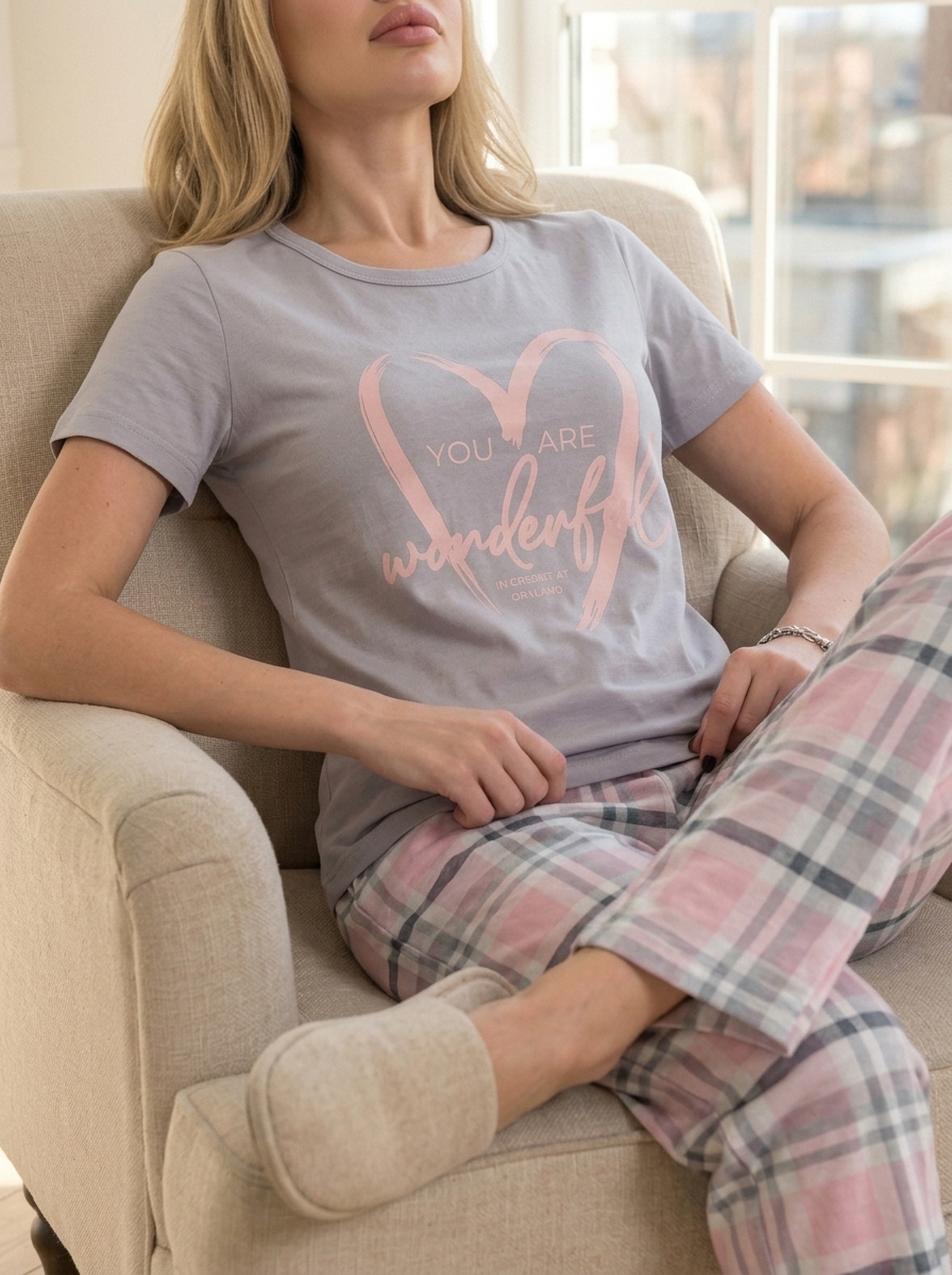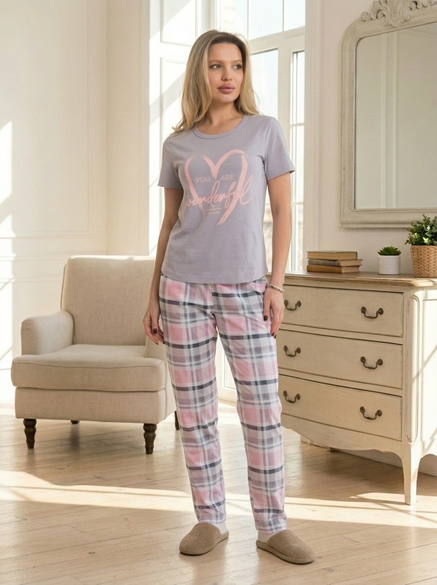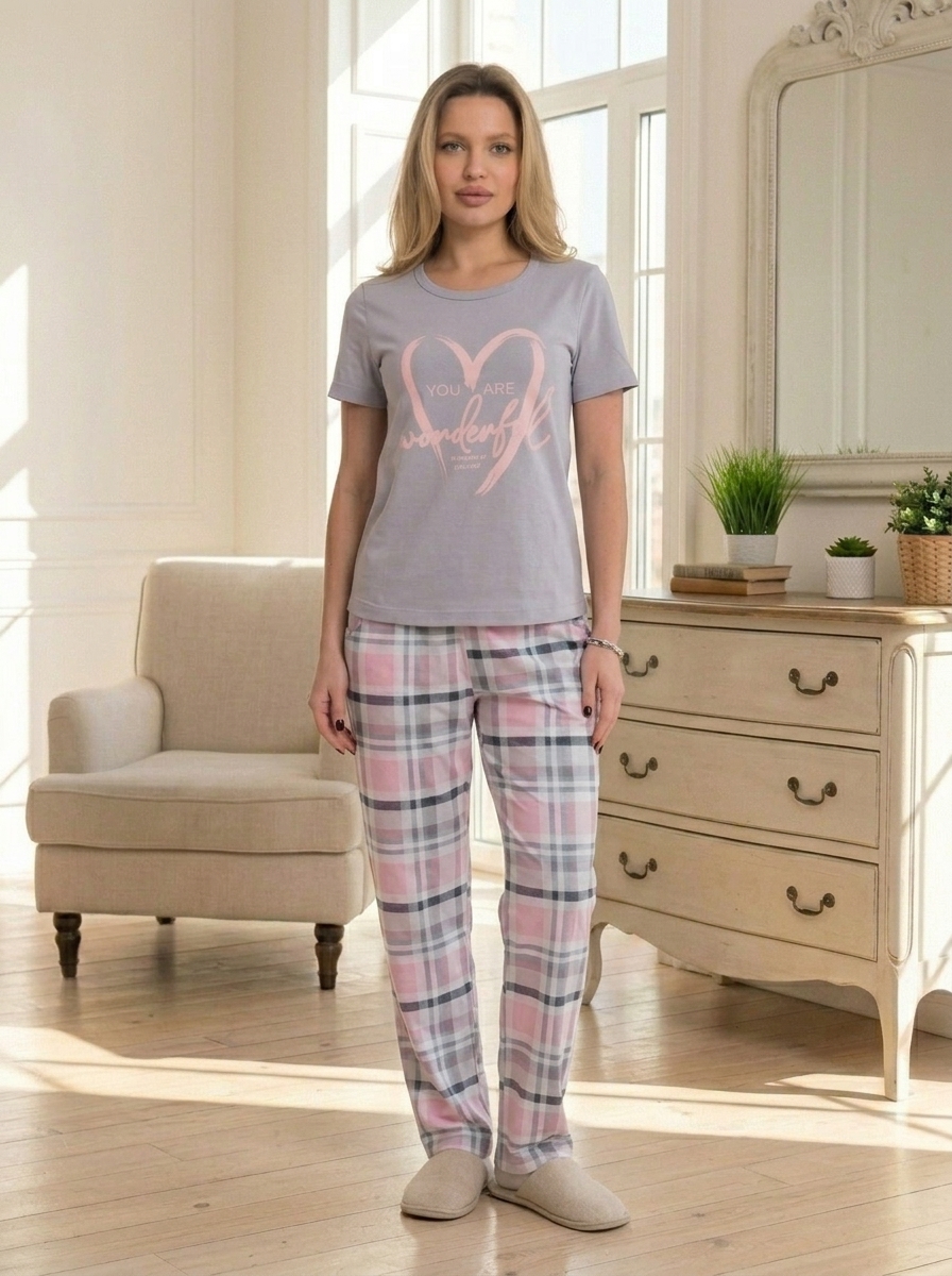 Женская пижама включает в себя футболку и брюки, выполненные из хлопкового полотна. Футболка прямого кроя с принтом, коротким рукавом и круглым вырезом горловины обеспечивает комфорт и свободу движений. Брюки с поясом на широкой резинке, обеспечивают идеальную посадку и удобство. Такой дизайн позволяет свободно двигаться и чувствовать себя комфортно даже во время сна.