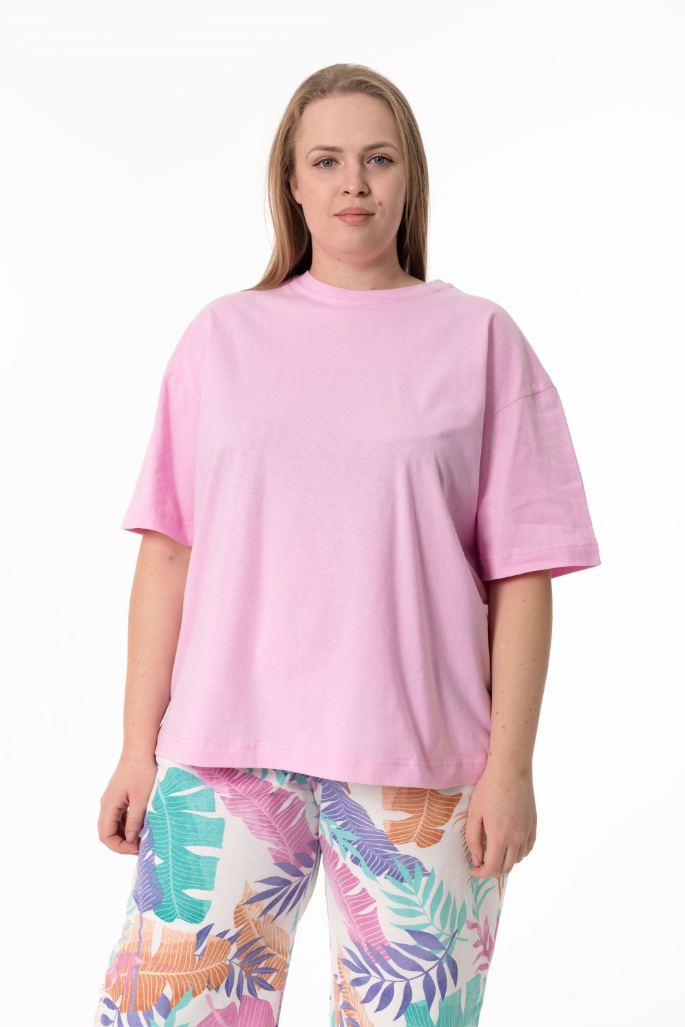 Пижама выполненная из кулирки и состоящая из футболки и капри — комфортный и свободный комплект для сна и домашнего отдыха. Футболка из однотонной кулирки легкого оверсайз кроя со спущенным рукавом длиной до локтя. Капри из набивной кулирки с цельнокроенным широким поясом, боковыми карманами и расклешенным силуэтом книзу обеспечивают удобство и комфорт.
