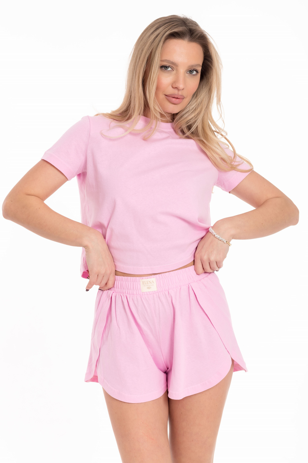 Женская пижама из однотонной кулирки сочетает комфорт и современный дизайн. Укороченная футболка с коротким рукавом выполнена в слегка свободном крое, создающим лёгкий и непринуждённый силуэт. Шорты выполнены с притачным поясом, украшенным фирменным логотипом, и запахиваются в боковой части, придавая модели оригинальный и современный вид. Пижама отлично подойдёт для комфортного сна и домашнего отдыха.