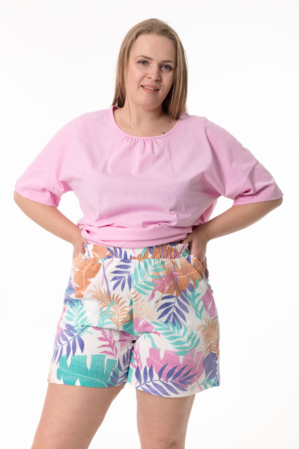 Пижама выполненная из кулирки и состоящая из шорт и футболки — комфортный и женственный комплект для сна и домашнего отдыха. Футболка из однотонной кулирки с коротким спущенным рукавом и декоративной сборкой по горловине имеет длину примерно до линии бедер. Шорты средней длины из набивной кулирки прямого кроя с притачным поясом и боковыми карманами на поясе обеспечивают удобство и завершенный внешний вид модели.