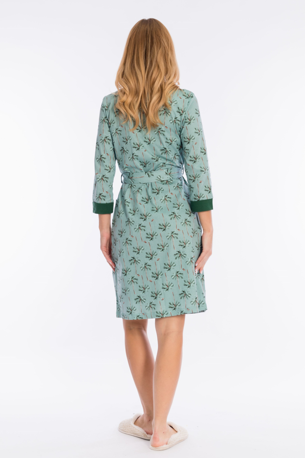 Комплект домашний состоит из халата и сорочки, выполненных из кулирки, 100% хлопок. Халат на запах, с втачным рукавом длиной 3/4. Планки по борту, низу рукавов и на карманах из отделочного полотна. Сорочка на тонких бретелях.