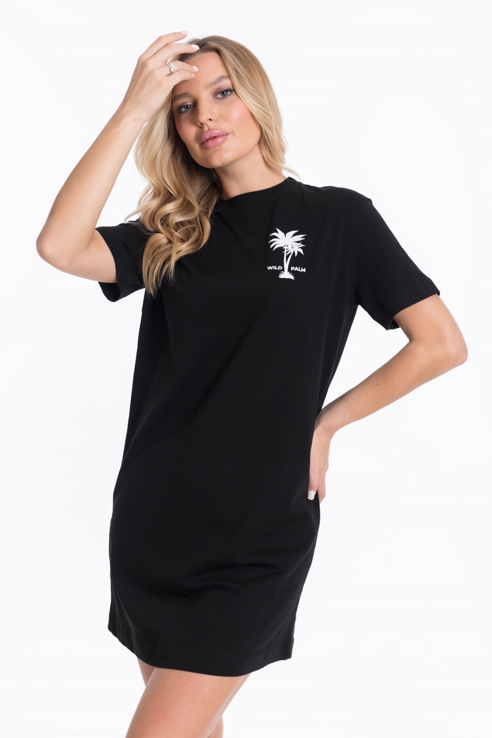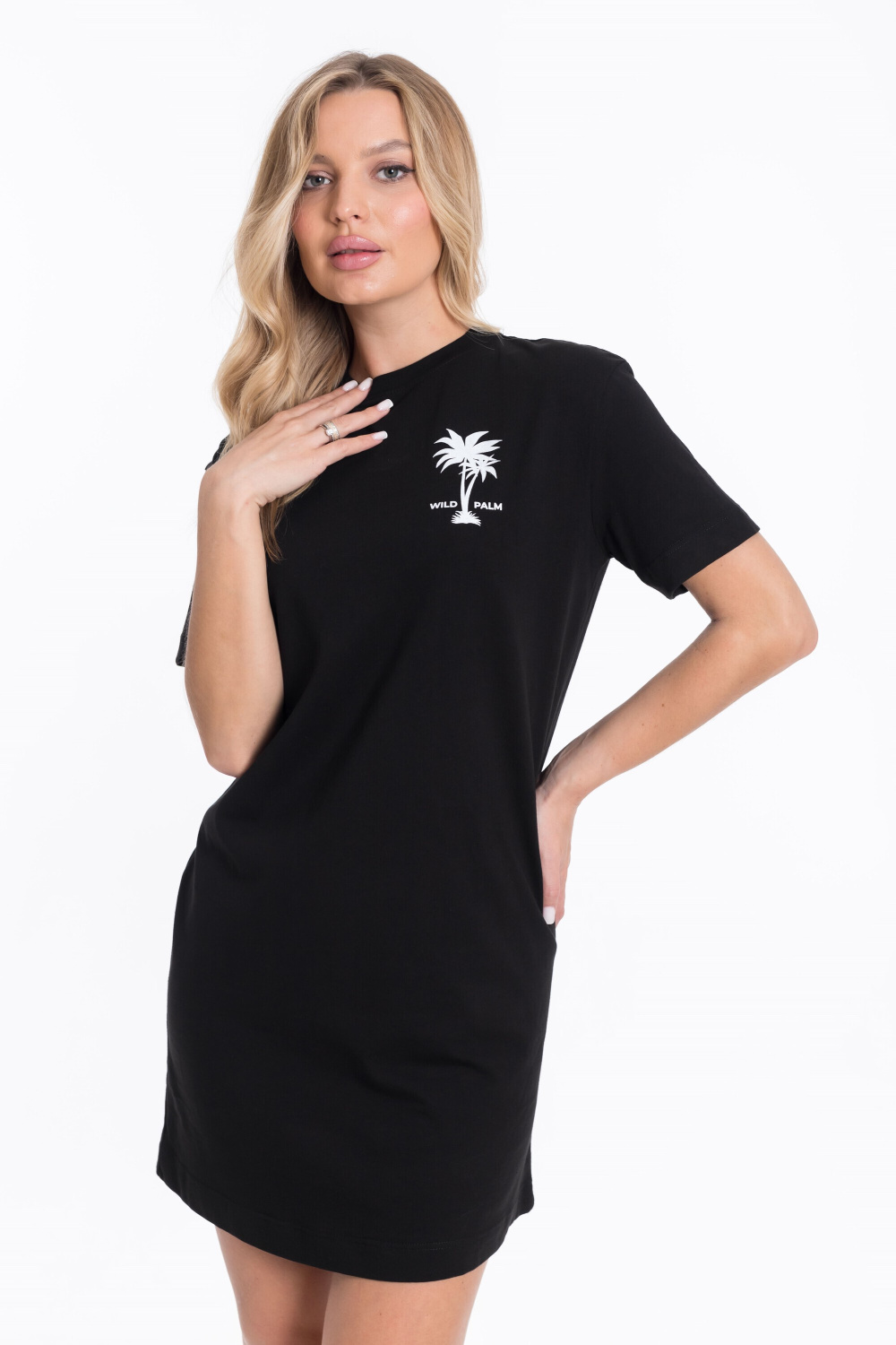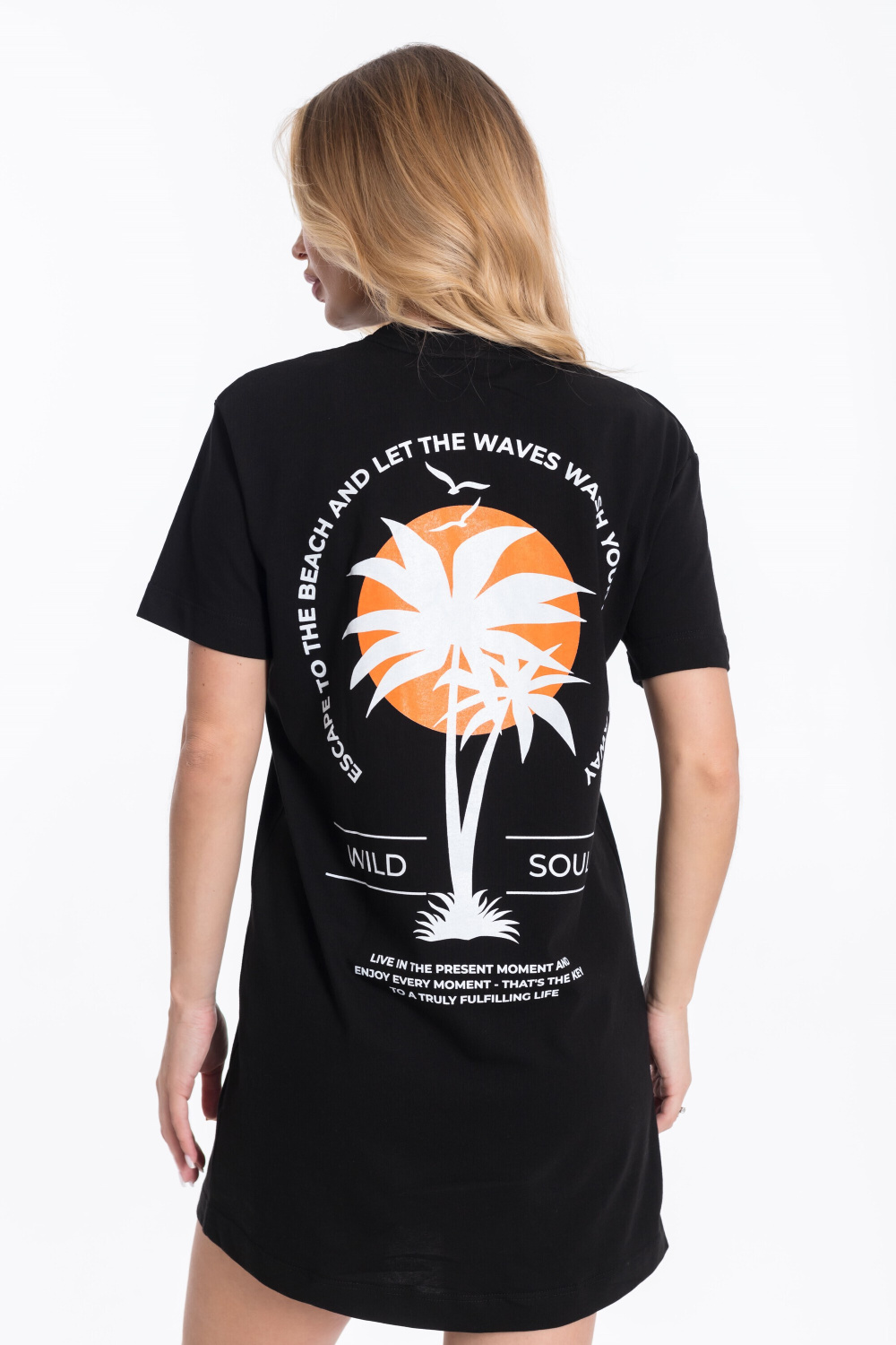 Женская футболка-платье — стильный и комфортный вариант для повседневной носки. Изготовленная из однотонной ткани, она обеспечивает свободу движений и удобство в течение дня. Короткий рукав и принт на спинке и полочке придают изделию оригинальность. Низ с закруглениями к боковым швам добавляет платью женственности. Такая футболка-платье подойдёт для прогулок, неформальных встреч или отдыха. Её можно сочетать с различными аксессуарами и обувью.