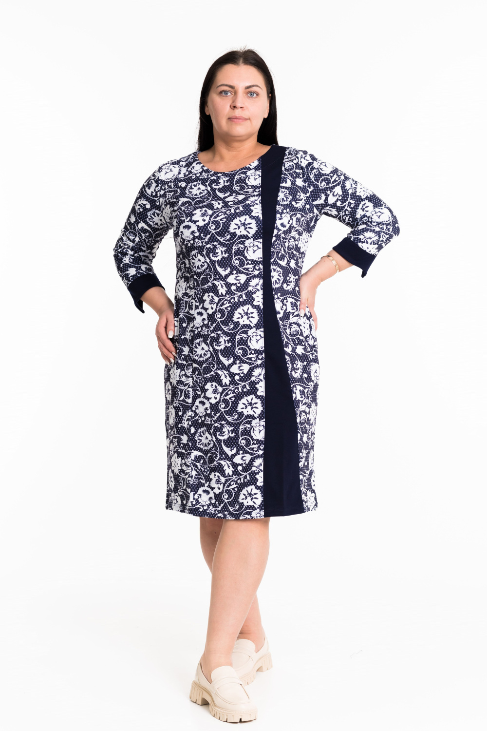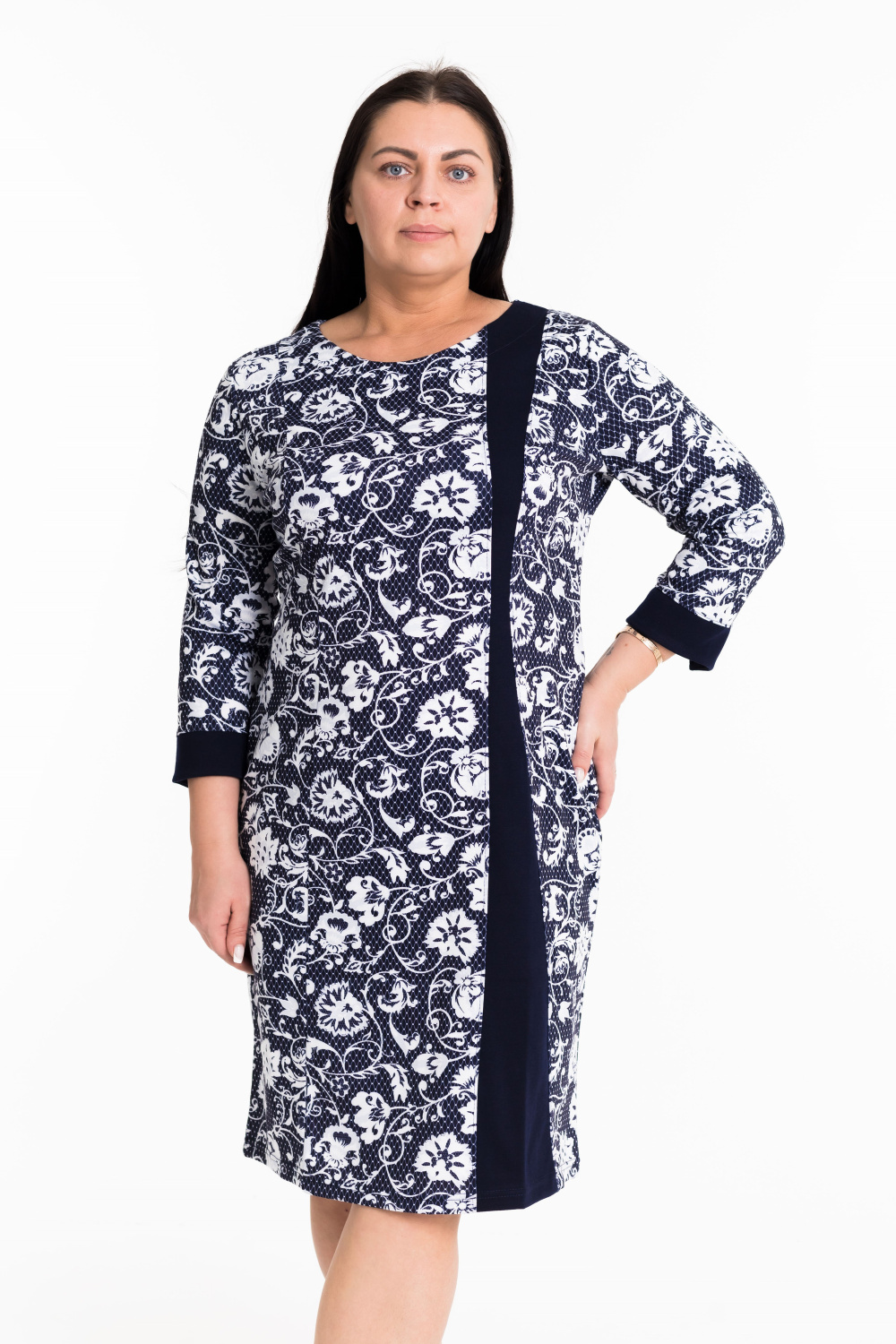Женское платье выполнено из полотна академик. Горловина имеет круглый вырез, рукава длинные. В качестве отделки однотонные вставки из отделочного полотна.