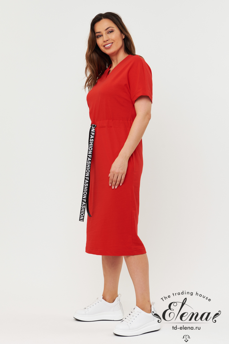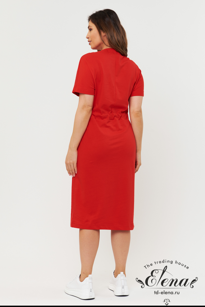 Платье выполнено из х/б полотна. Вырез горловины фигурный, рукава короткие. В кулисе по талии вставлена тесьма с надписью. По бокам размещены карманы.