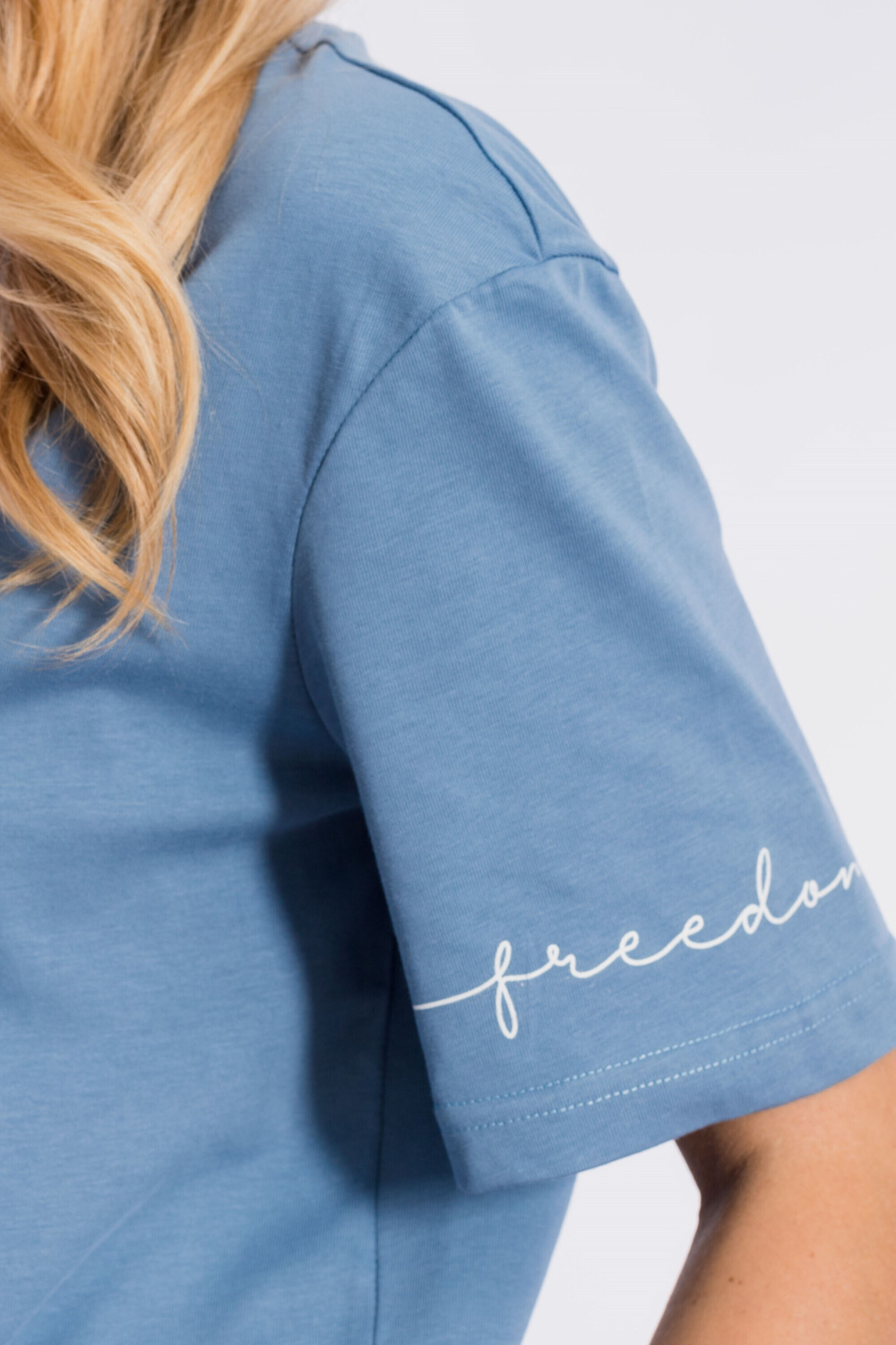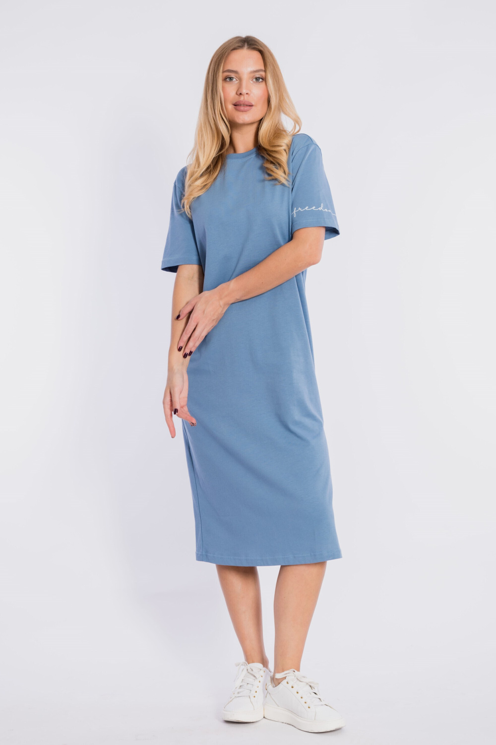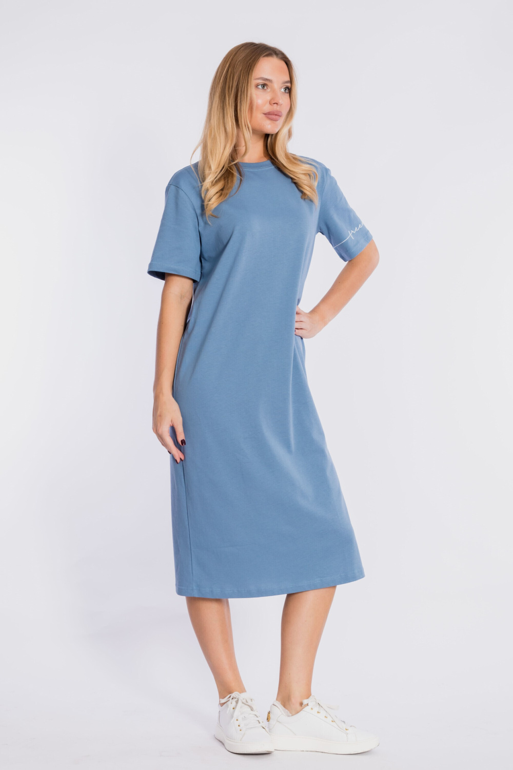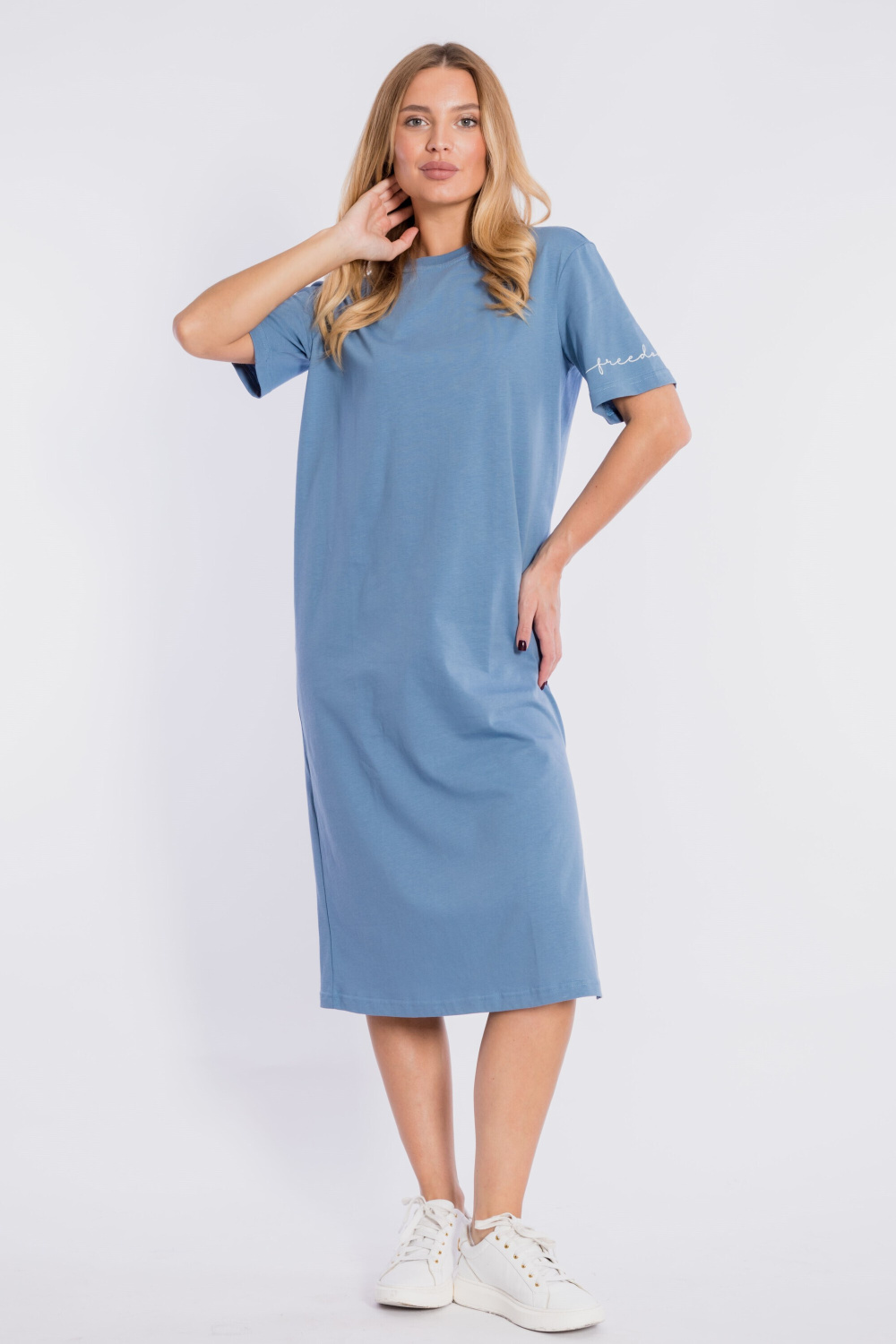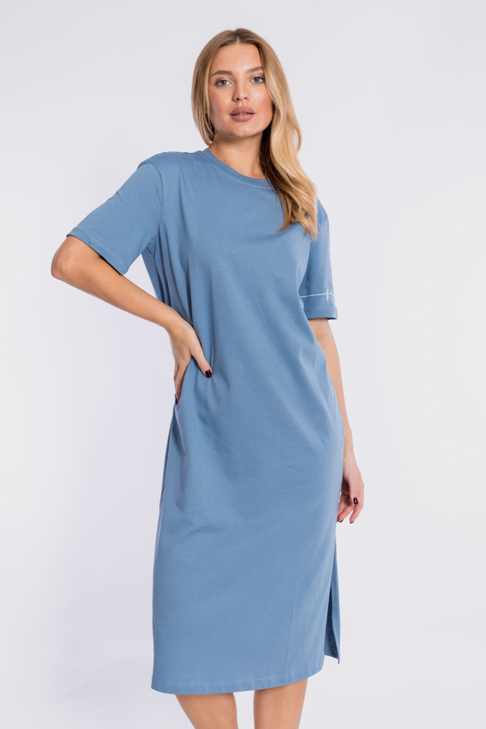 Платье выполнено из хлопкового полотна. Платье свободного силуэта со спущенной линией плеча. Круглый вырез горловины оформлен планкой. Рукава длиной до локтя, на левом рукаве нанесён принт. Внизу изделия, в левом боковом шве расположен разрез.