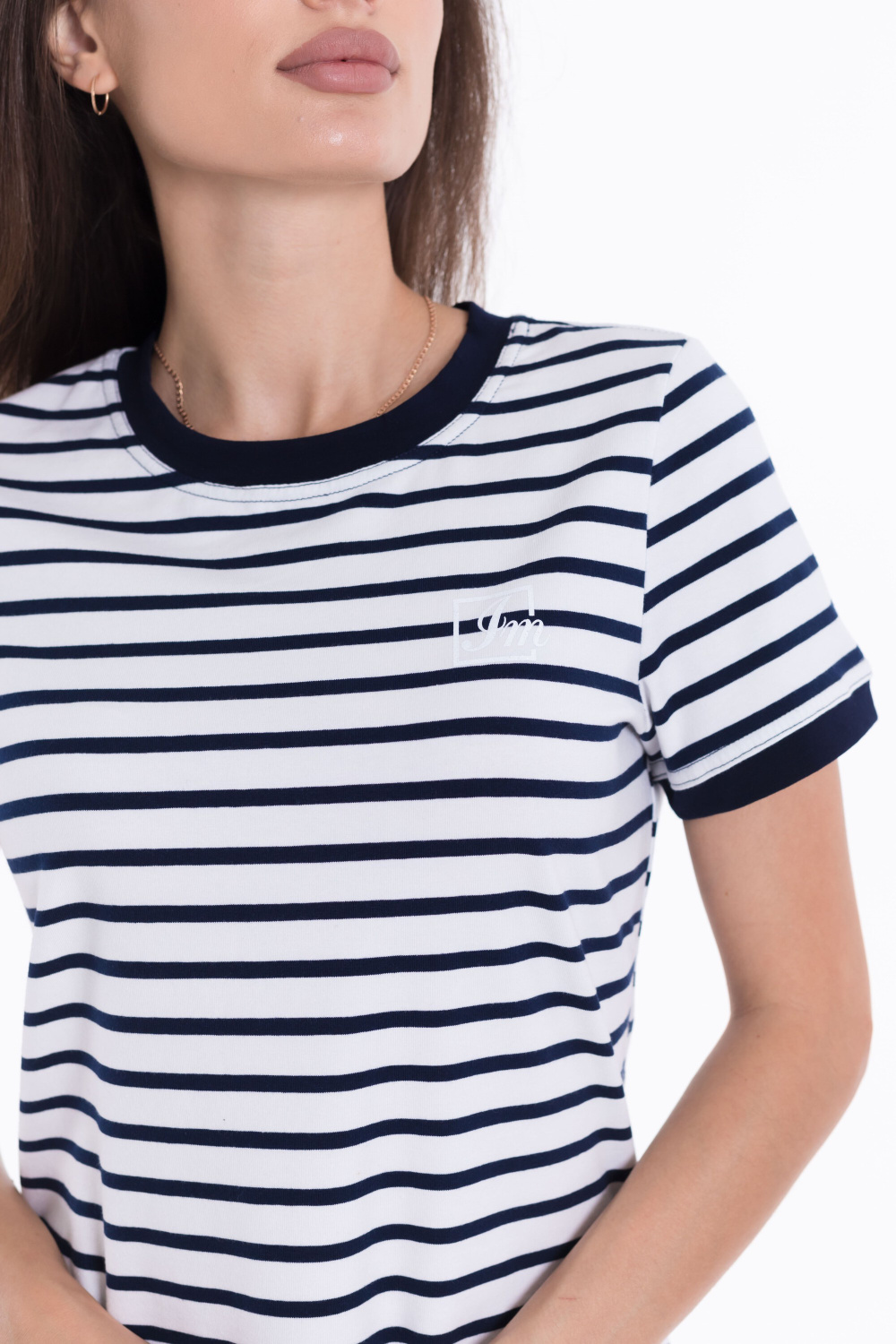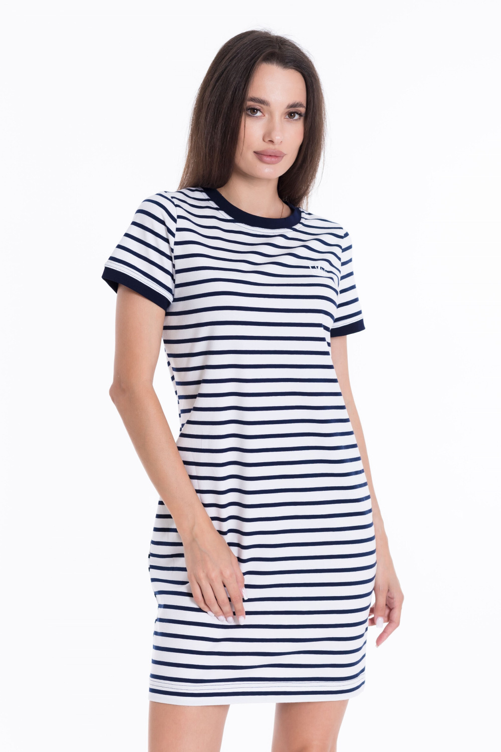 Летнее платье облегающего силуэта. Круглый вырез горловины и низ рукавов оформлены планками. Спереди термопечать.