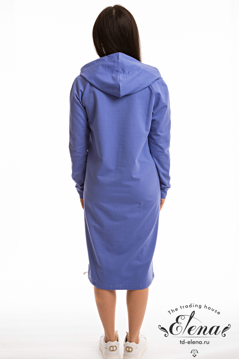 Платье выполнено из футера с лайкрой. Спереди расположен карман "кенгуру" и нанесён оригинальный принт. В капюшоне и по низу платья вставлен шнур. С левой стороны, снизу, расположен небольшой разрез.