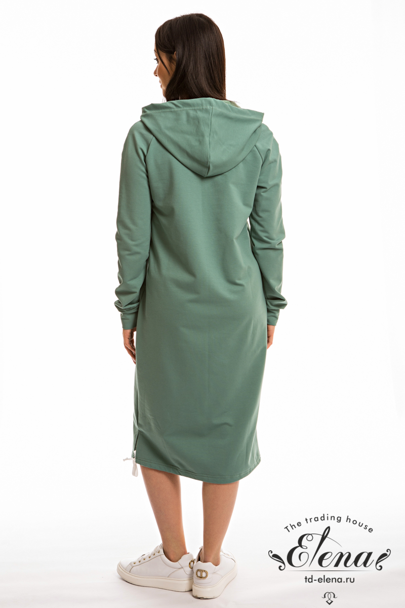 Платье выполнено из футера с лайкрой. Спереди расположен карман "кенгуру" и нанесён оригинальный принт. В капюшоне и по низу платья вставлен шнур. С левой стороны, снизу, расположен небольшой разрез.