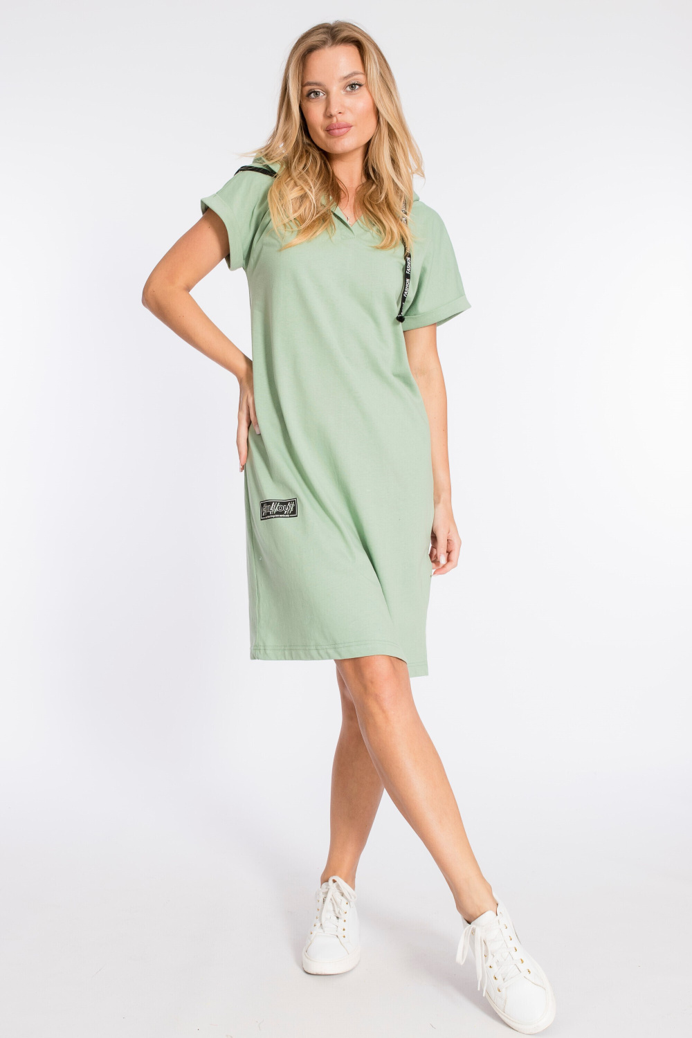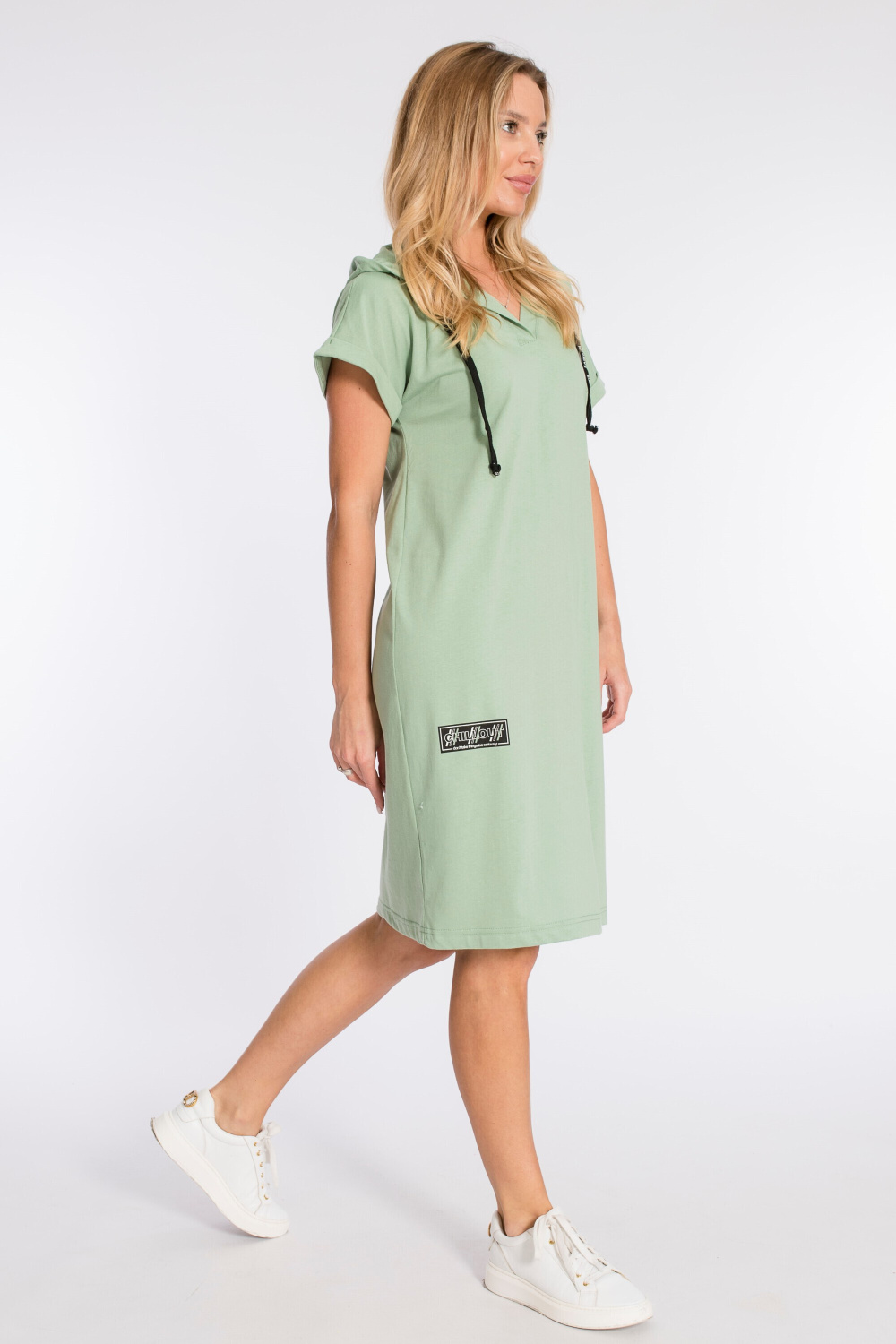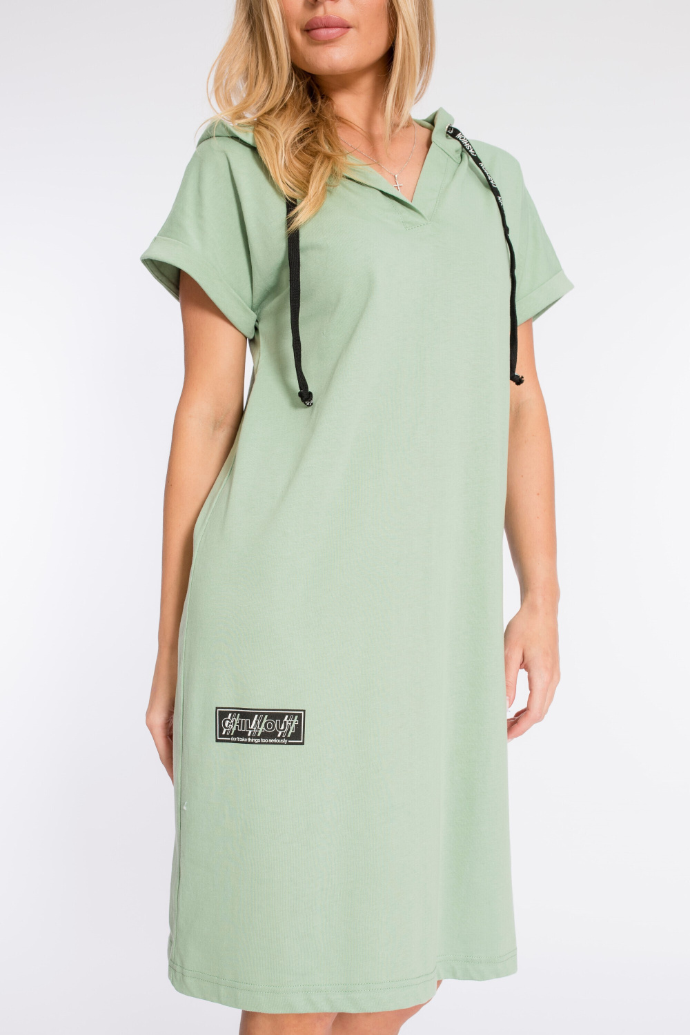 Платье выполнено из плотной однотонной кулирки. Ширина капюшона регулируется при помощи шнура. Линия плеча спущена, рукава короткие, манжета с отворотом. С левой стороны, снизу, расположен небольшой разрез, с правой -  нанесён принт.