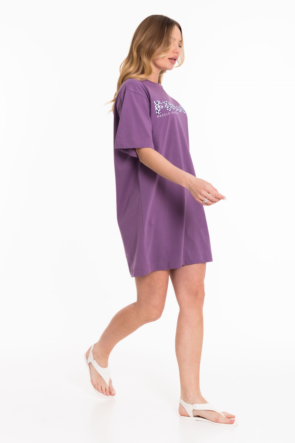 Платье свободного силуэта выполнено из однотонной кулирки. С коротким рукавом и принтом спереди. Круглый вырез горловины оформлен планкой.