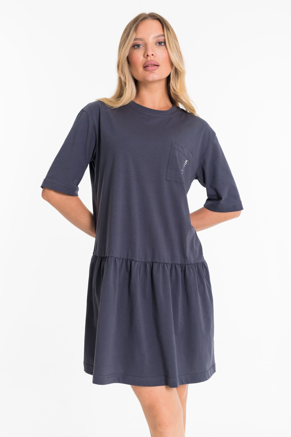 Платье свободного покроя выполнено из однотонной кулирки. Платье со спущенным рукавом, юбка слегка присборенная, с заниженной линией талии. С левой стороны накладной карман с принтом.