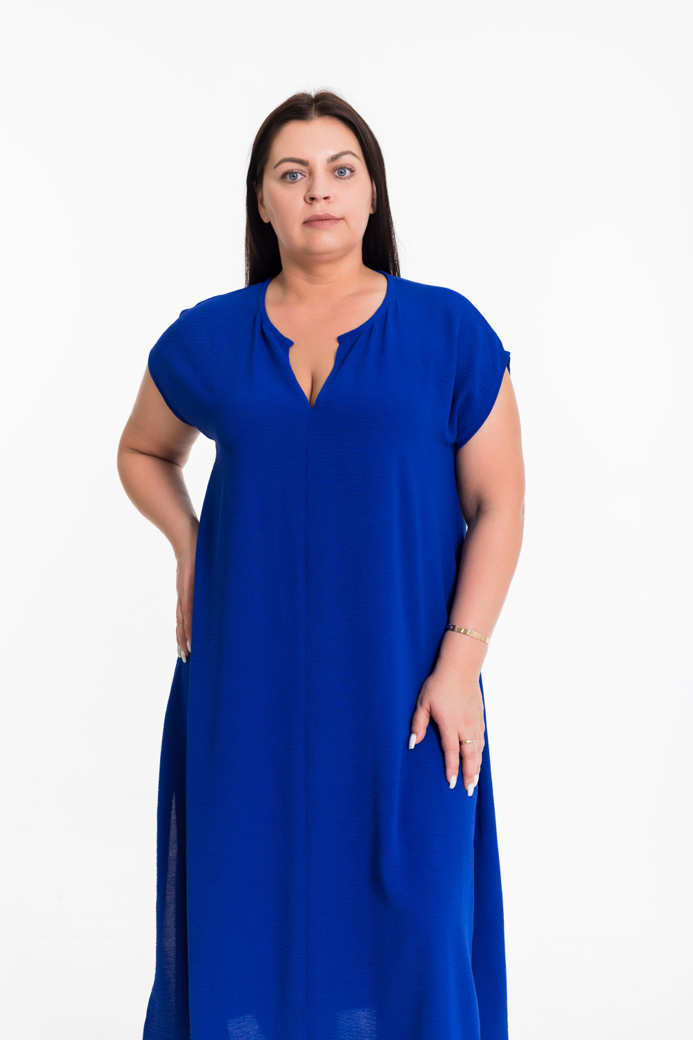 Платье выполнено из полотна "манго". Платье свободного силуэта, удлинённое, со спущенной линией плеча и декоративными разрезами по бокам снизу.