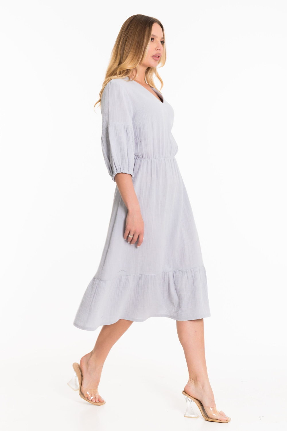Платье выполнено из однотонного муслина серо-голубого цвета. Рукав втачной с отрезной нижней частью в виде фонарика. Горловина с V-образным вырезом, юбка визу с широкой оборкой.