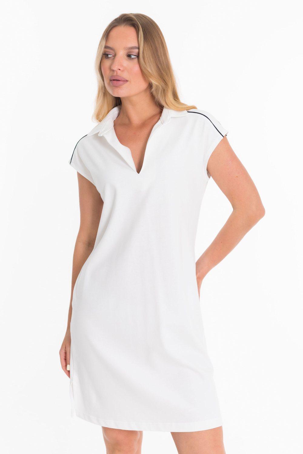Платье выполнено из однотонной плотной кулирки. Платье с отложным воротником на отрезной стойке, со спущенной линией плеча и декором в виде канта. По низу боковых швов платья выполнены декоративные разрезы.