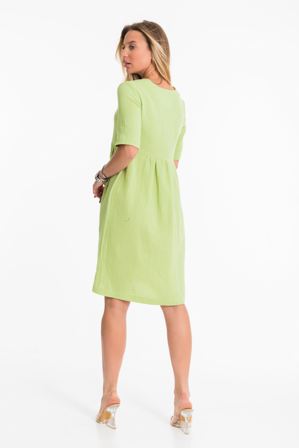 Платье выполнено из однотонного муслина. С отрезной завышенной линией талии, юбка со сборками. Рукав втачной до локтя. Горловина с V-образным вырезом. Длина платья чуть выше колена.