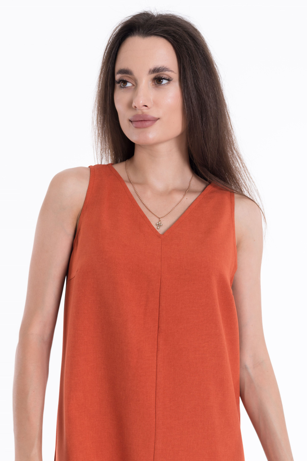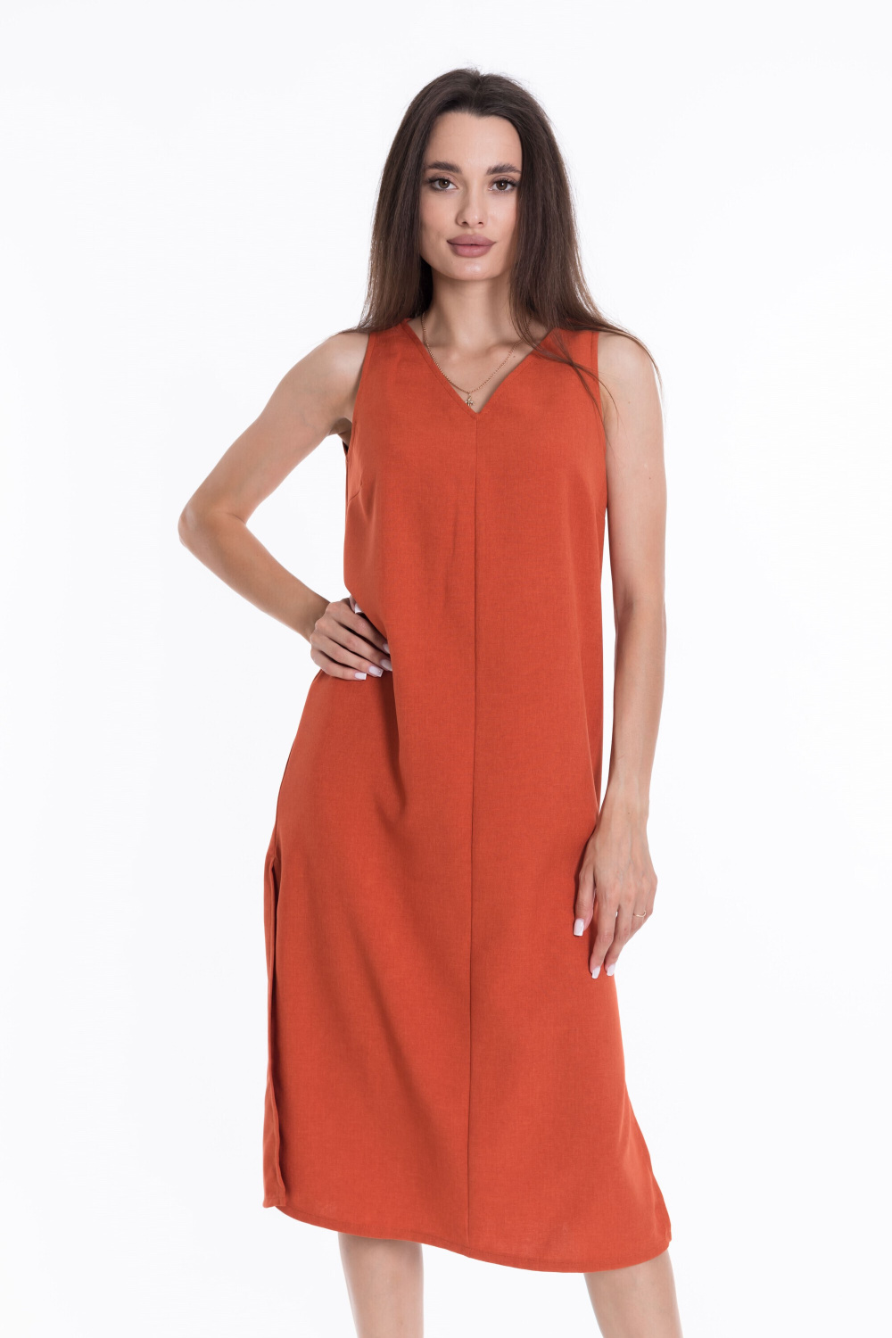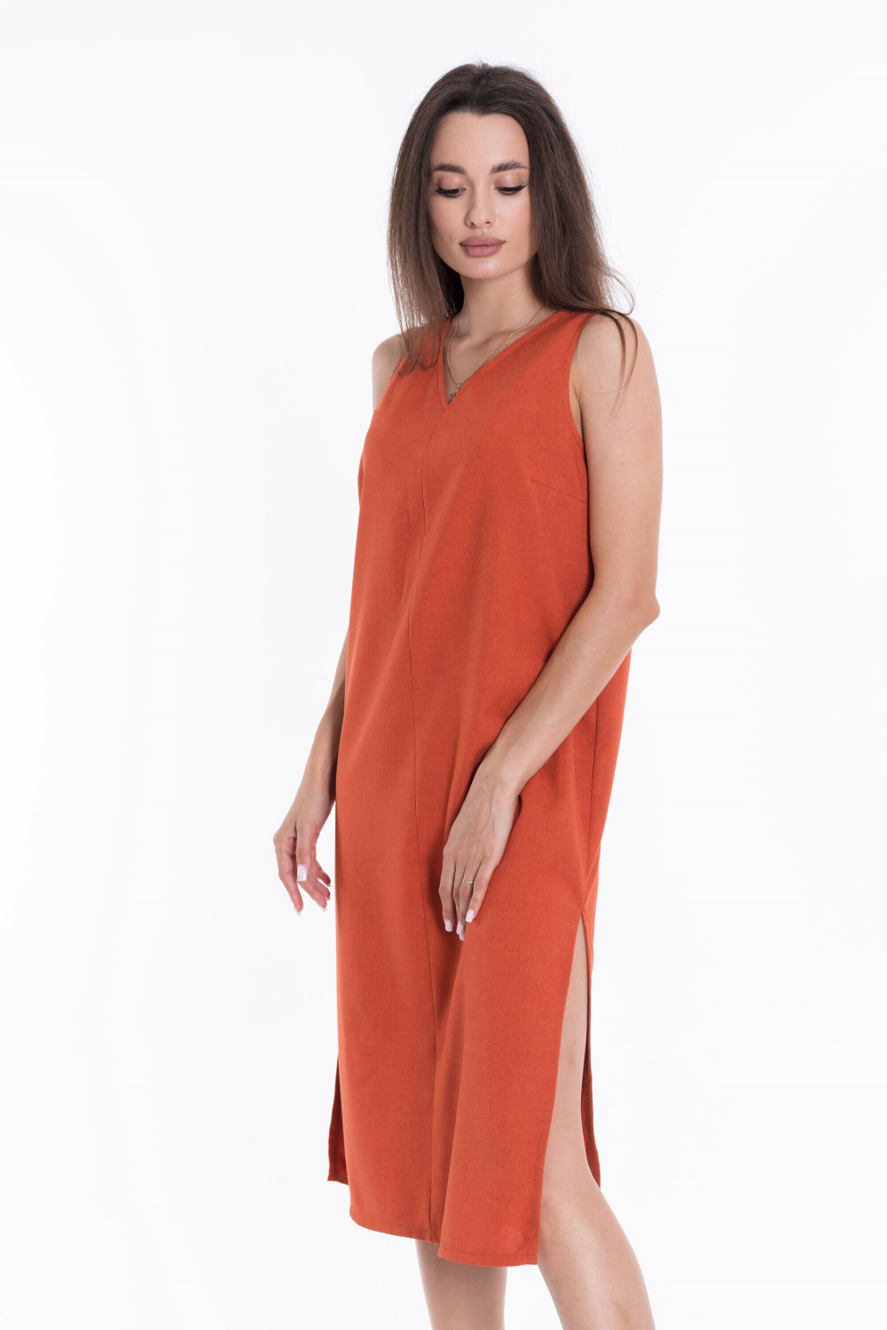 Платье из полотна "искусственный лен". Свободный силуэт, V-образный вырез горловины, средний шов по центру спинки и полочки делает платье особенно элегантным, в боковых швах разрезы.