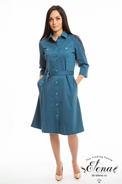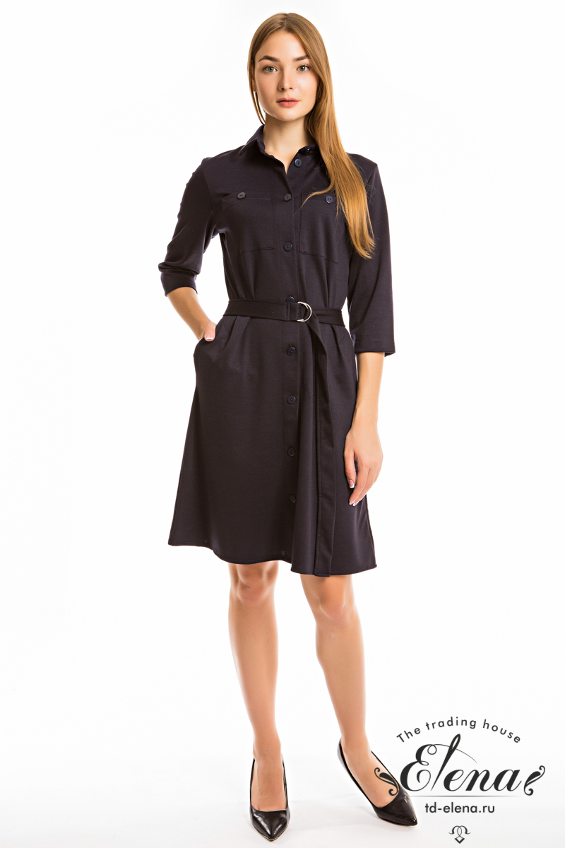 Платье выполнено из однотонного академика. Рукава длиной 3/4 и застёжка на пуговицы по всей длине изделия. Спереди и в боковых швах платья расположены карманы, линия талии подчеркивается поясом.