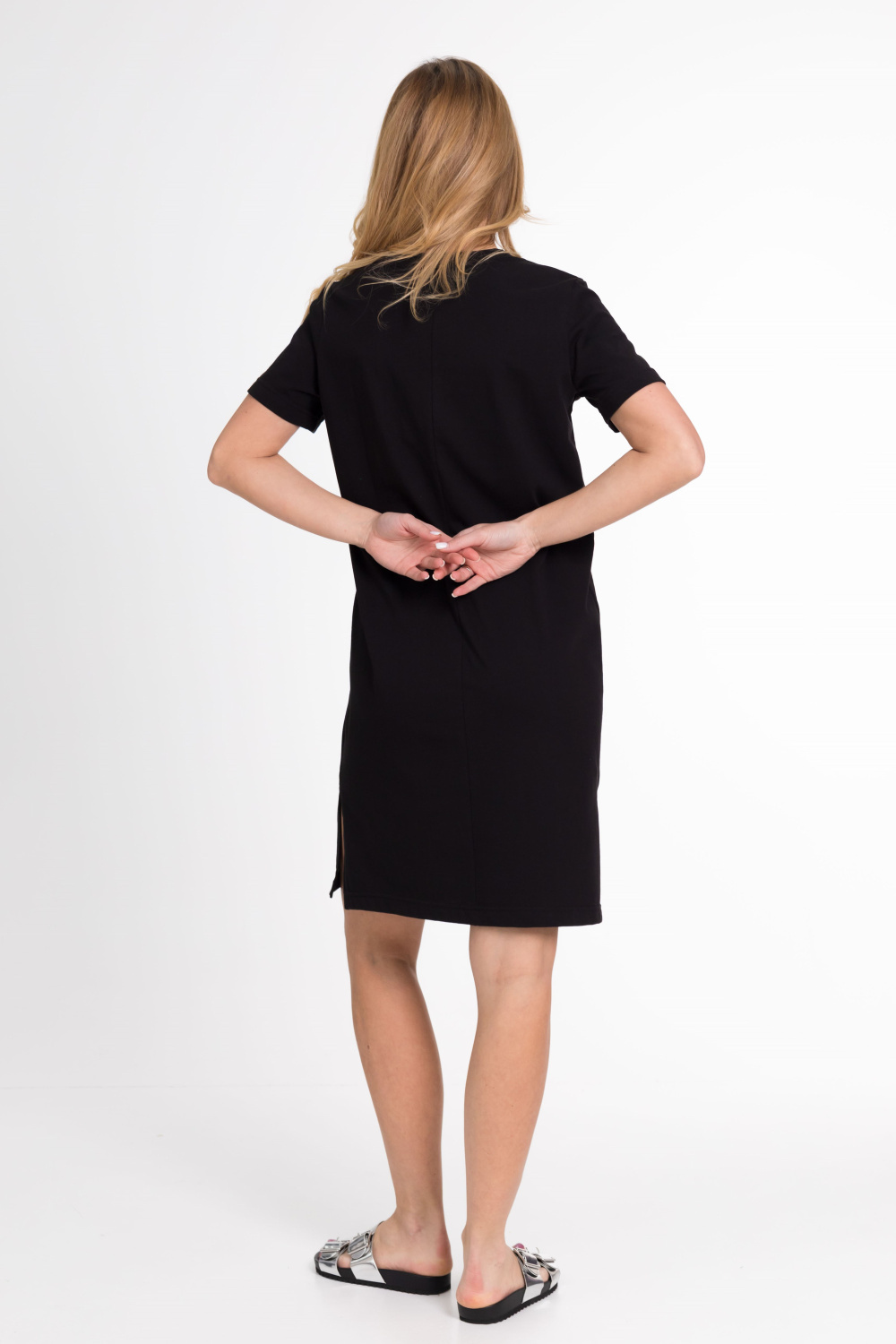 Платье из х/б полотна. В боковых швах внизу разрезы, на полочке принт, рукава короткие, горловина оформлена притачной планкой.