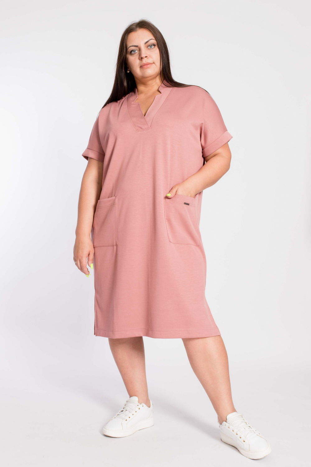 Платье выполнено из интерлочного полотна. Силуэт свободный, горловина имеет фигурный V-образный вырез, спереди размещены два накладных кармана. Низ платья с разрезами по бокам.