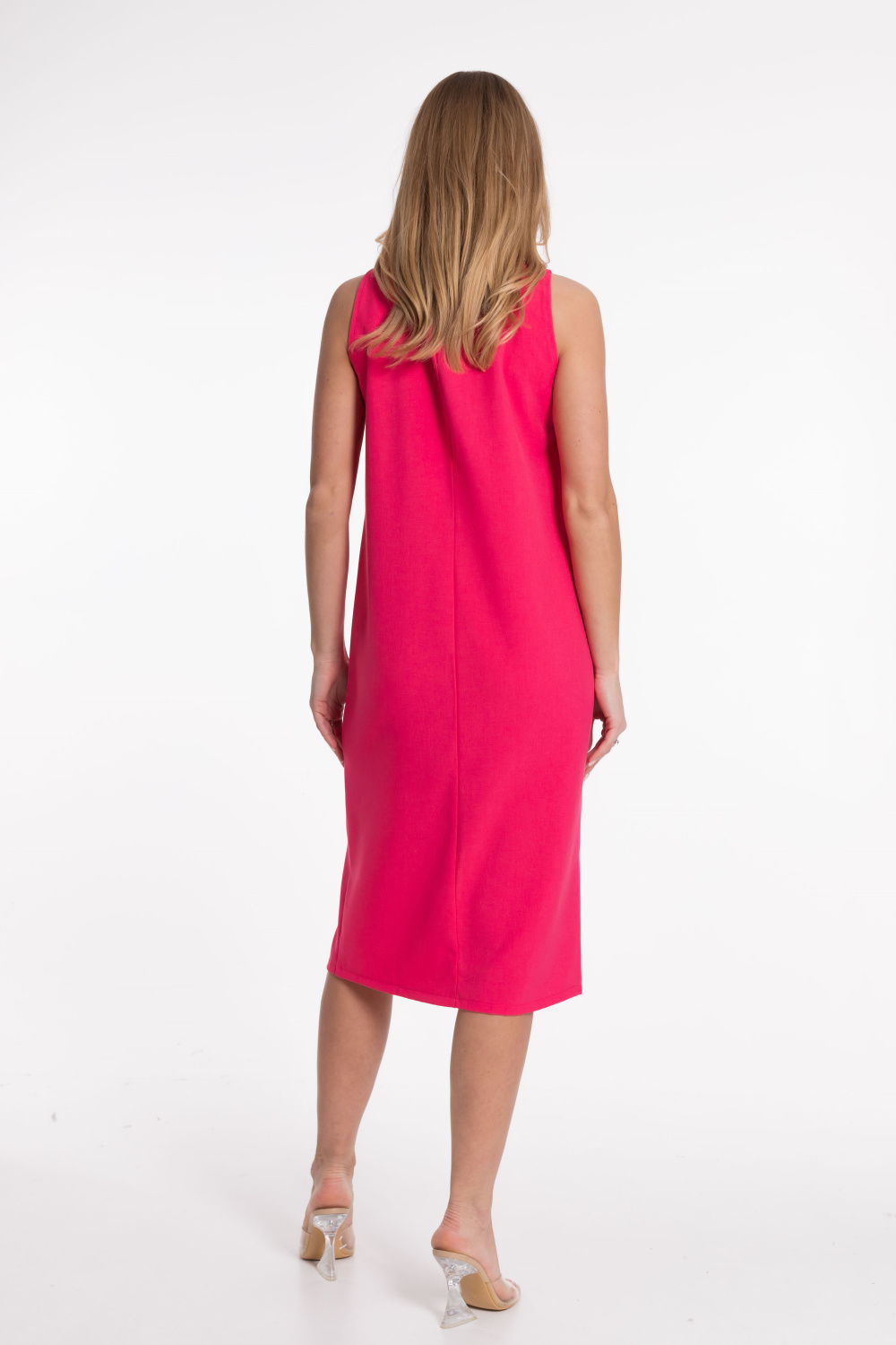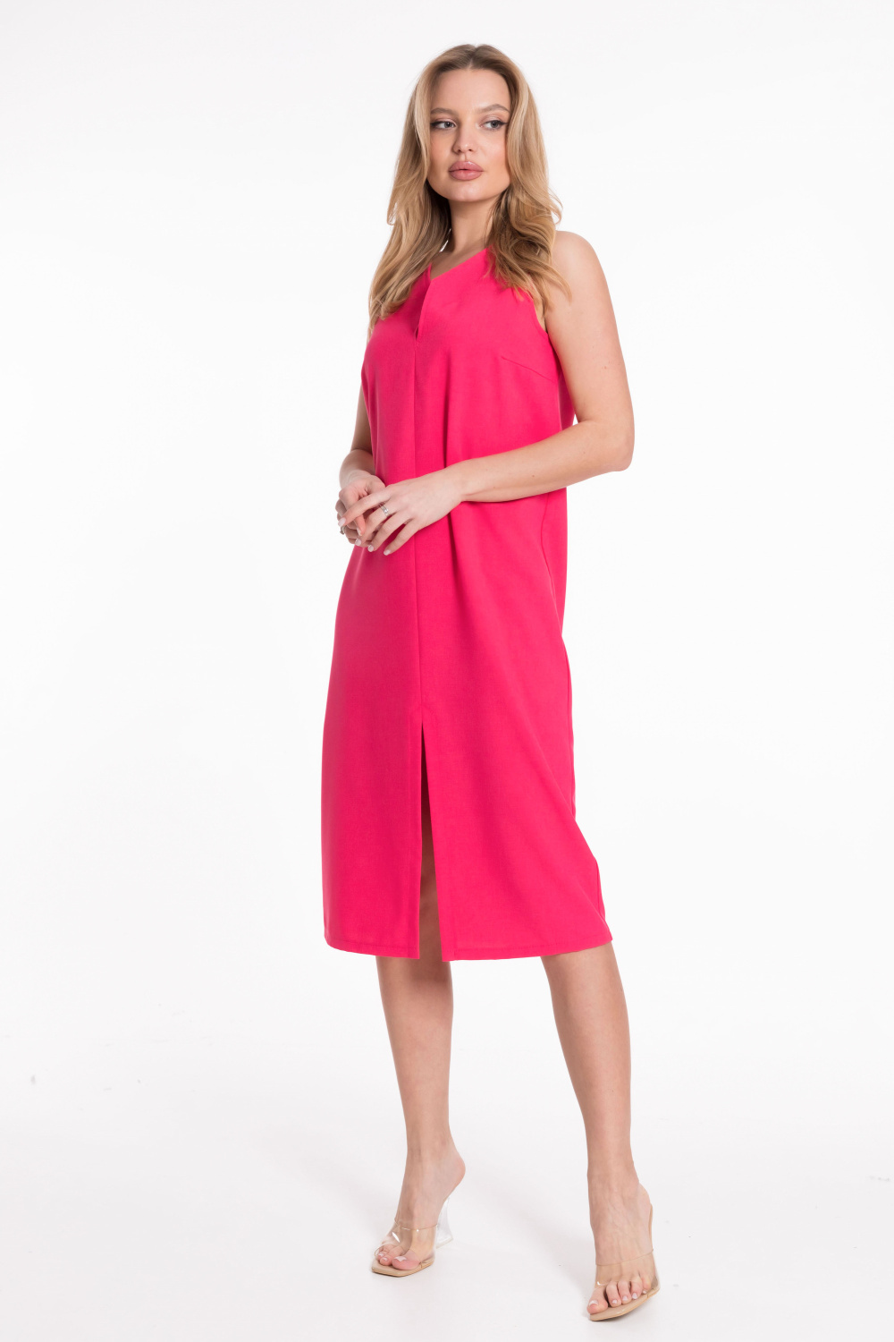 Платье из полотна "искусственный лен" прямого силуэта, в переднем шве разрез.
