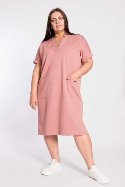 Платье со спущенной линией плеча выполнено из кулирки. Отрезное по линии талии, с кулиской, в которую продёрнут шнур. По бокам размещены карманы. По низу боковых швов разрезы.