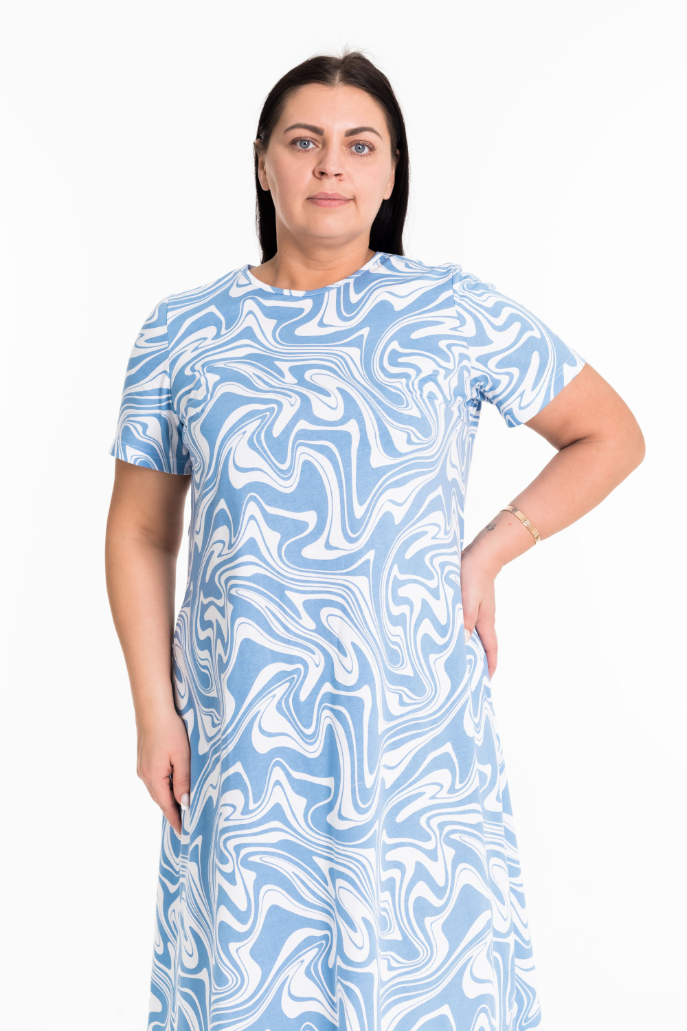 Женское платье свободного силуэта выполнено из х/б полотна. По бокам декоративные разрезы, горловина оформлена бейкой. В боковых швах размещены карманы.