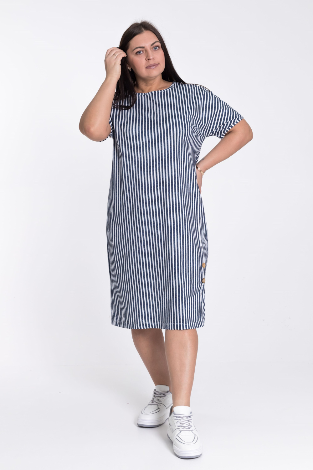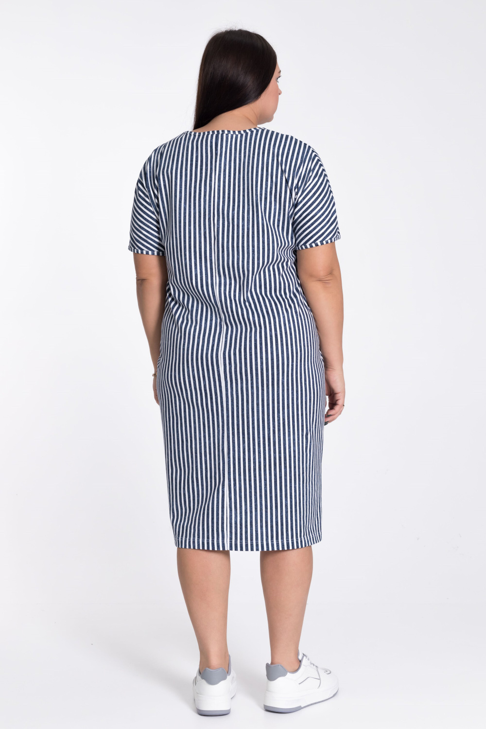 Платье из х/б полотна в вертикальную полоску, что зрительно делает силуэт фигуры стройным.