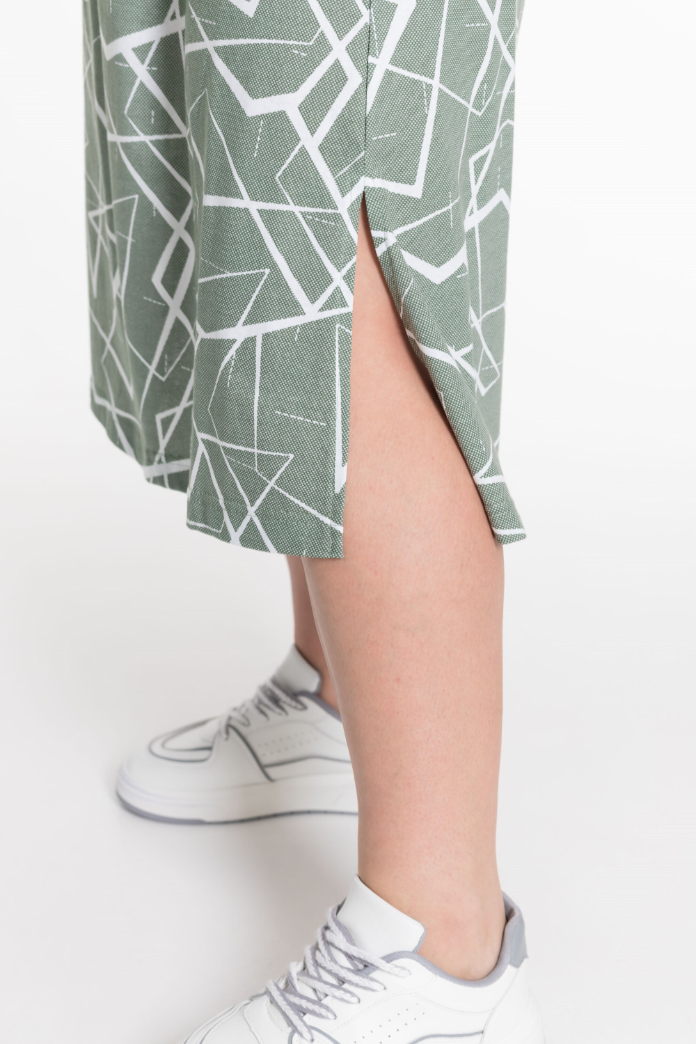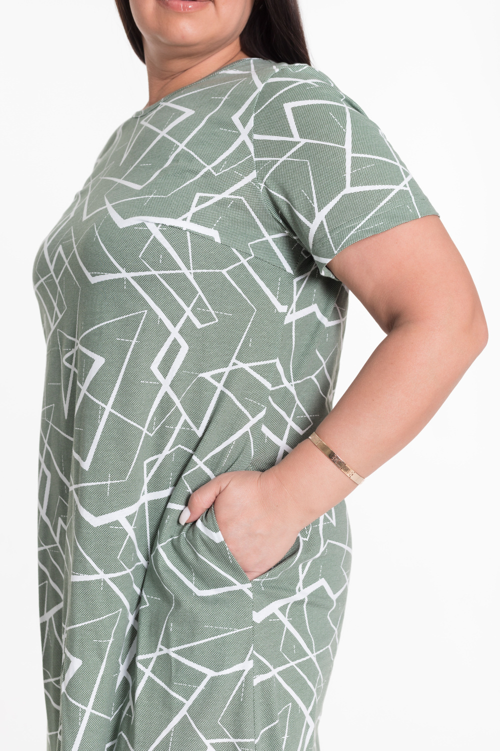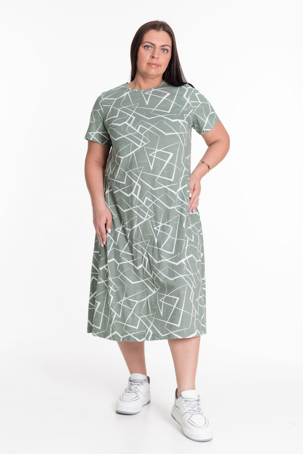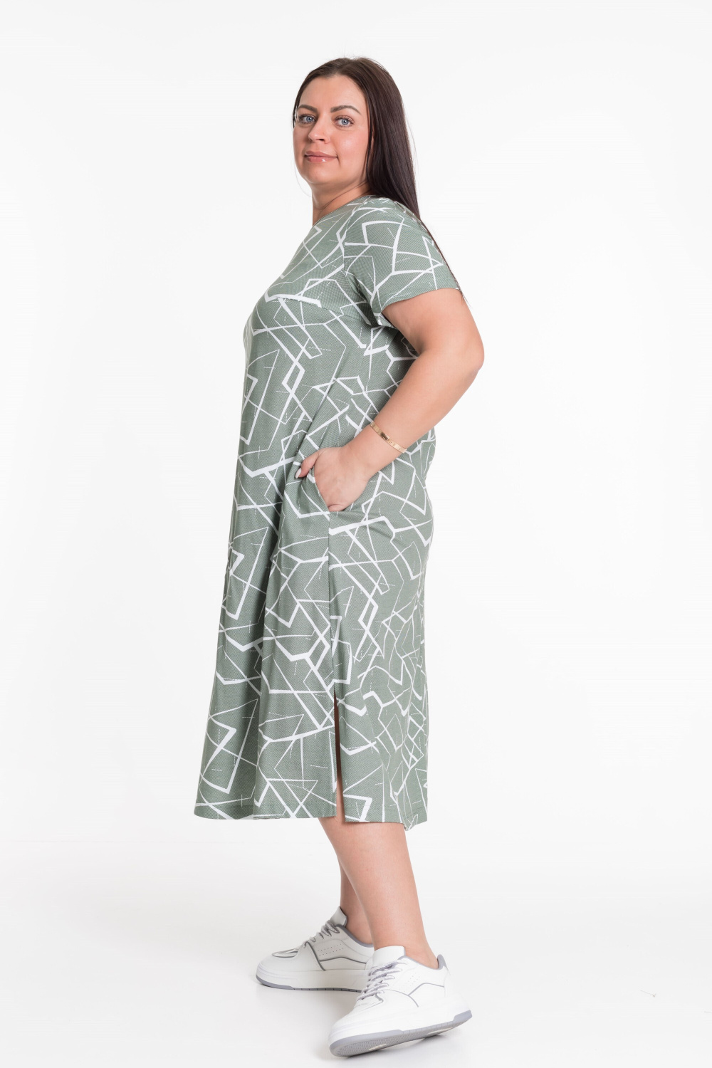 Платье из х/б полотна. По бокам разрезы, карманы в боковых швах, горловина обработана бейкой из основного полотна.