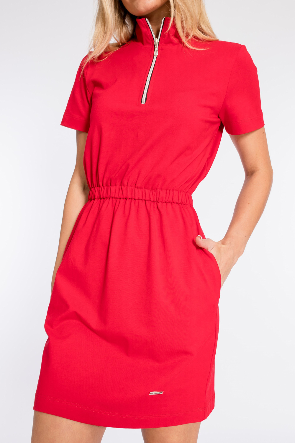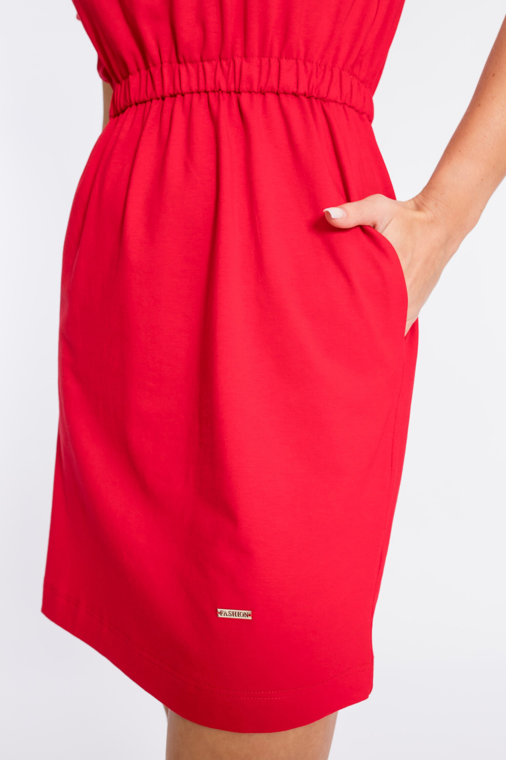 Платье выполнено из однотонной кулирки с лайкрой. С воротником-стойкой с застёжкой на молнию и коротким втачным рукавом. Платье с резинкой по линии талии, по бокам размещены карманы.