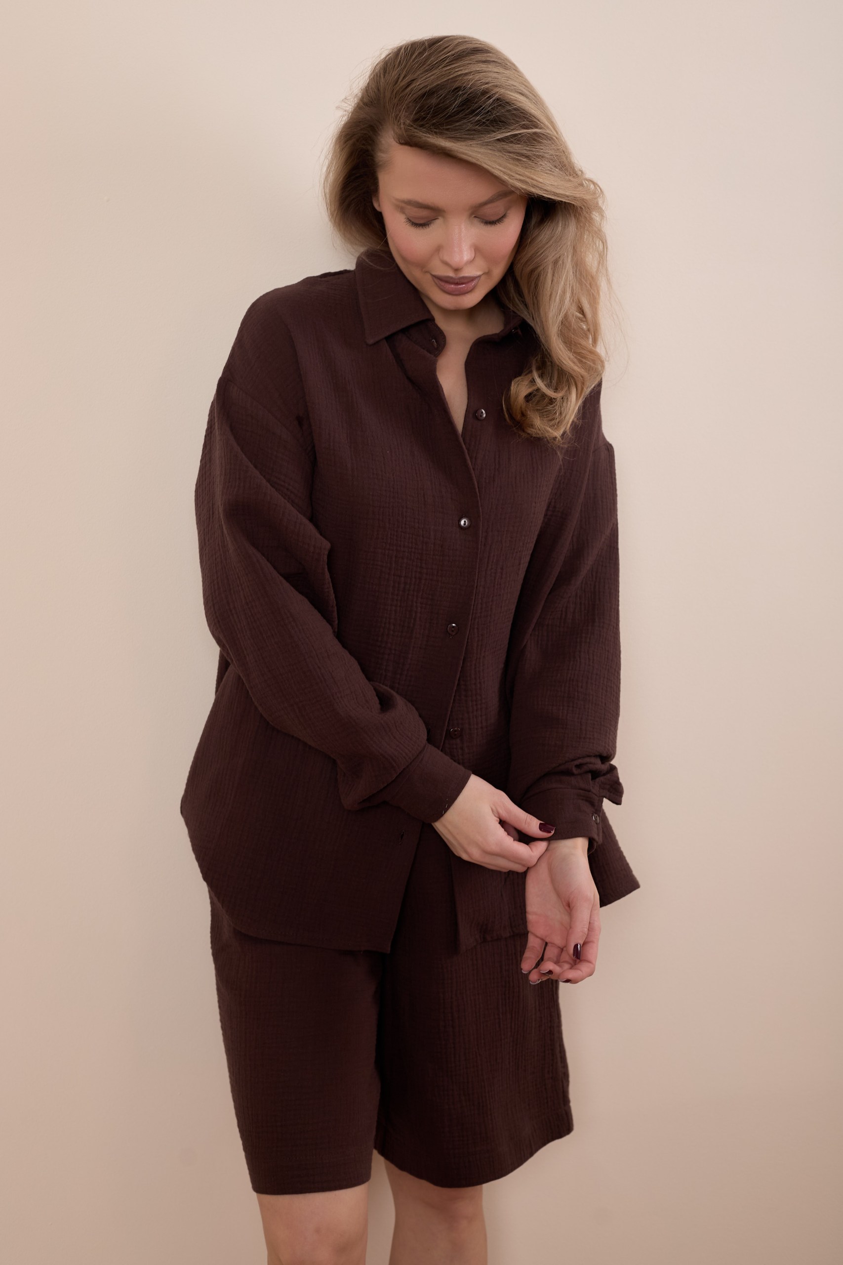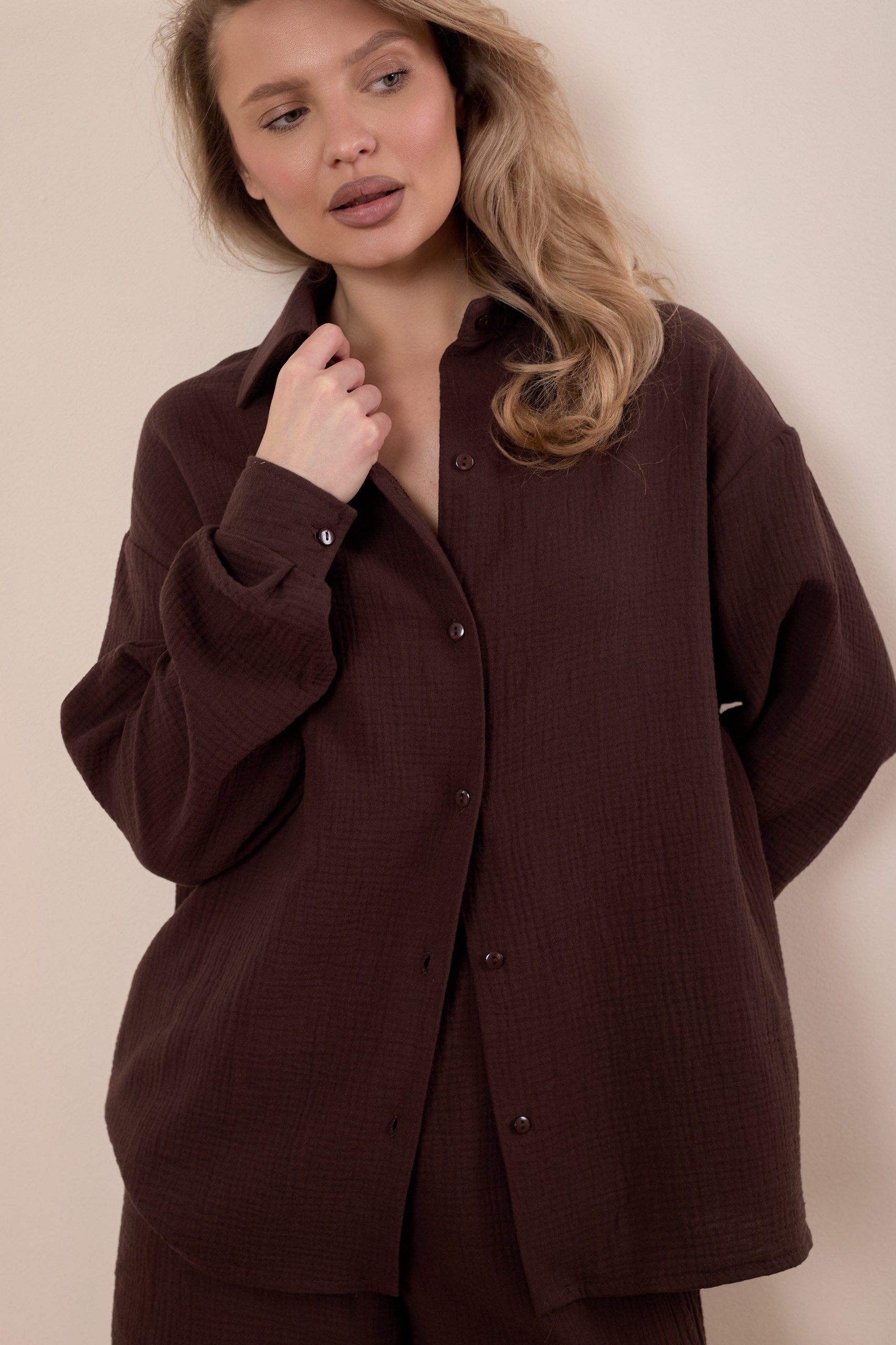 Женская рубашка — отличный выбор для повседневной носки. Она изготовлена из мягкого, лёгкого натурального материала — муслина. Рубашка имеет длинный спущенный рукав и застёжку на пуговицы. Воротник на отрезной стойке придаёт модели элегантность. В боковых швах есть небольшие разрезы, которые добавляют изюминку в дизайн. Такая однотонная рубашка идеально подойдёт для прогулок, отдыха или неформальных мероприятий. Она выполнена из качественного материала, который хорошо пропускает воздух и обеспечивает хорошую вентиляцию.