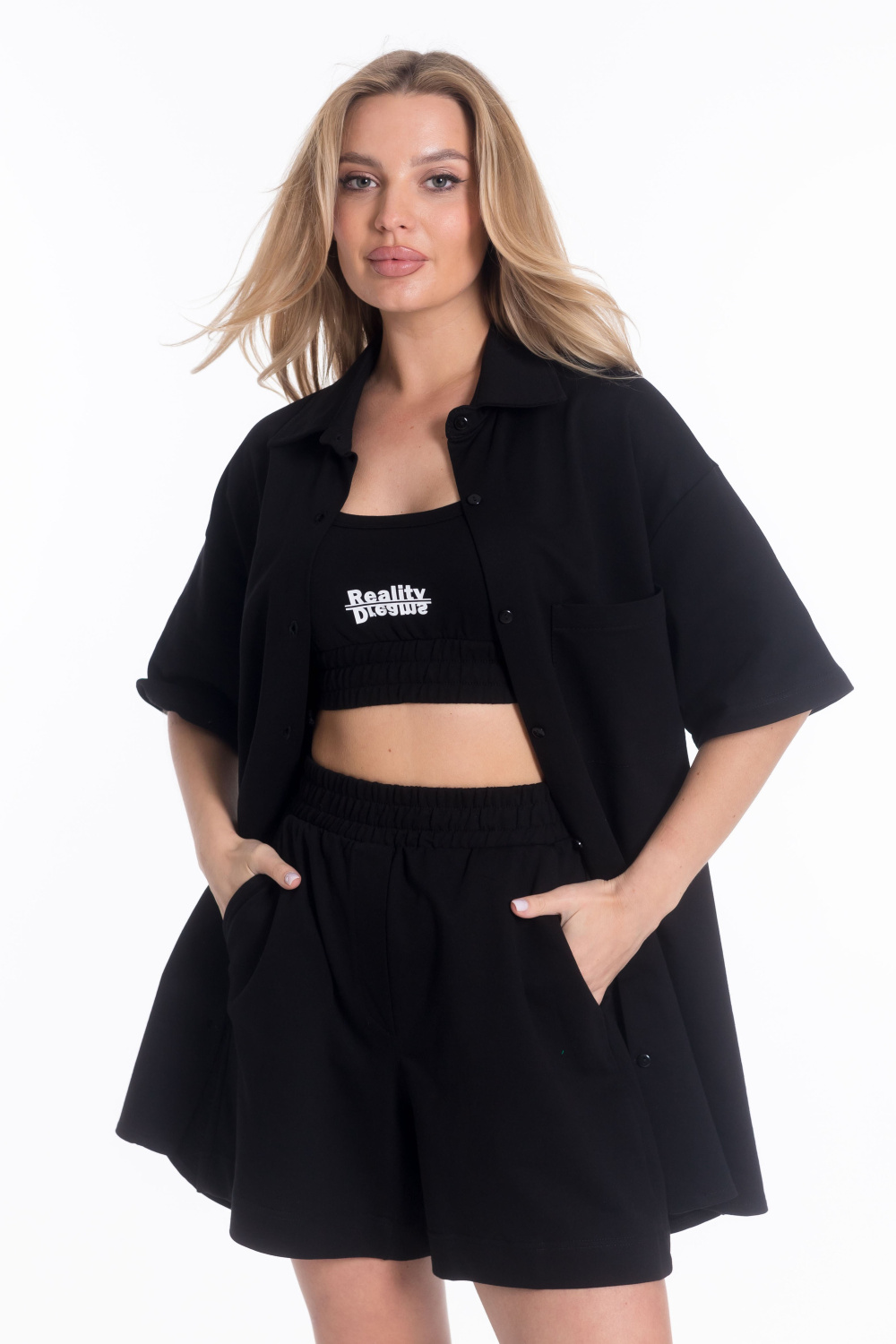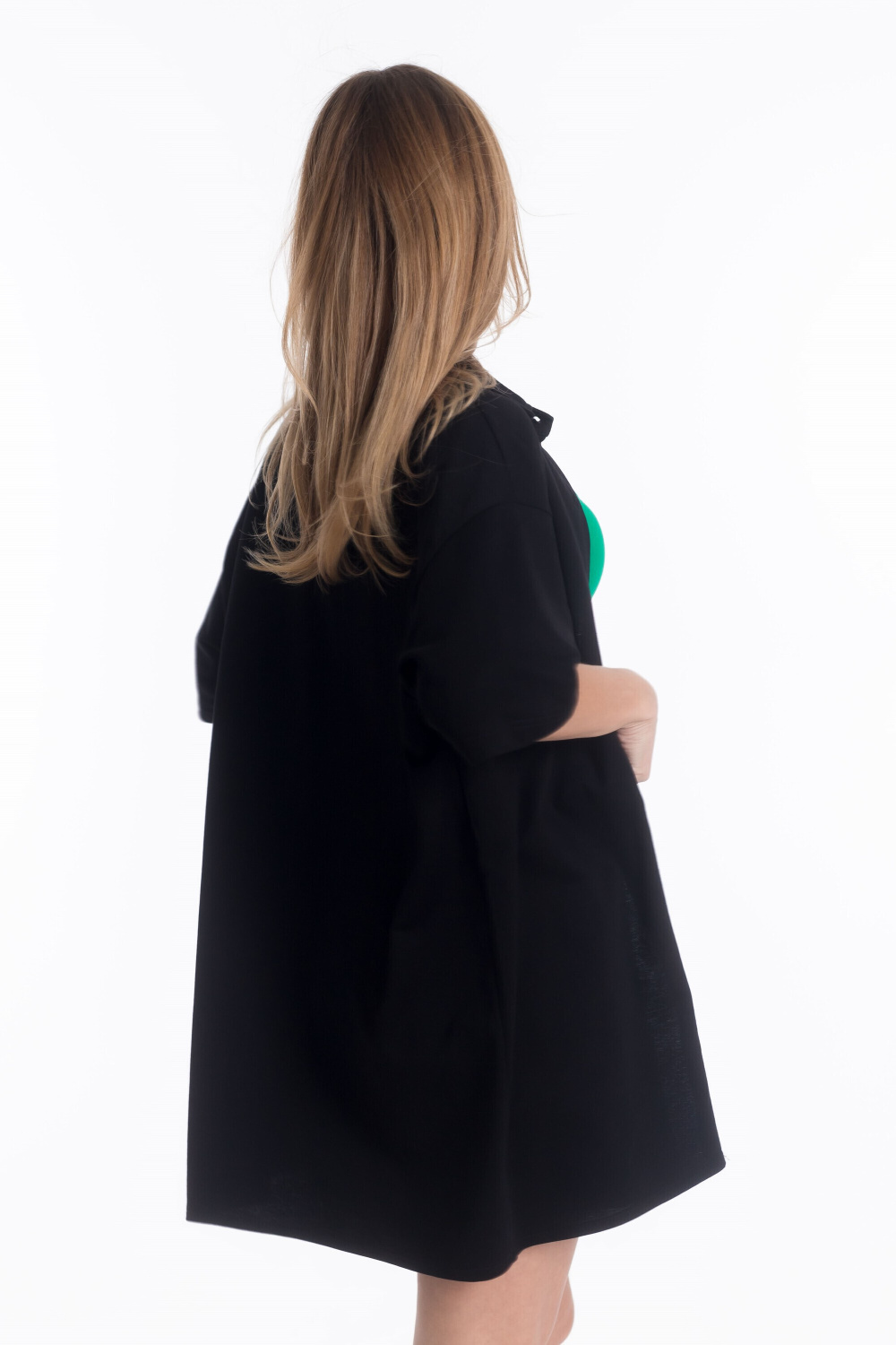 Рубашка из футера 2х нитки. Спущенная линия плеча, длина рукава до локтя, застежка на пуговицах, воротник на стойке, спереди карман.