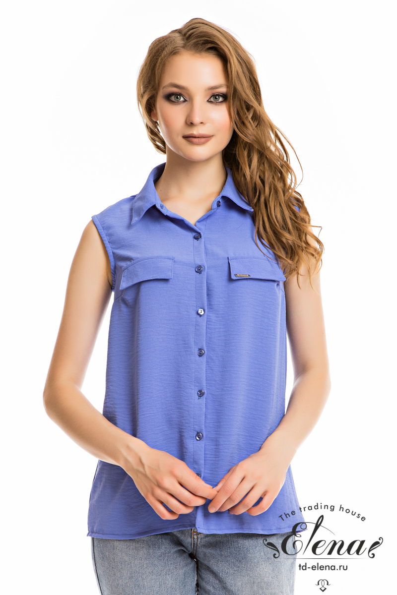 Рубашка из однотонного шёлкового крепа. Без рукавов, с застёжкой на пуговицы и воротником. На полочках нагрудные вытачки и декоративные клапаны.