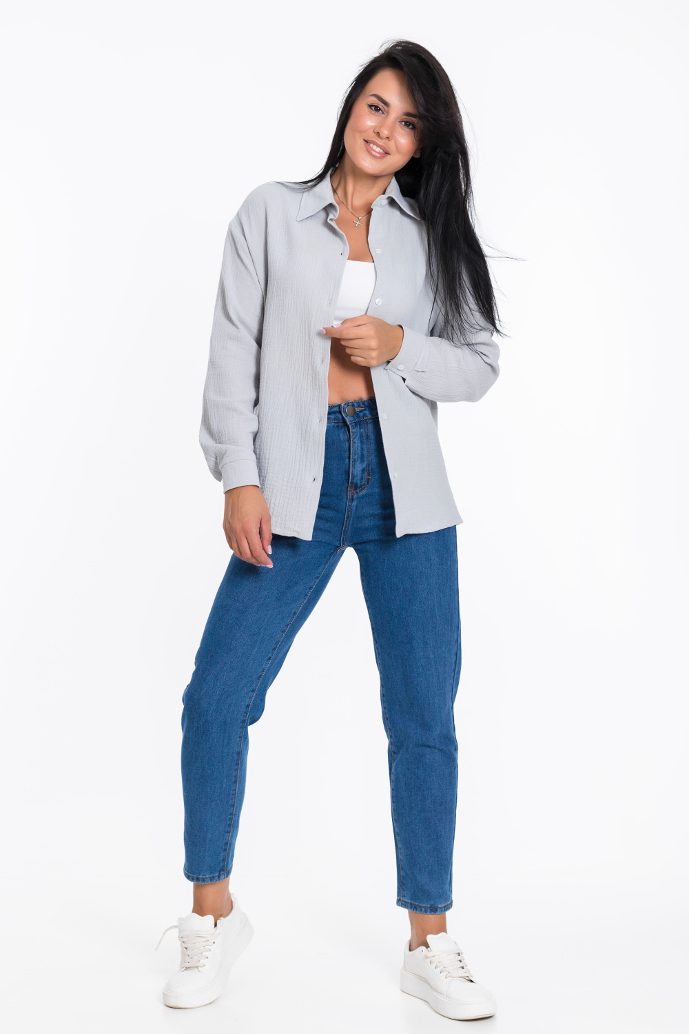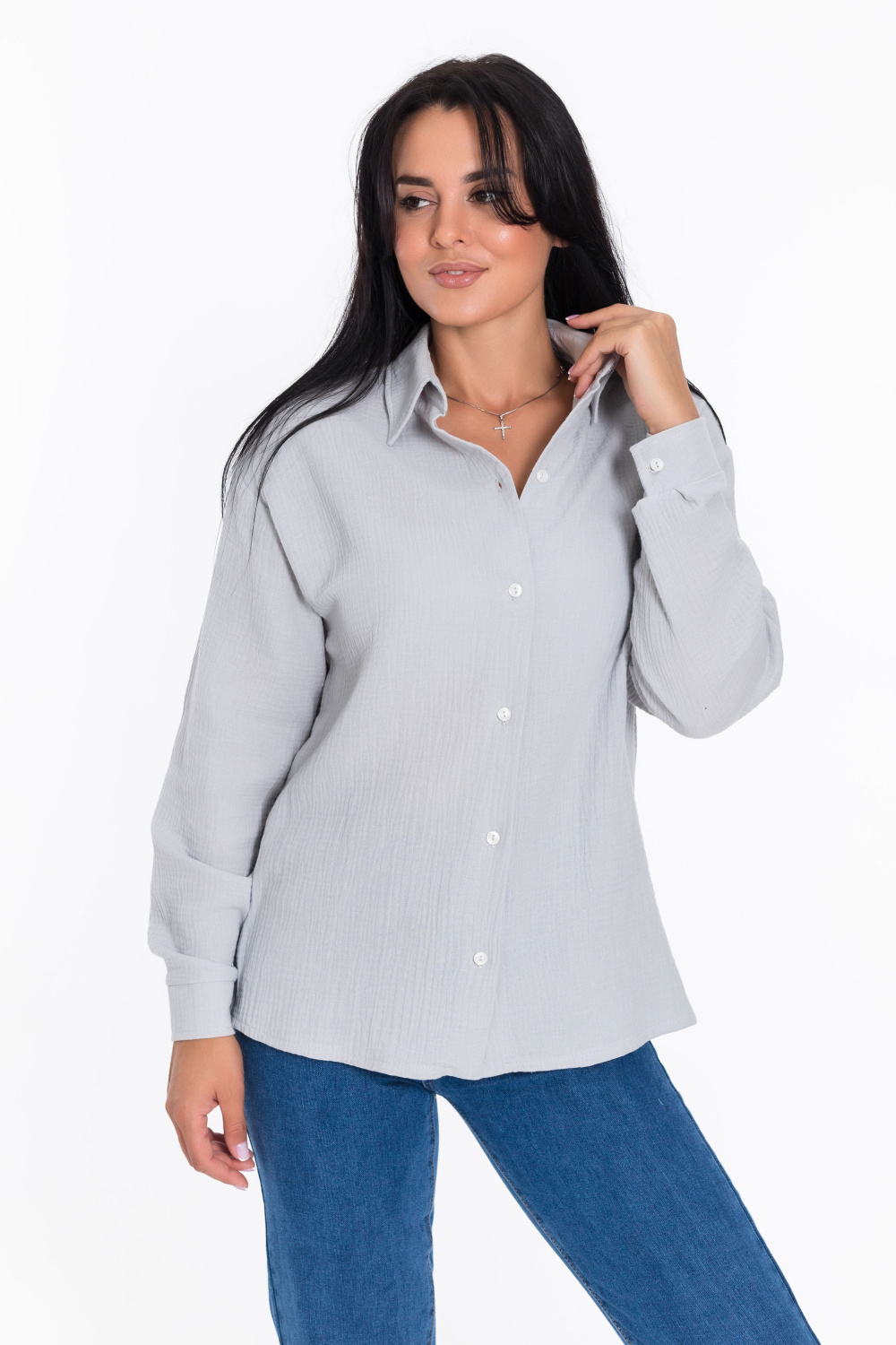 Женская рубашка — отличный выбор для повседневной носки. Она изготовлена из мягкого, лёгкого натурального материала — муслина. Рубашка имеет длинный спущенный рукав и застёжку на пуговицы. Воротник на отрезной стойке придаёт модели элегантность. В боковых швах есть небольшие разрезы, которые добавляют изюминку в дизайн. Такая однотонная рубашка идеально подойдёт для прогулок, отдыха или неформальных мероприятий. Она выполнена из качественного материала, который хорошо пропускает воздух и обеспечивает хорошую вентиляцию.